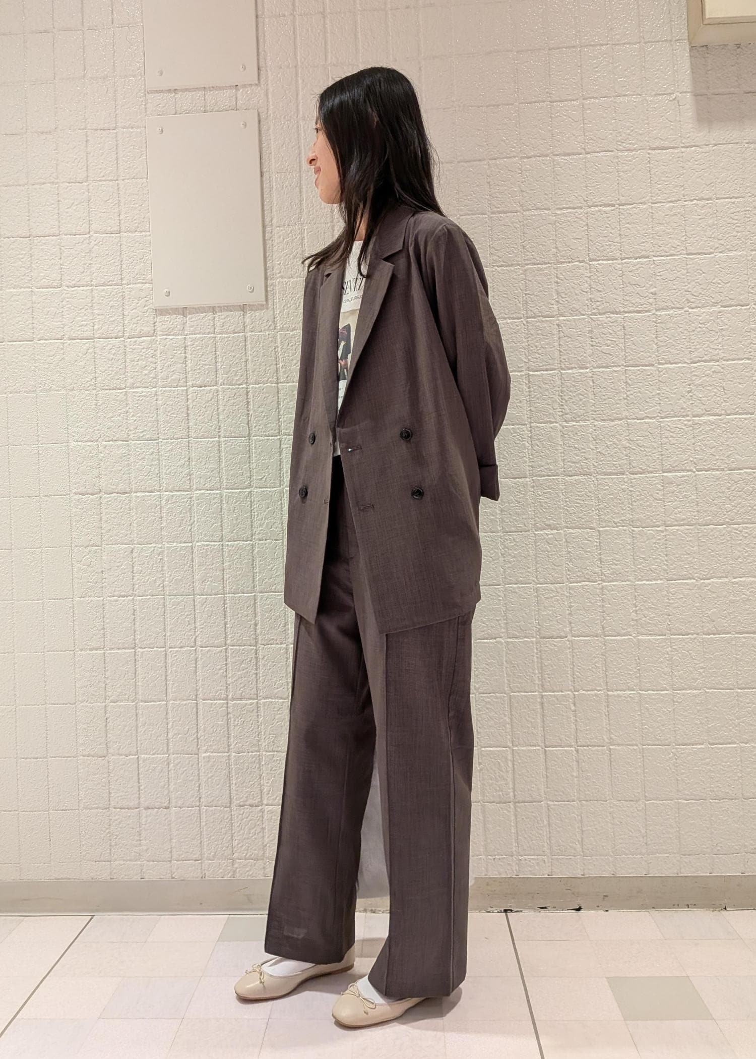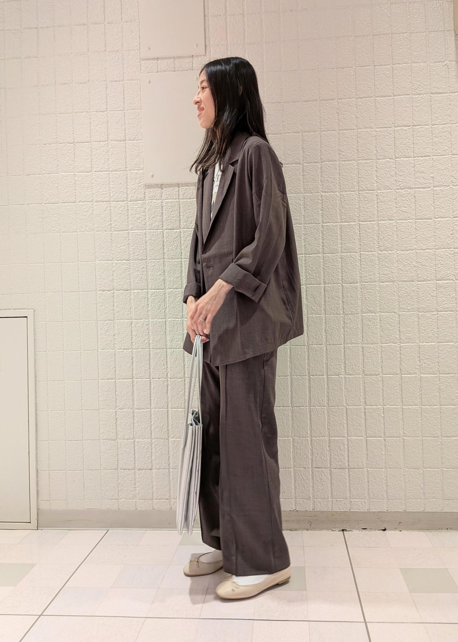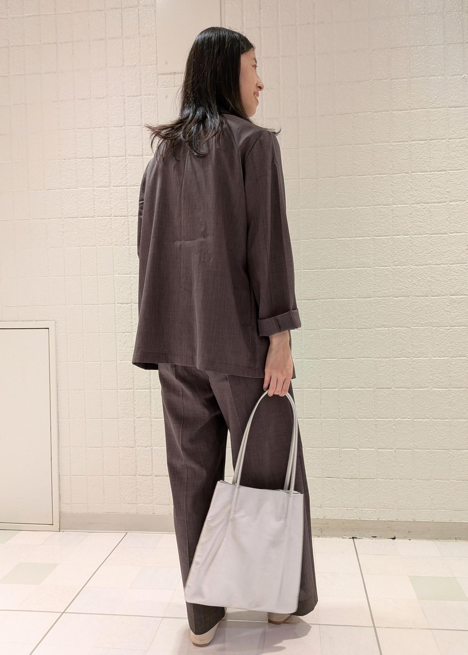 ラフに羽織りやすい薄手のジャケットと同じシリーズのパンツを合わせてセットアップのコーデに。