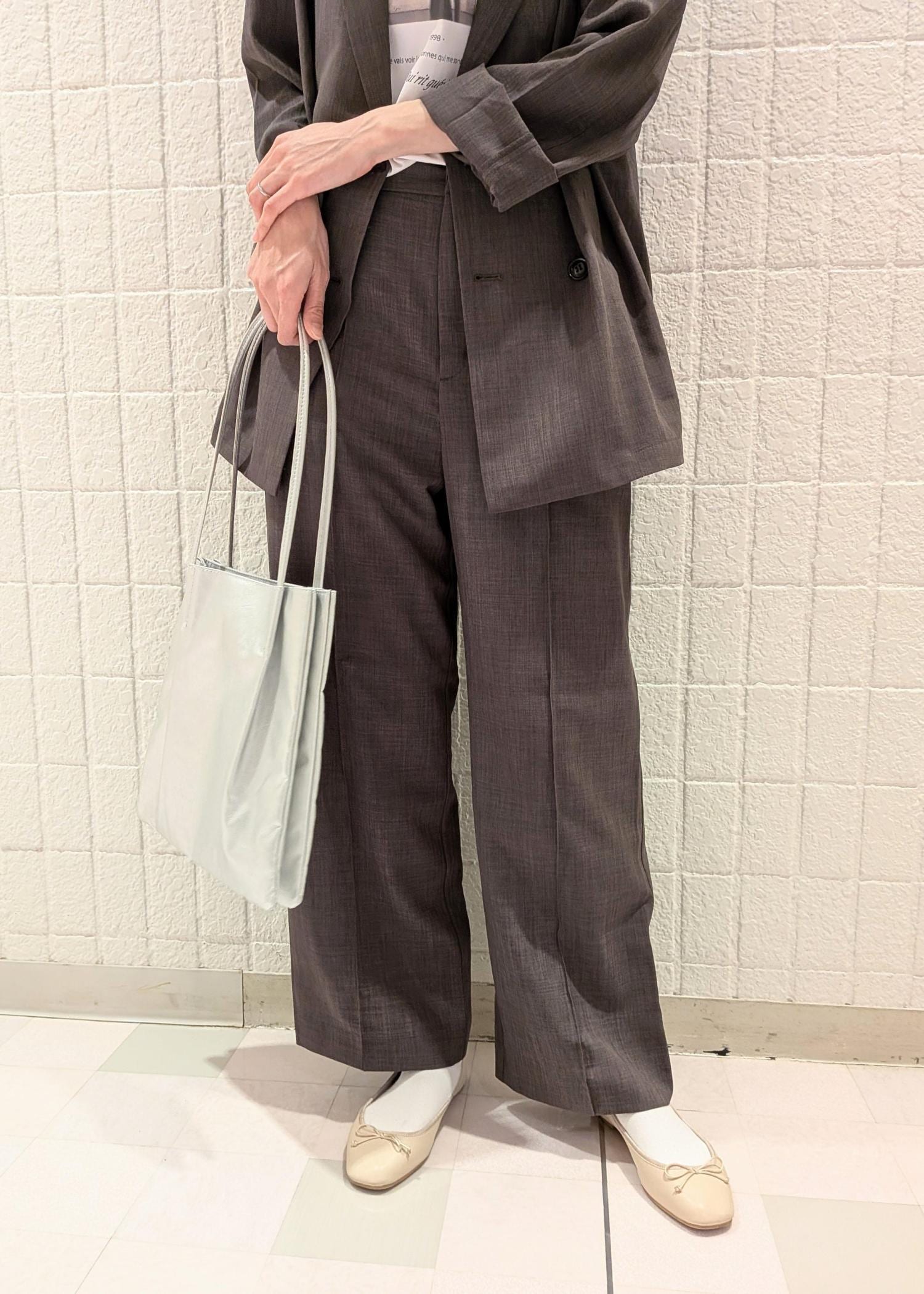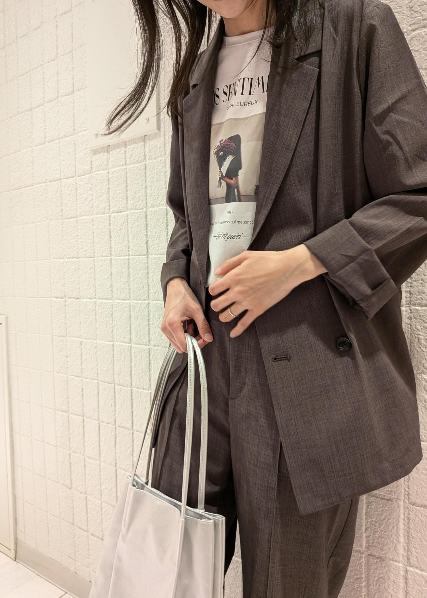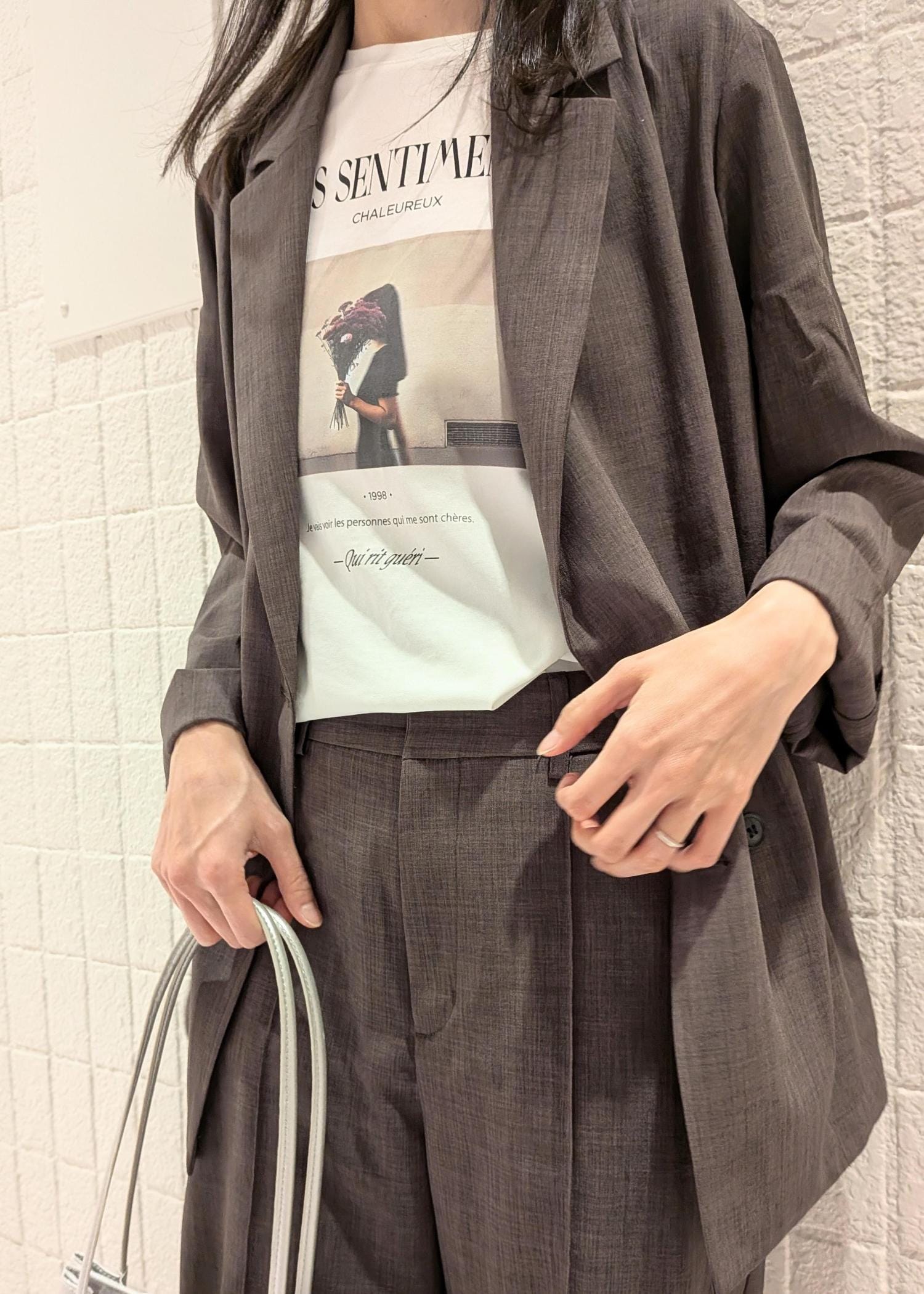 ラフに羽織りやすい薄手のジャケットと同じシリーズのパンツを合わせてセットアップのコーデに。