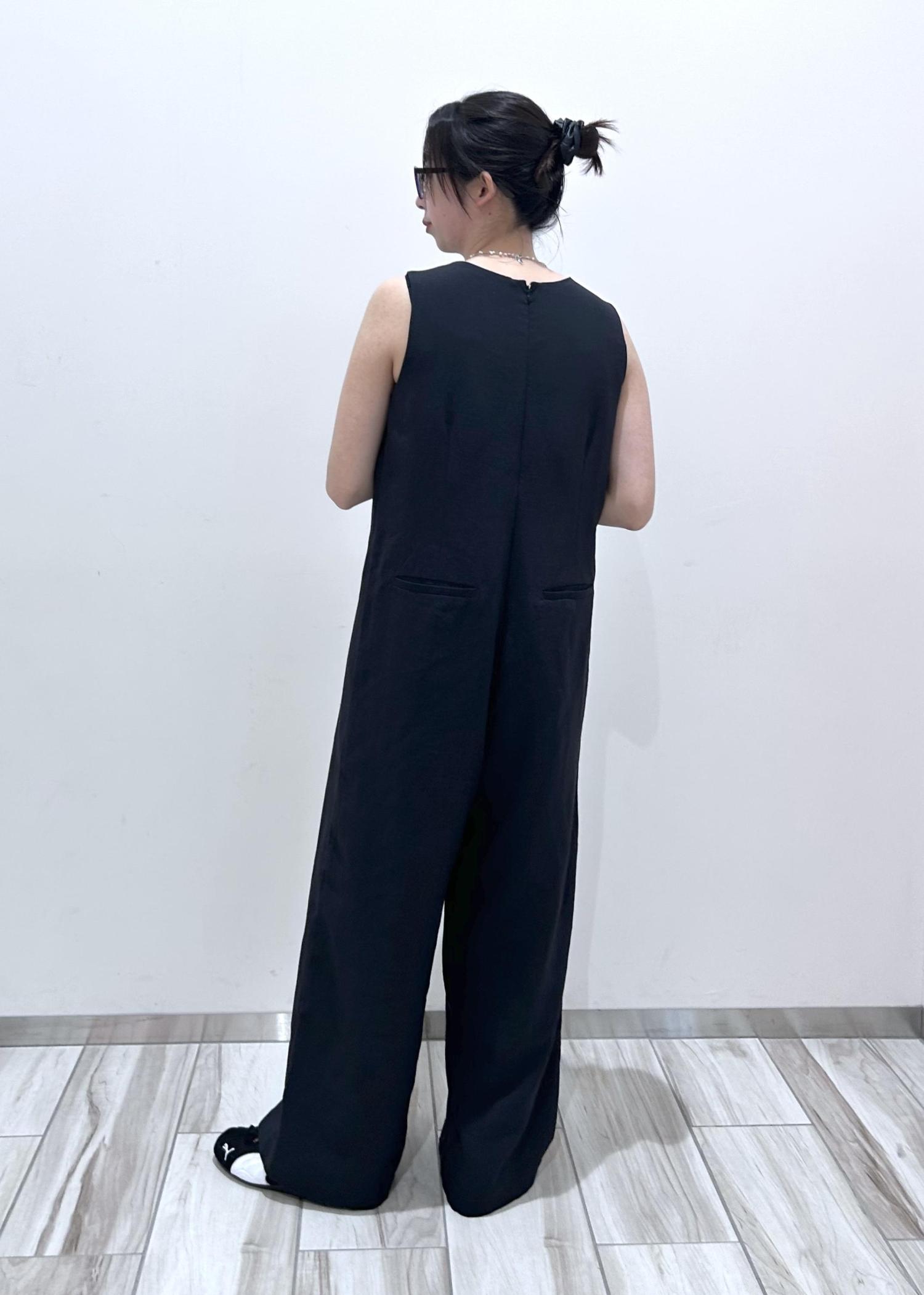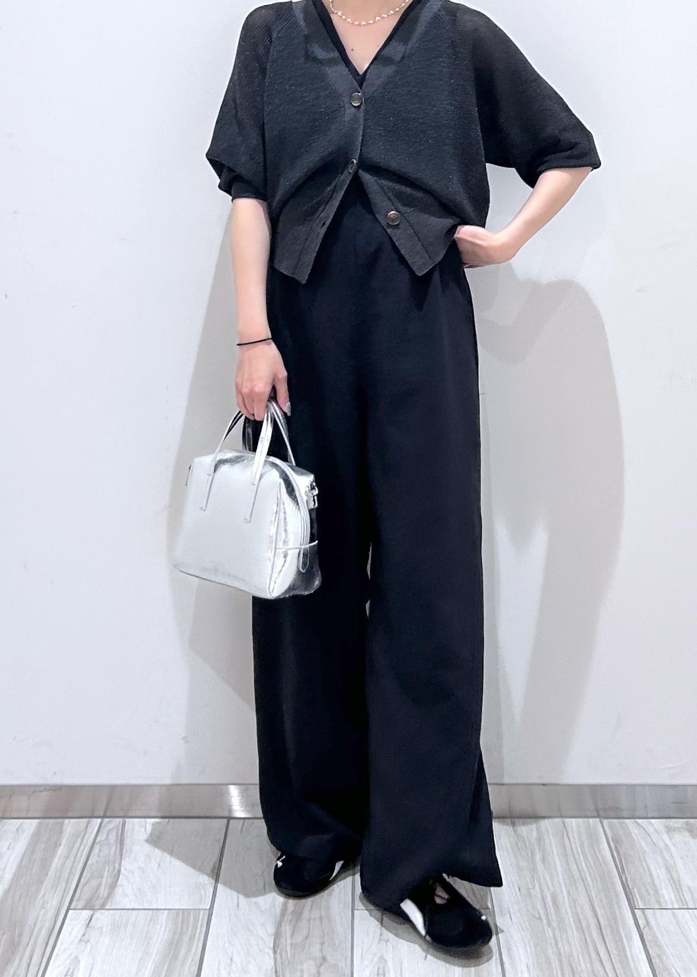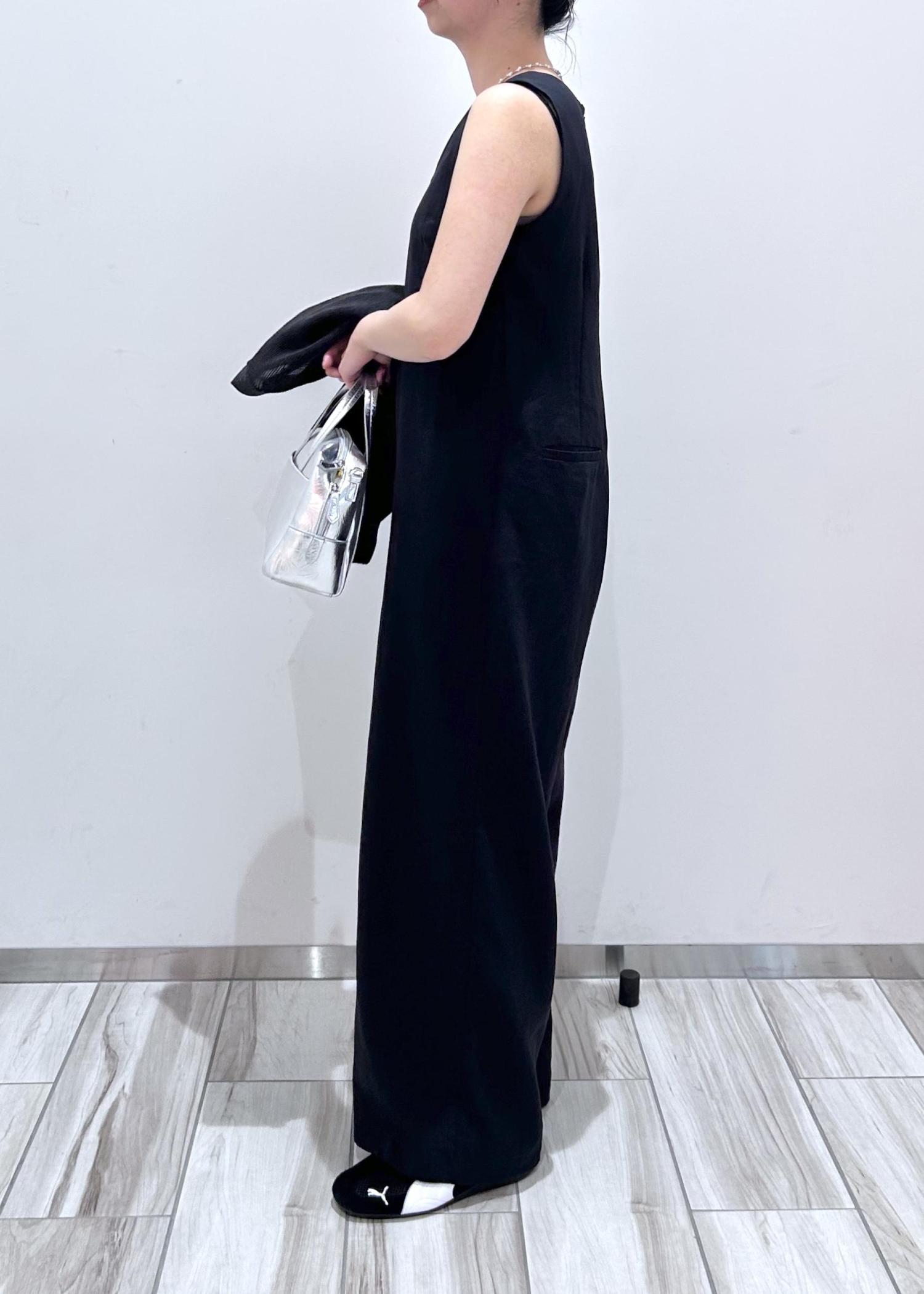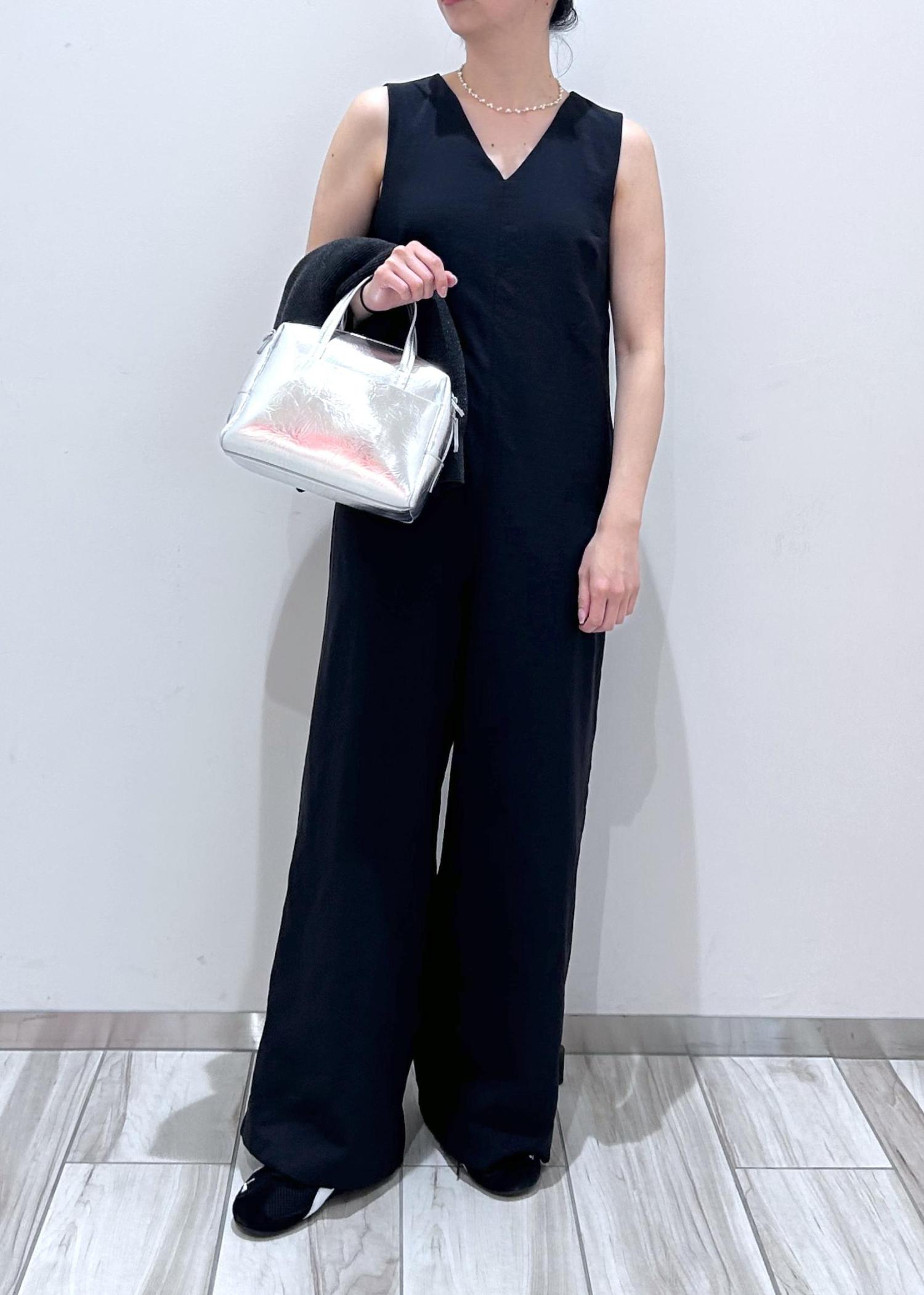 ブラックのオールインワンに、チャコールのカーディガンを羽織った落ち着きのあるワントーンコーデ。