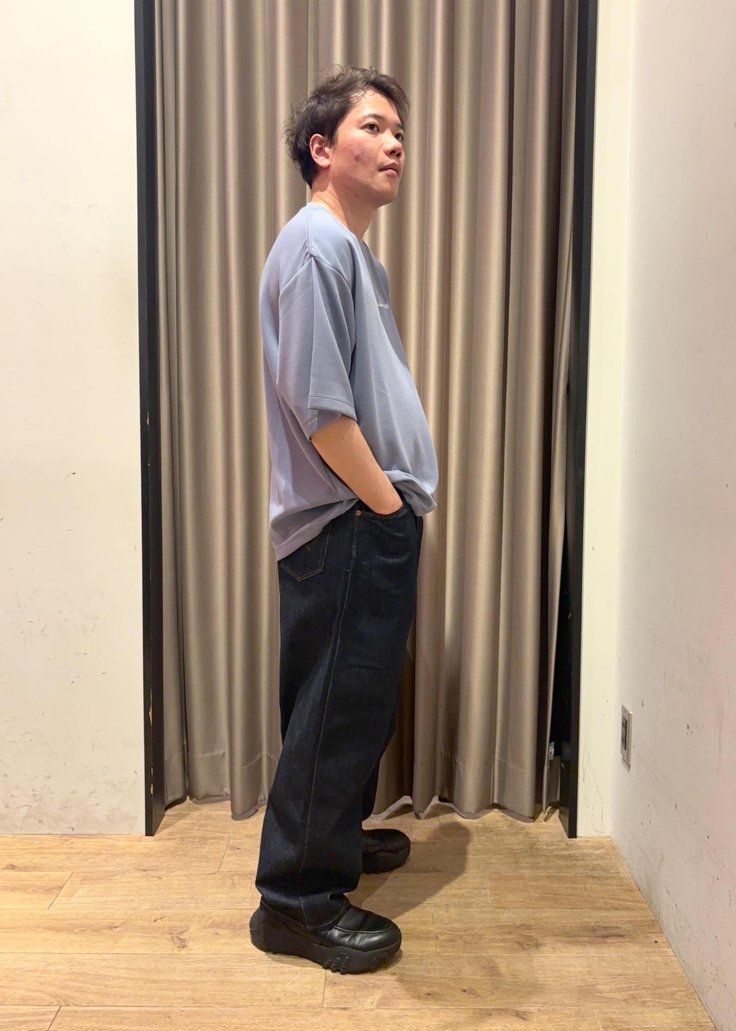 トレンド性の強いデザインで、深めの股上とワイドな腿廻りが特徴のカーブパンツシルエットのデニム。