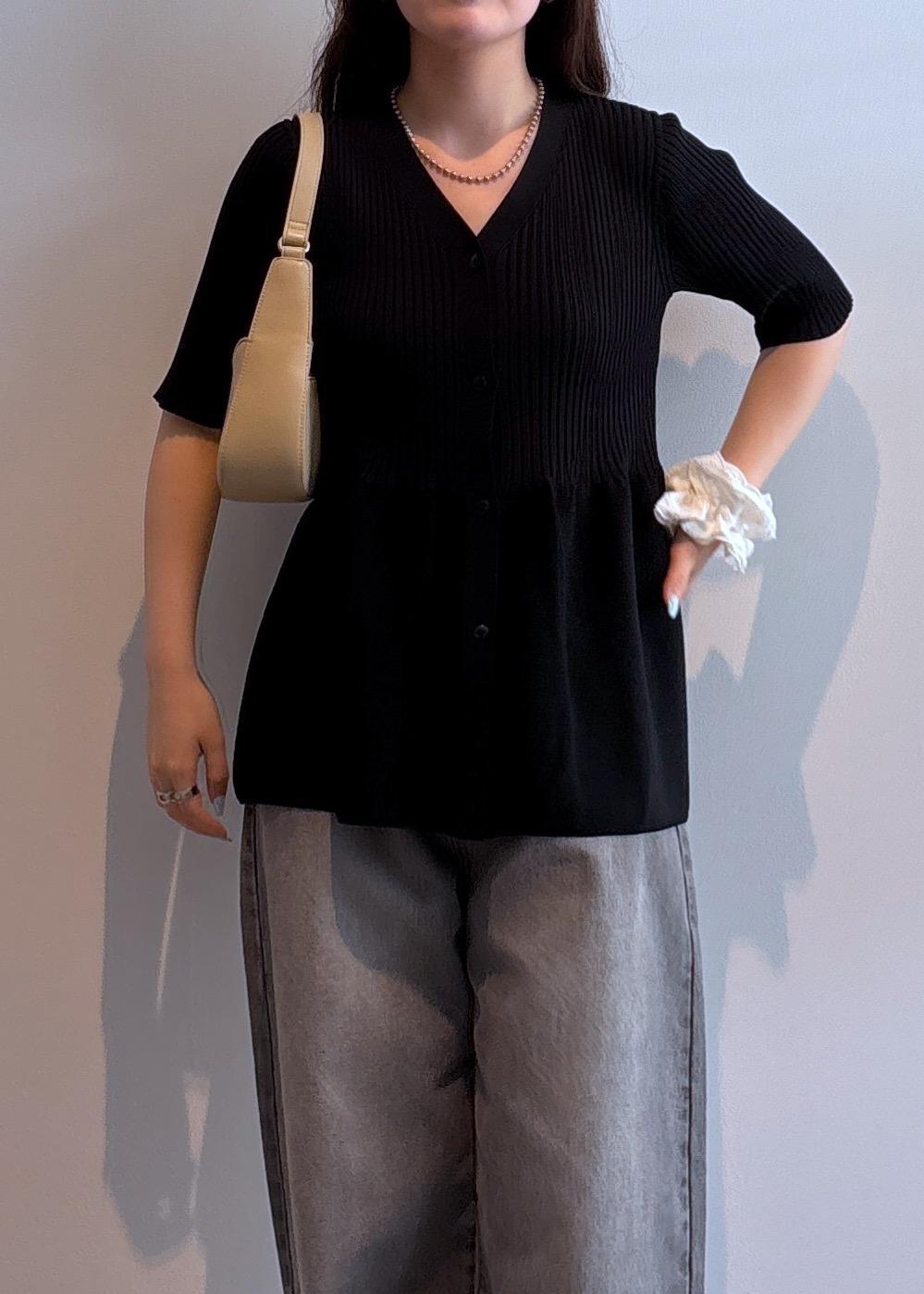 シルエットが綺麗なペプラムカーデでシンプルなモノトーンコーデ。ブラックがメインなので重たい印象にならないよう足元で抜け感をつくりました。