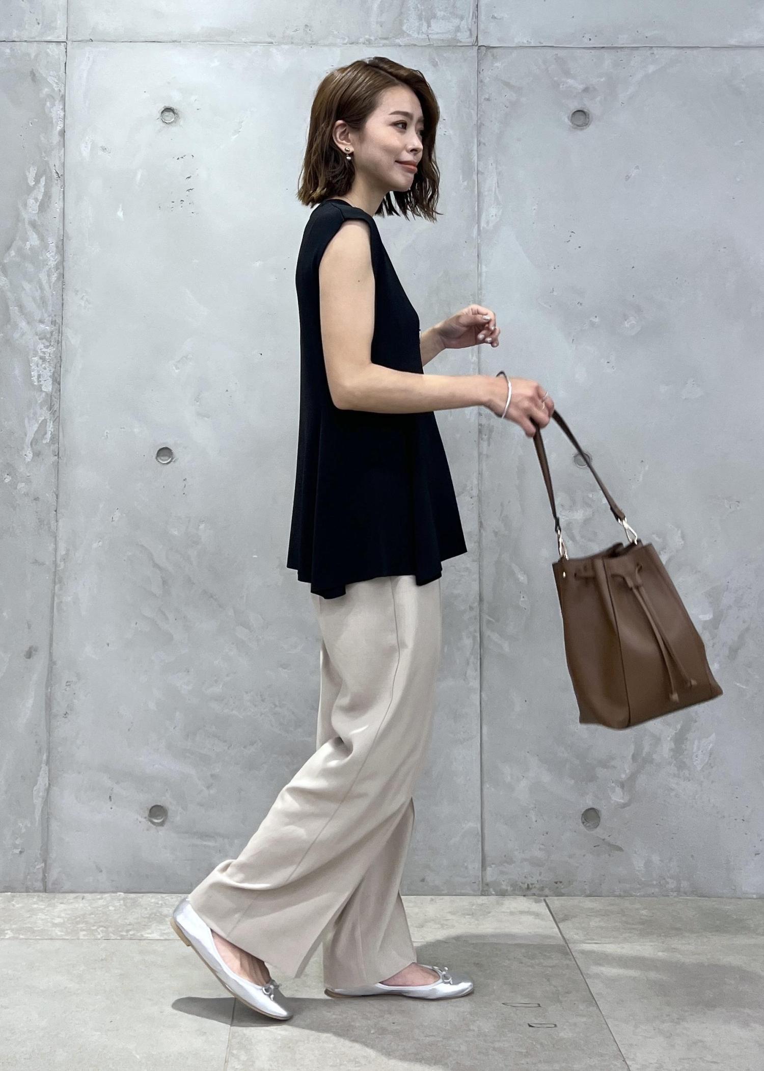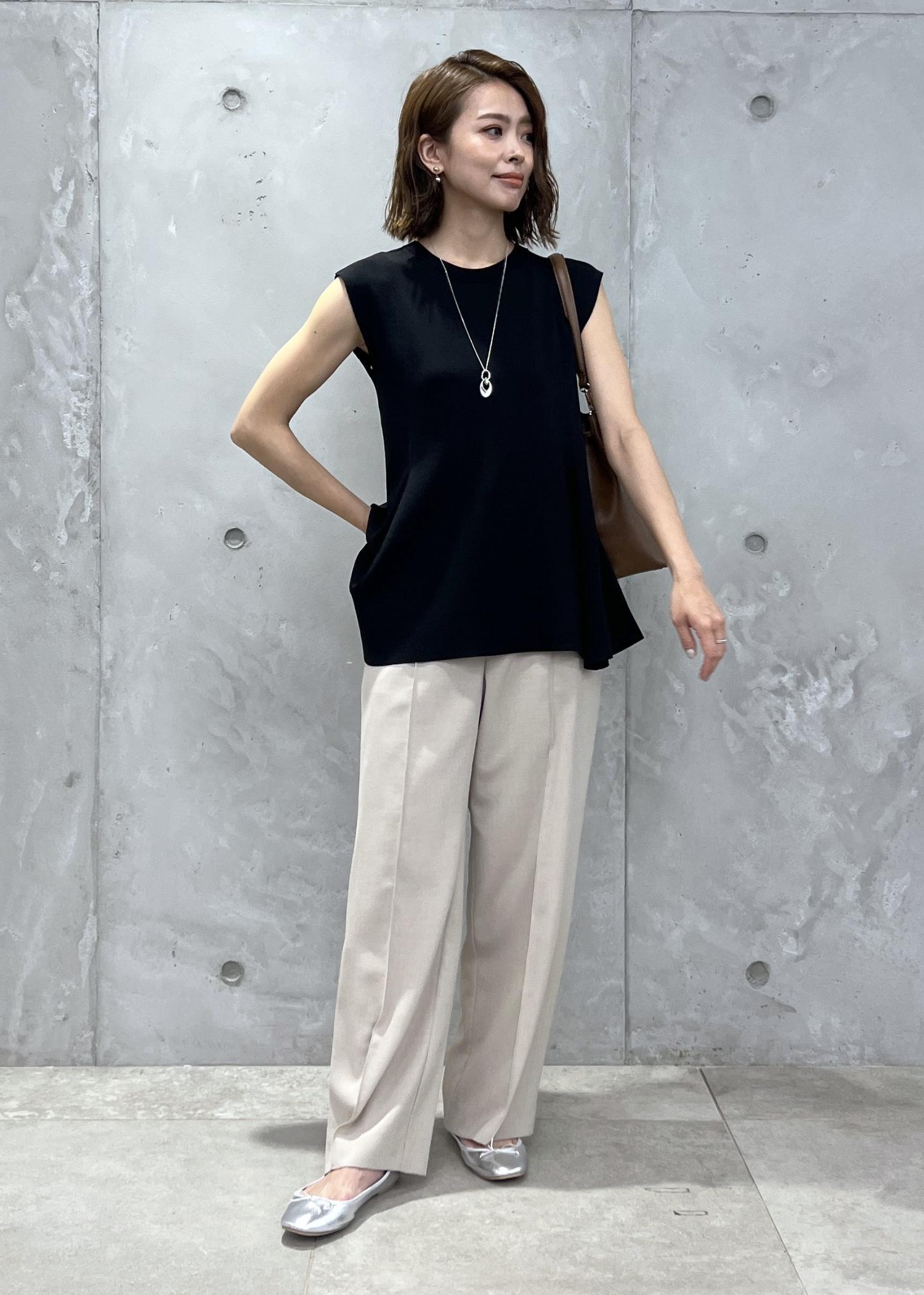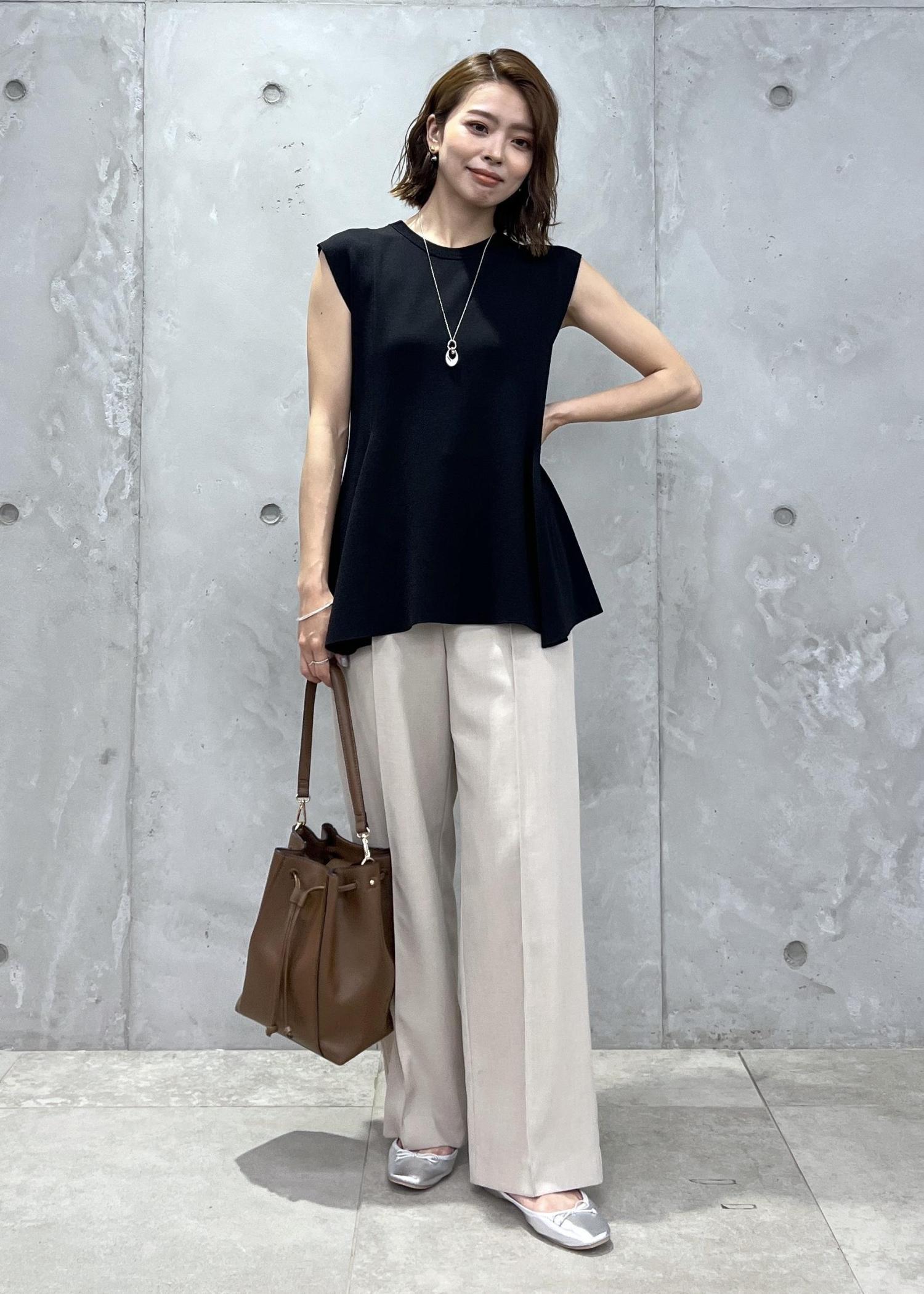 甘さ控えめに着られるブラックには、重たく見えないベージュのパンツを合わせました。