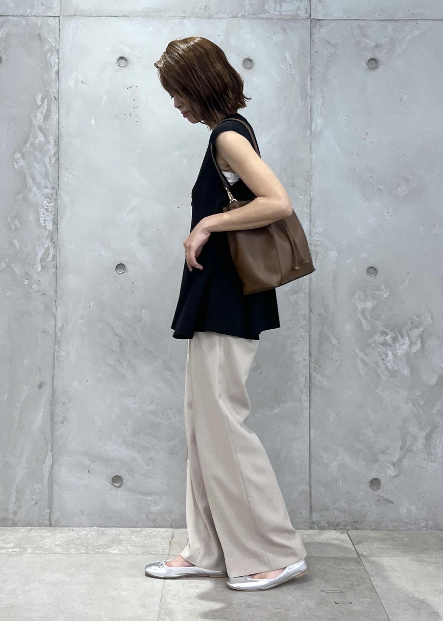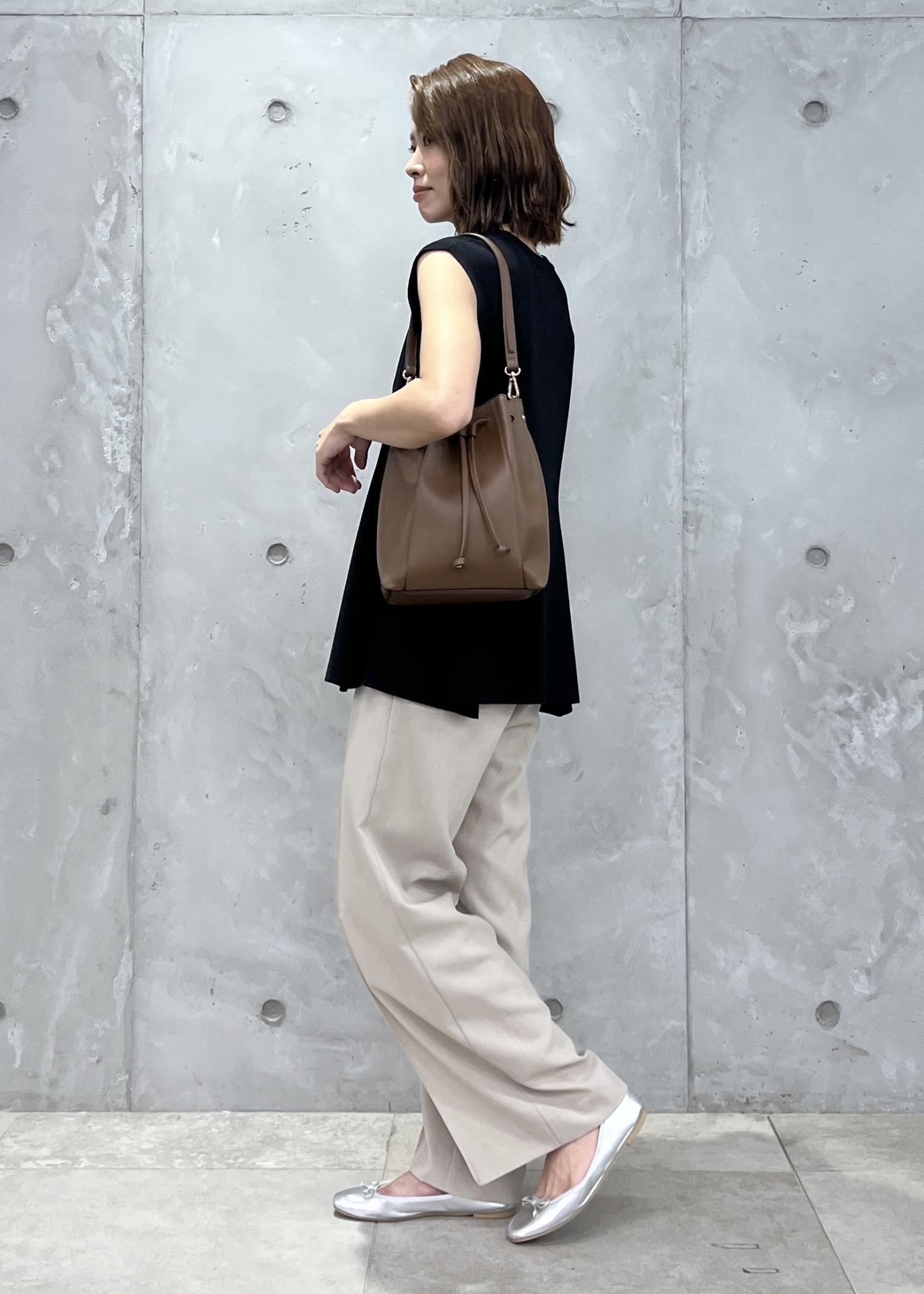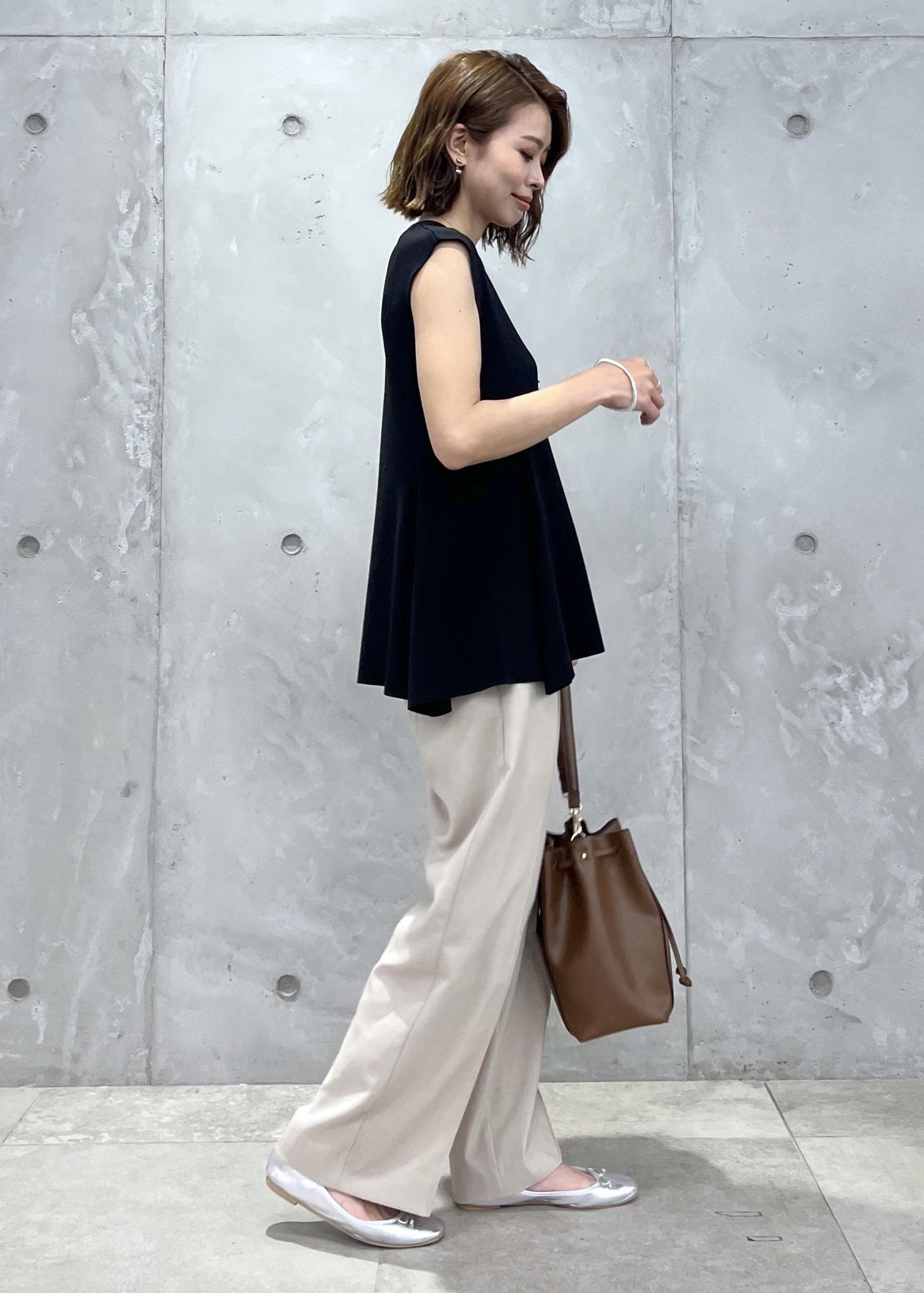 甘さ控えめに着られるブラックには、重たく見えないベージュのパンツを合わせました。