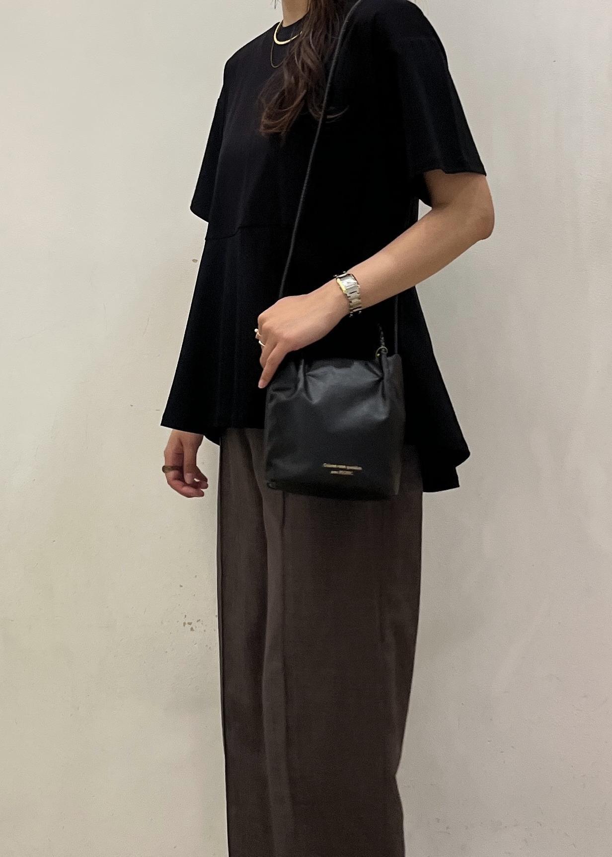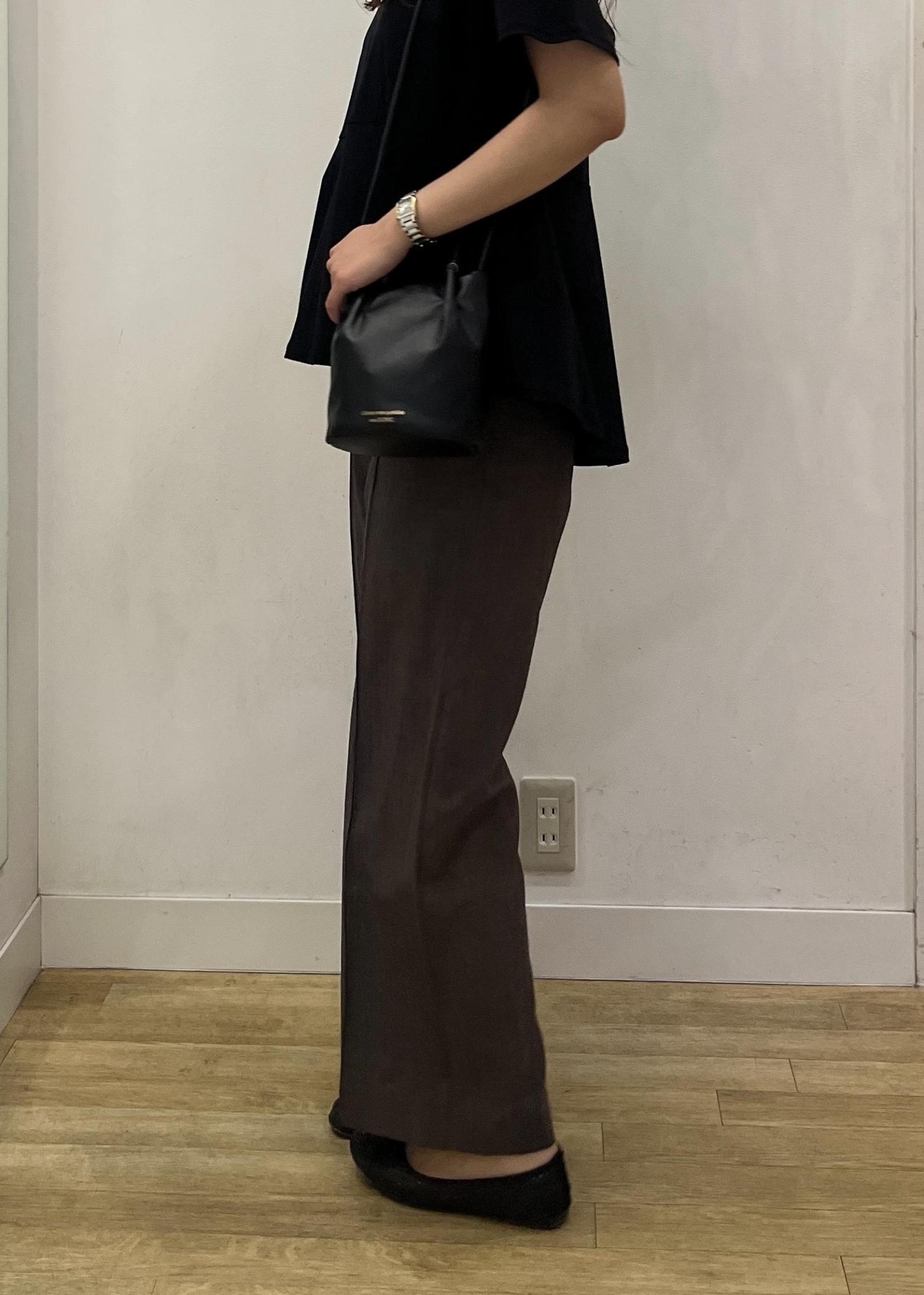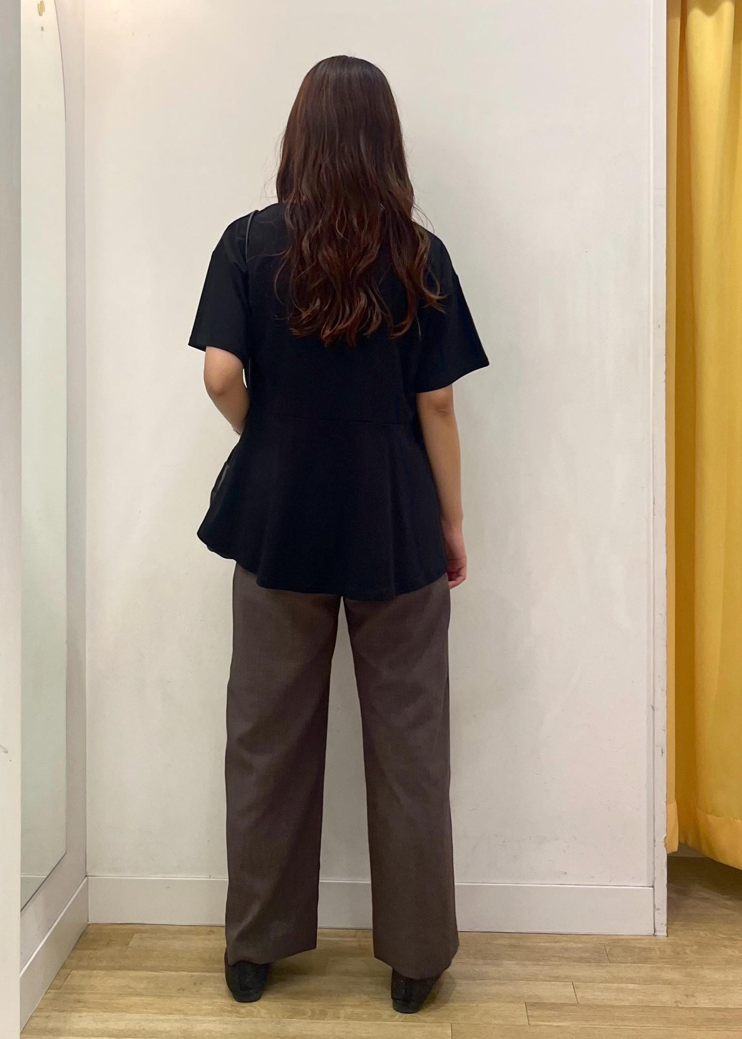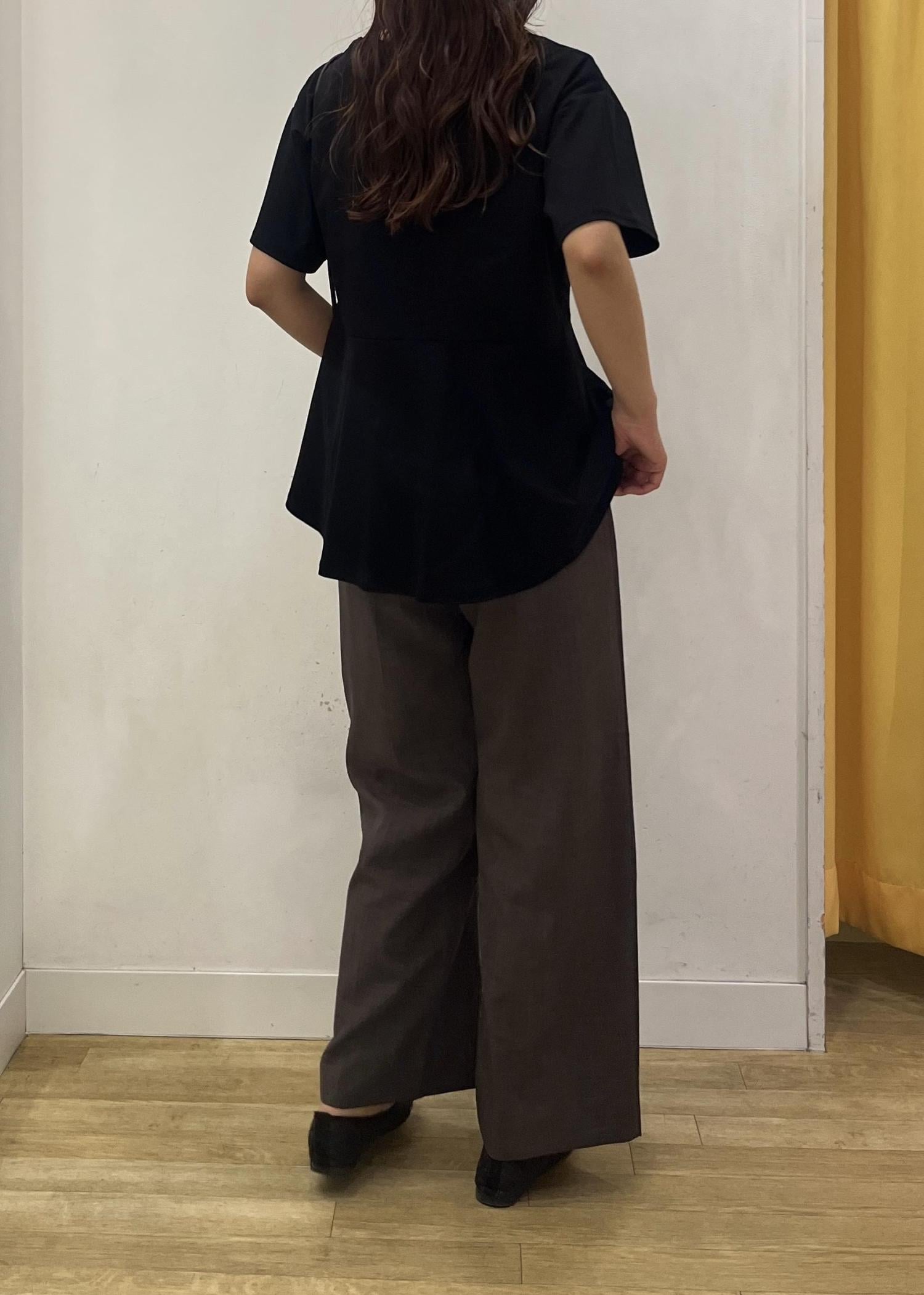 ブラックのペプラムトップスにブラウンのワイドパンツを合わせたカジュアルコーデ✨落ち着いたカラーでまとめた大人カジュアルなスタイリングです♪