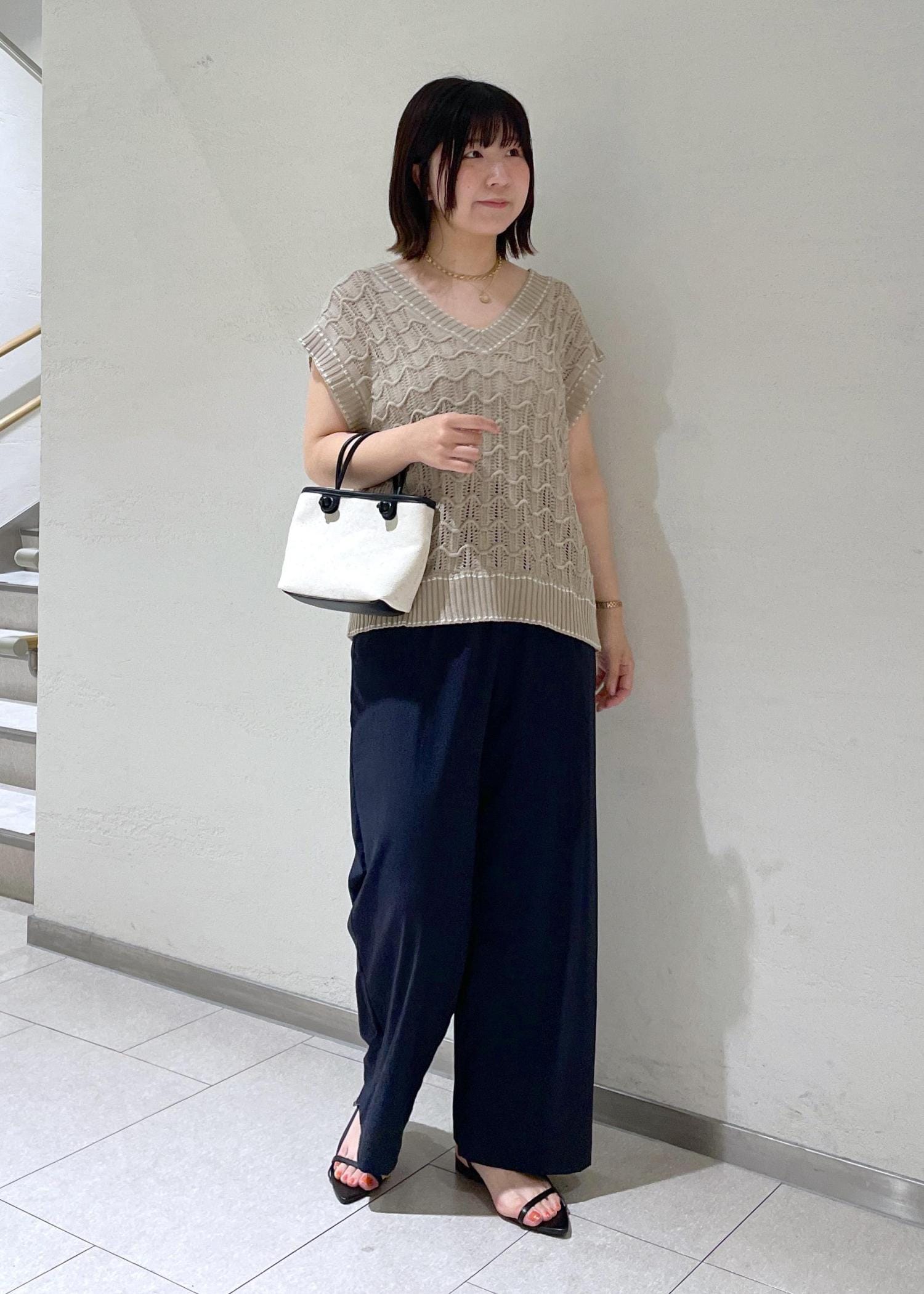 ニットベスト×イージーワイドパンツ