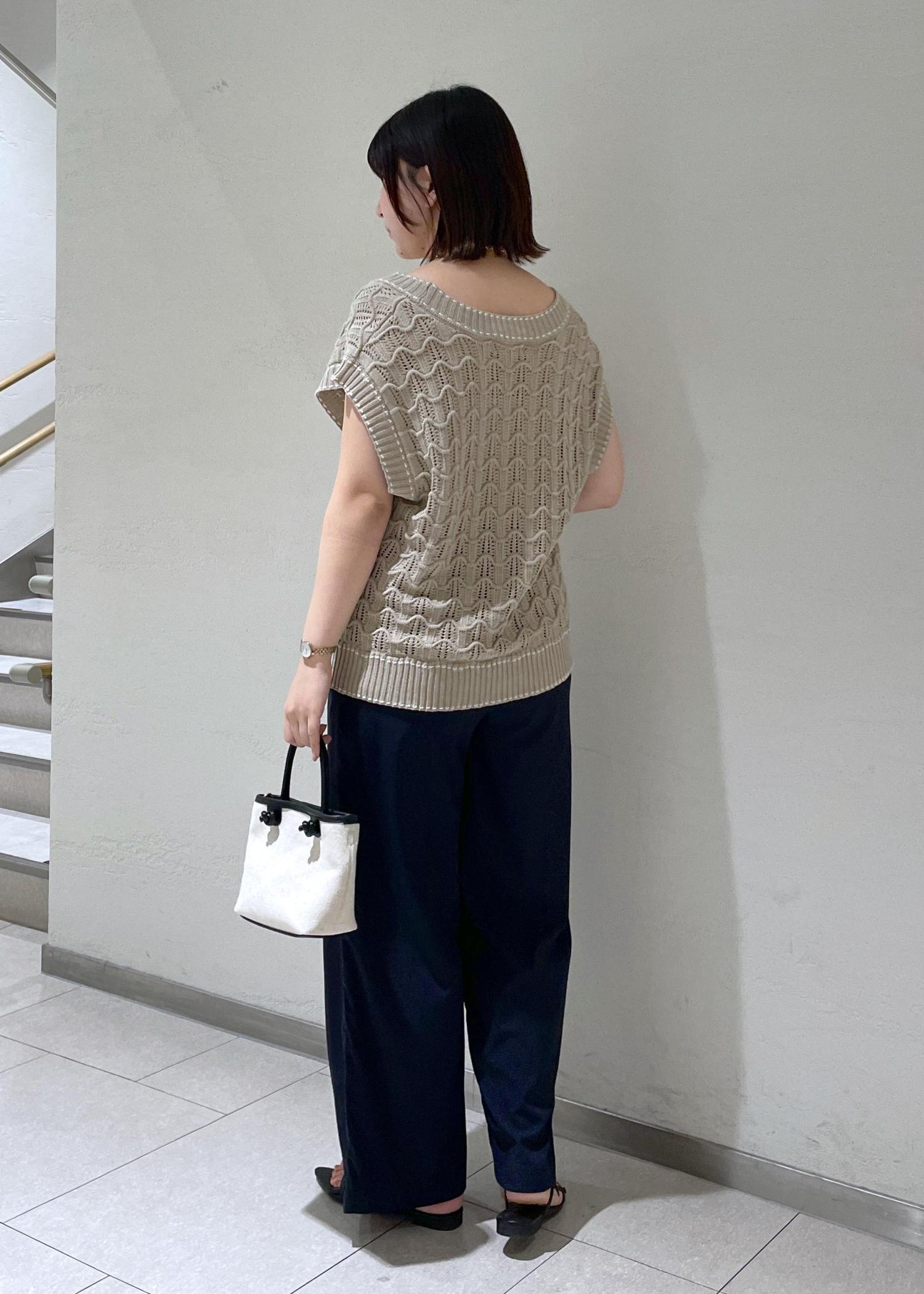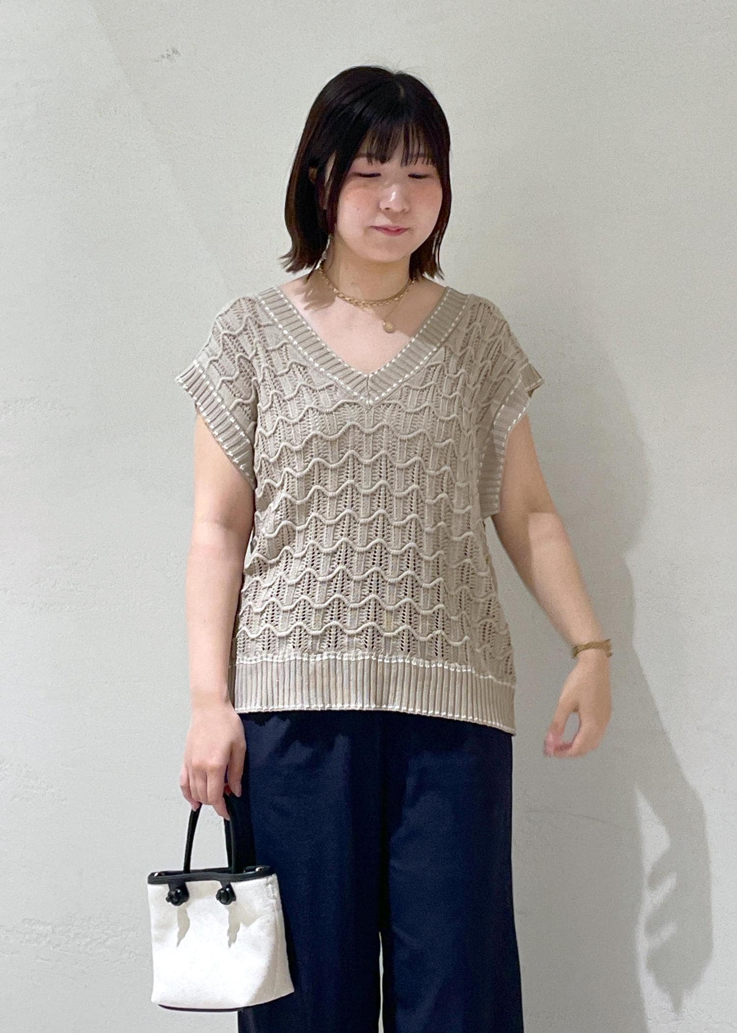ニットベストは入荷前から気になってたのですが、実際に着てみると着丈感も長すぎなくて綺麗に体型カバーしてくれるので、お気に入りのイージーワイドパンツで合わせて楽ちんコーデにしました!