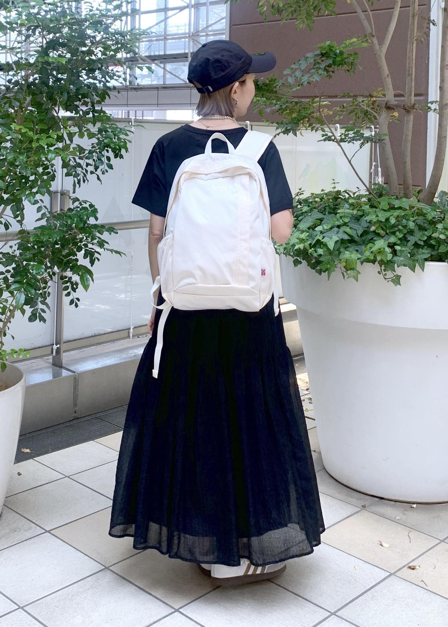 ブラックの中のリュック、スニーカーにホワイトがポイントのオールブラックスタイリング。