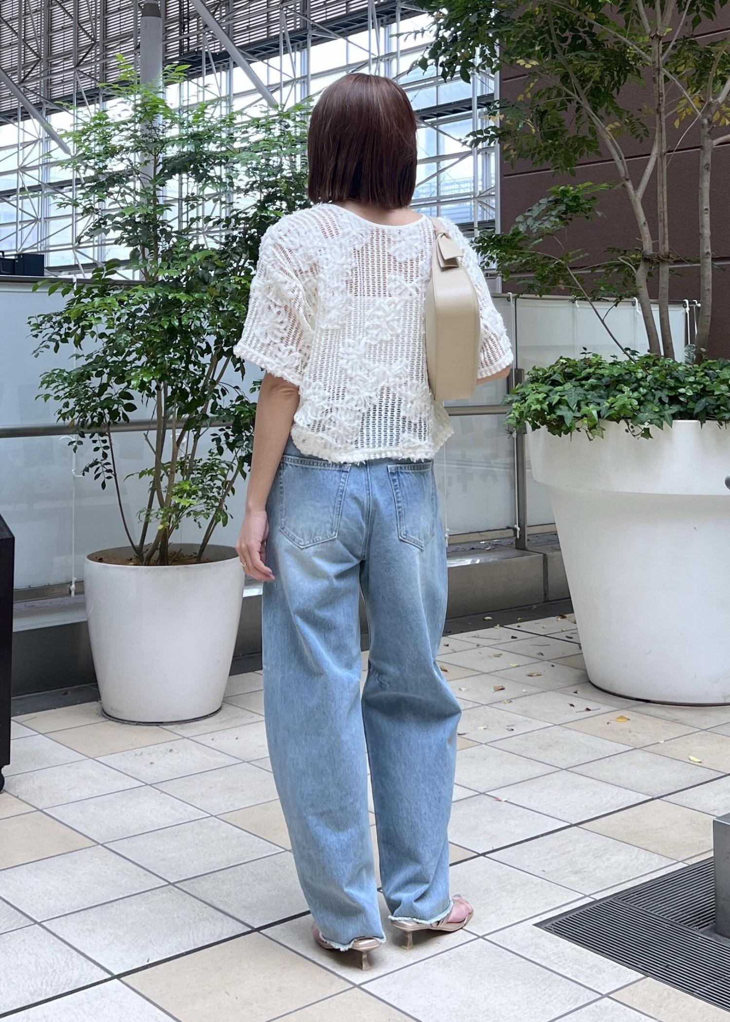 涼しげな透け感のあるレーストップスは、デニムを合わせて大人の夏コーデに。