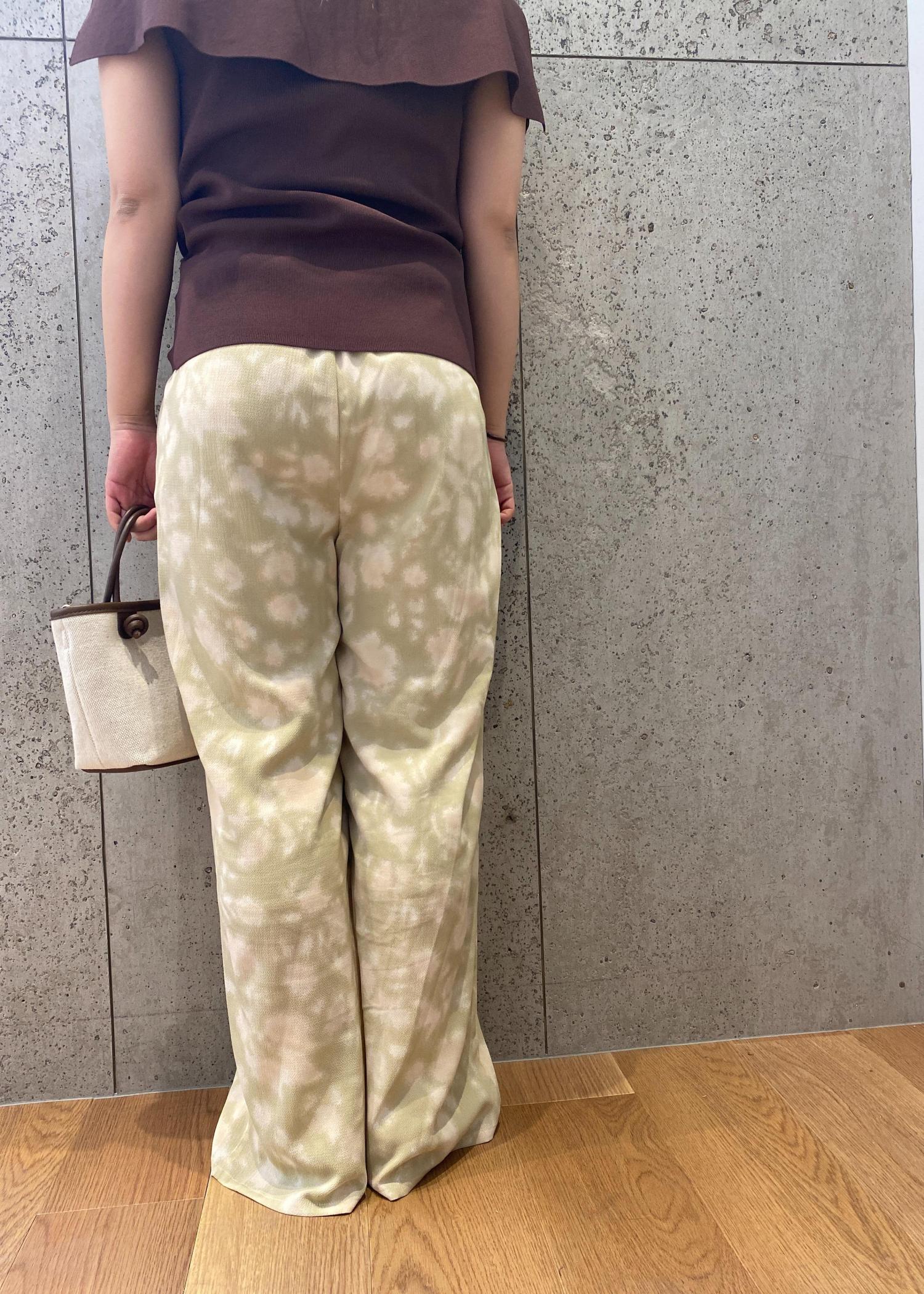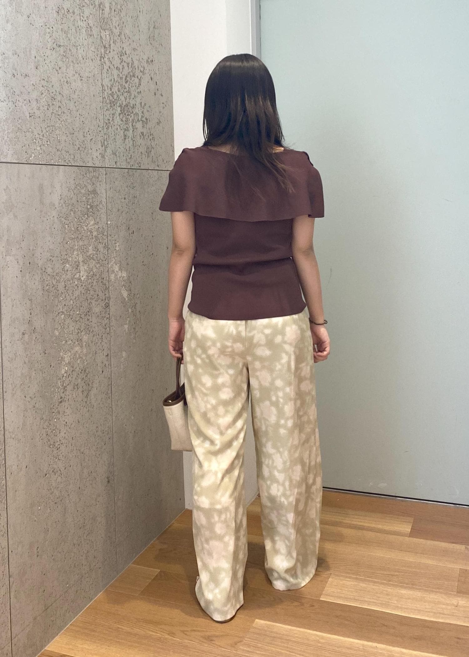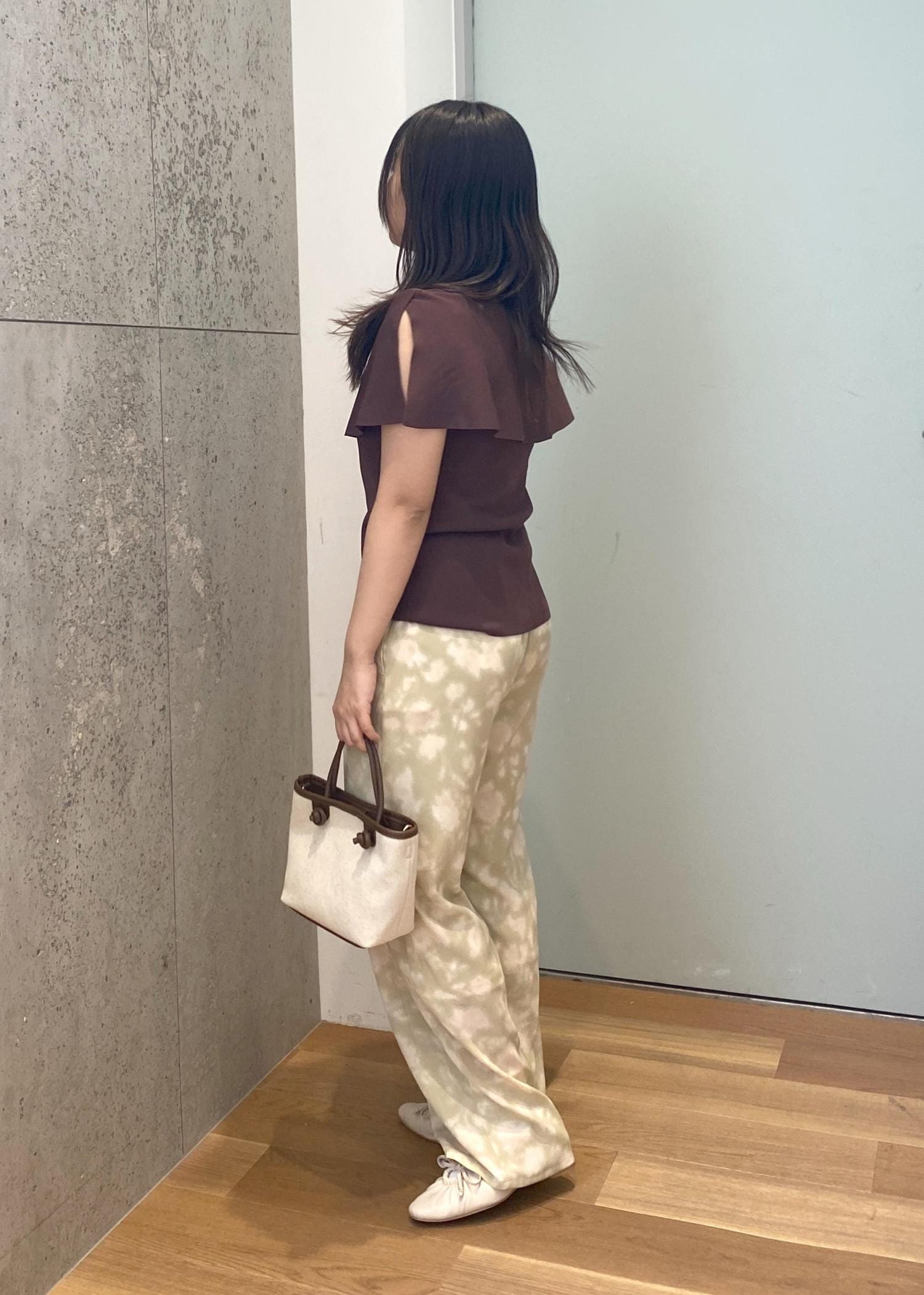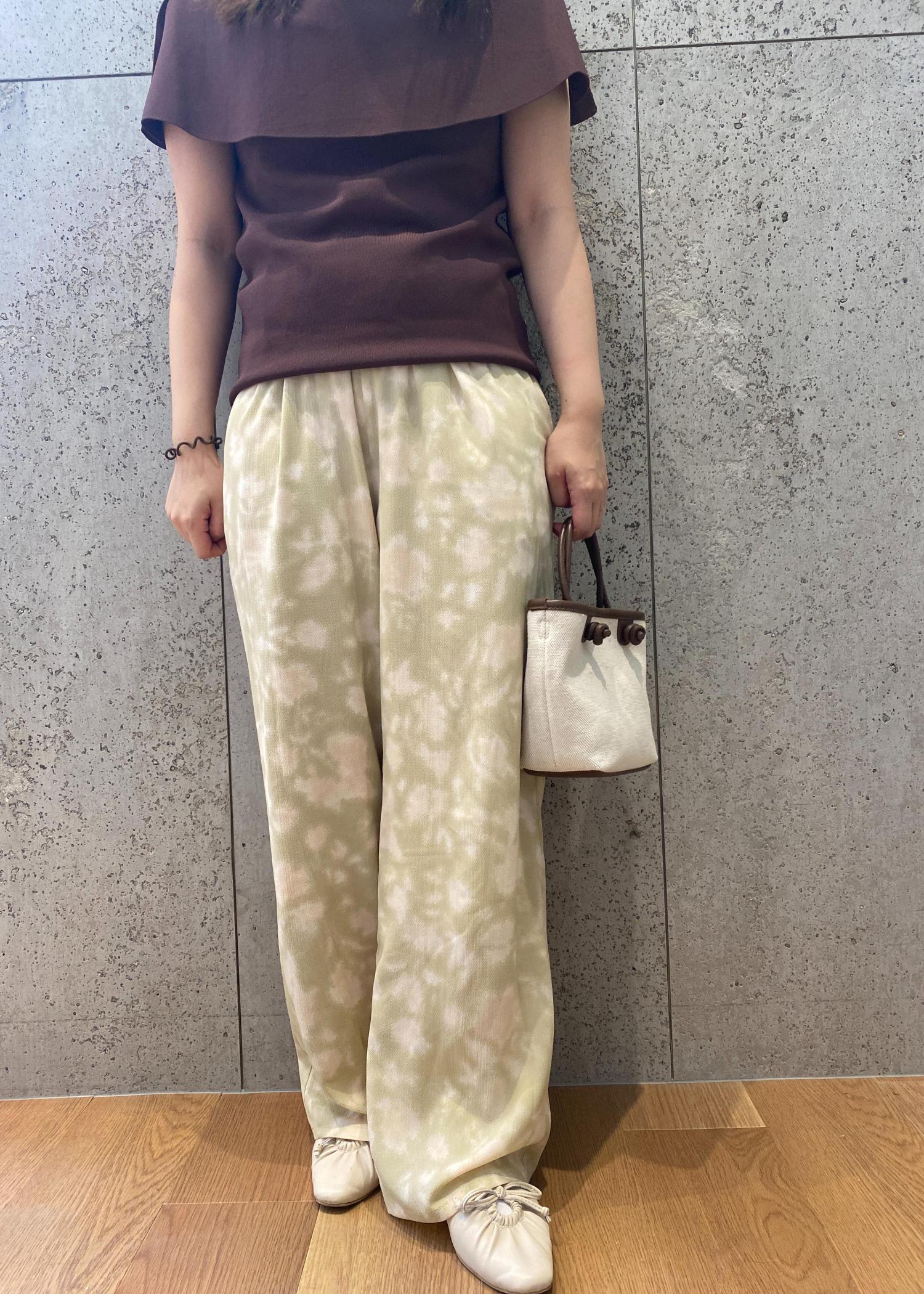 女性らしいシルエットのトップスにゆったりめのボトムを合わせてカジュアルなスタイリングにしました。夏らしい色味のボトムがこれからの季節におすすめです。