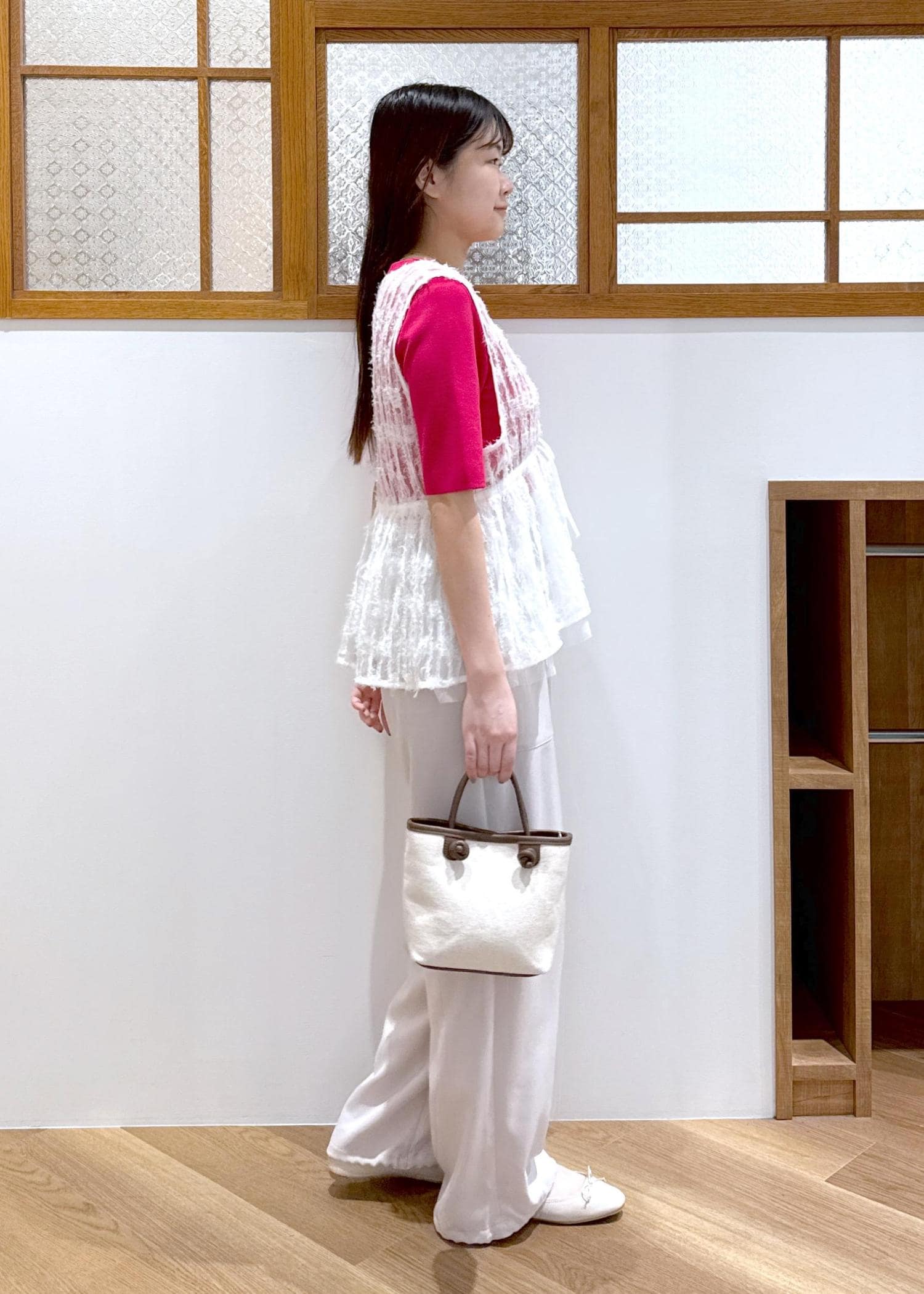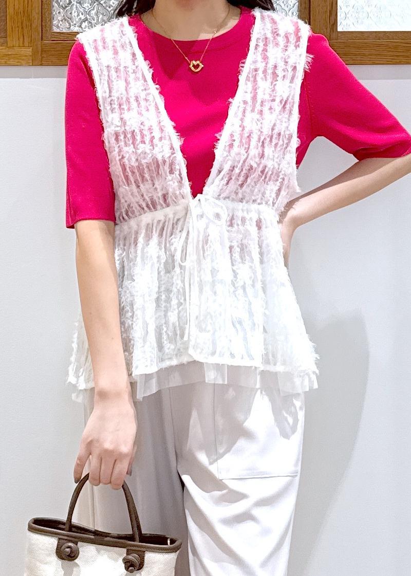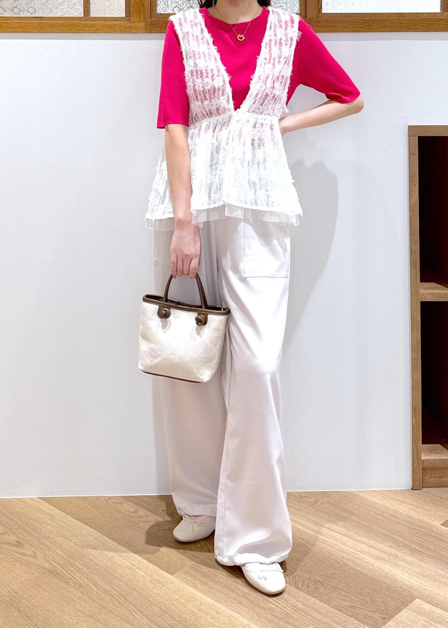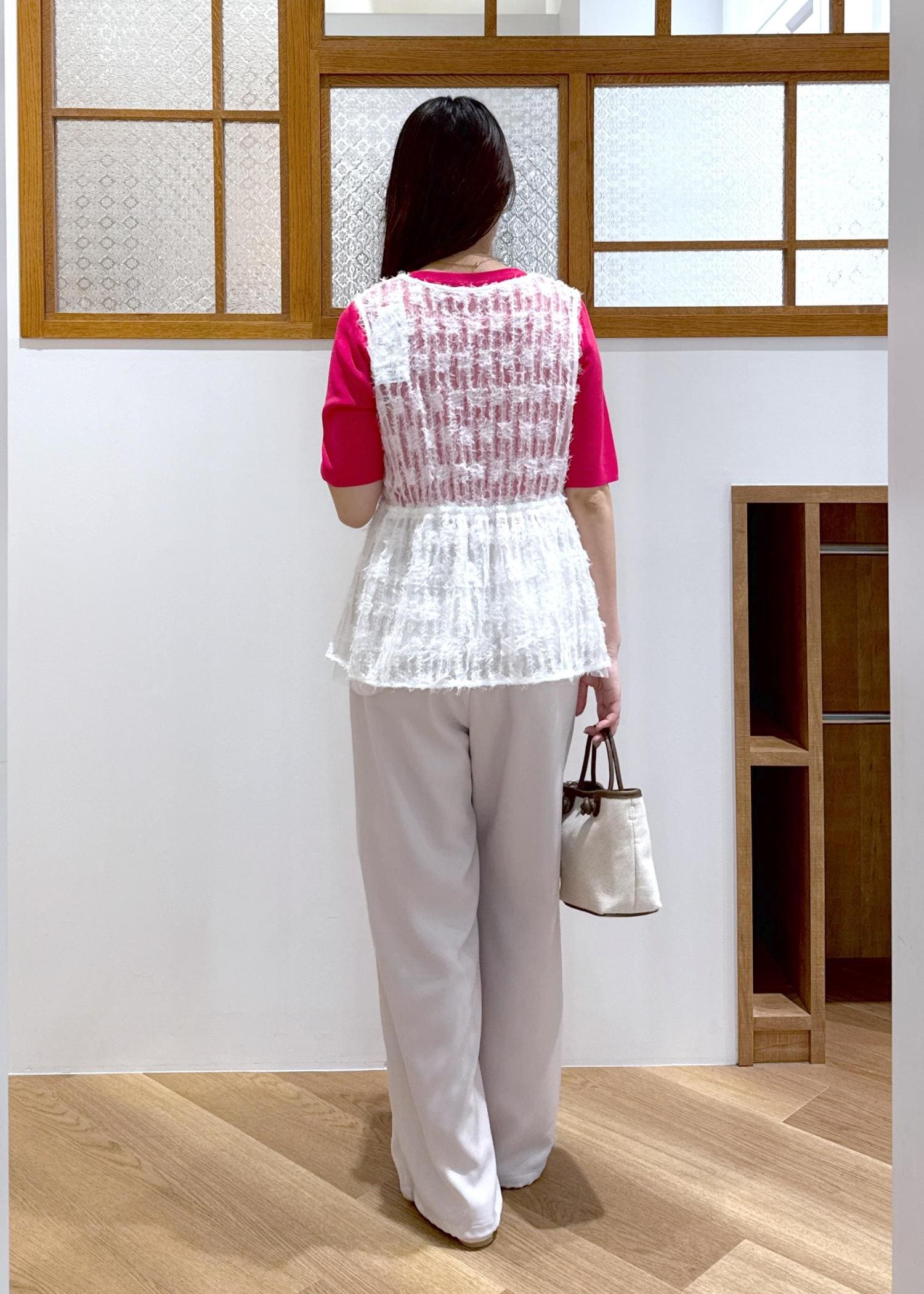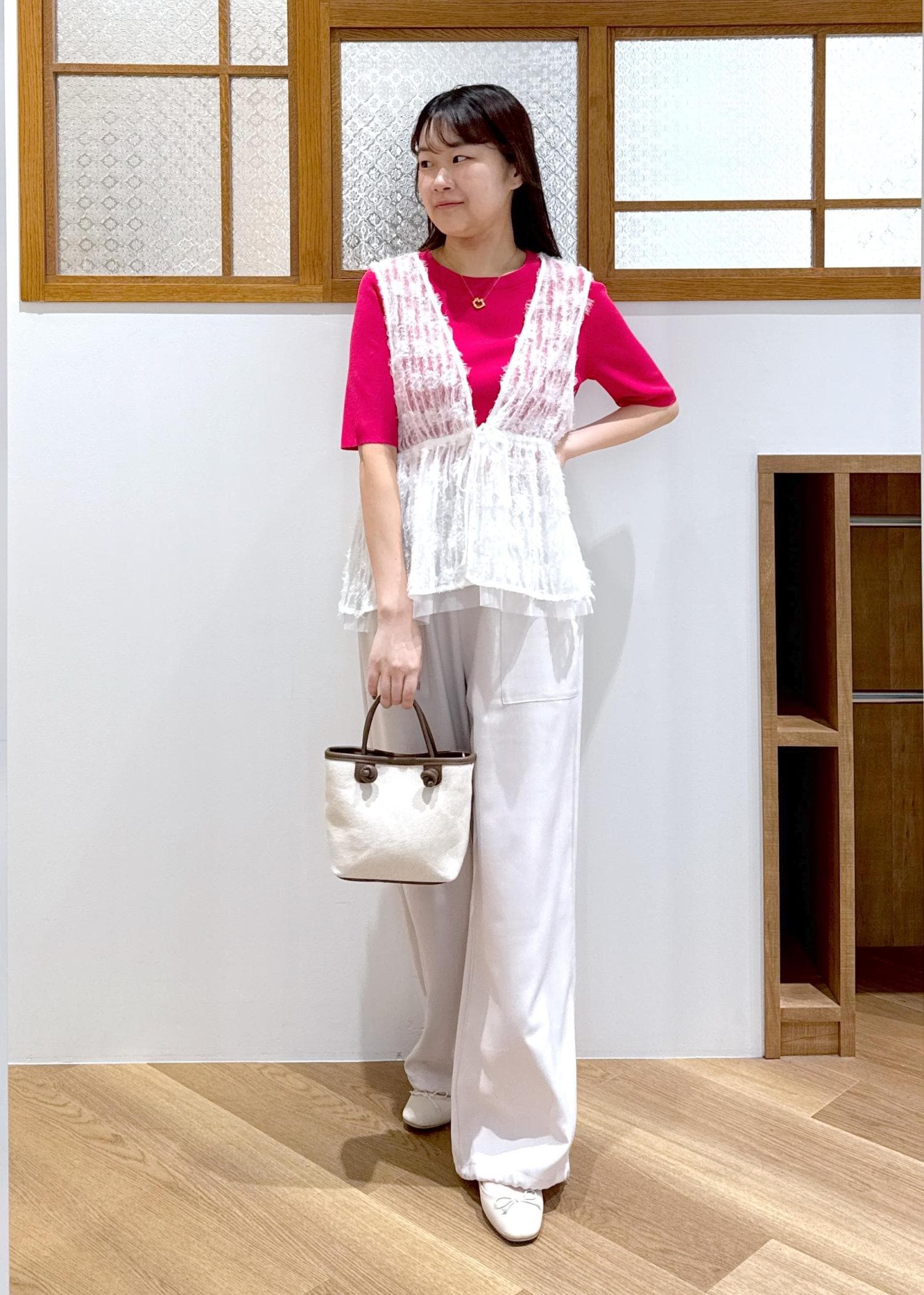 ビビットカラーのピンクのトップスに白のジレをレイヤードすることでさらに洒落感をプラスしています。