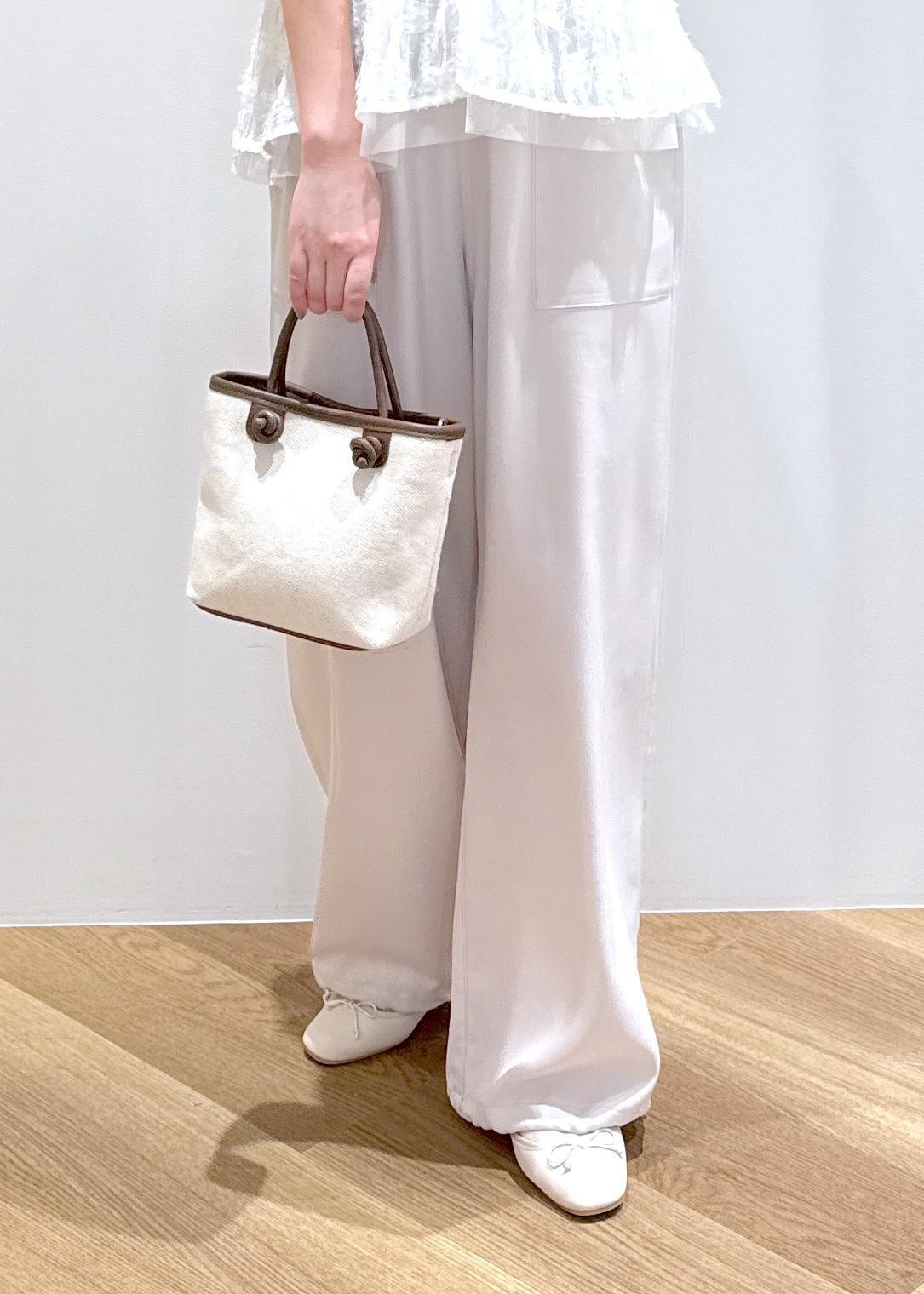 ボトムやシューズはアイボリー系で揃え、主張しすぎないようにしています。