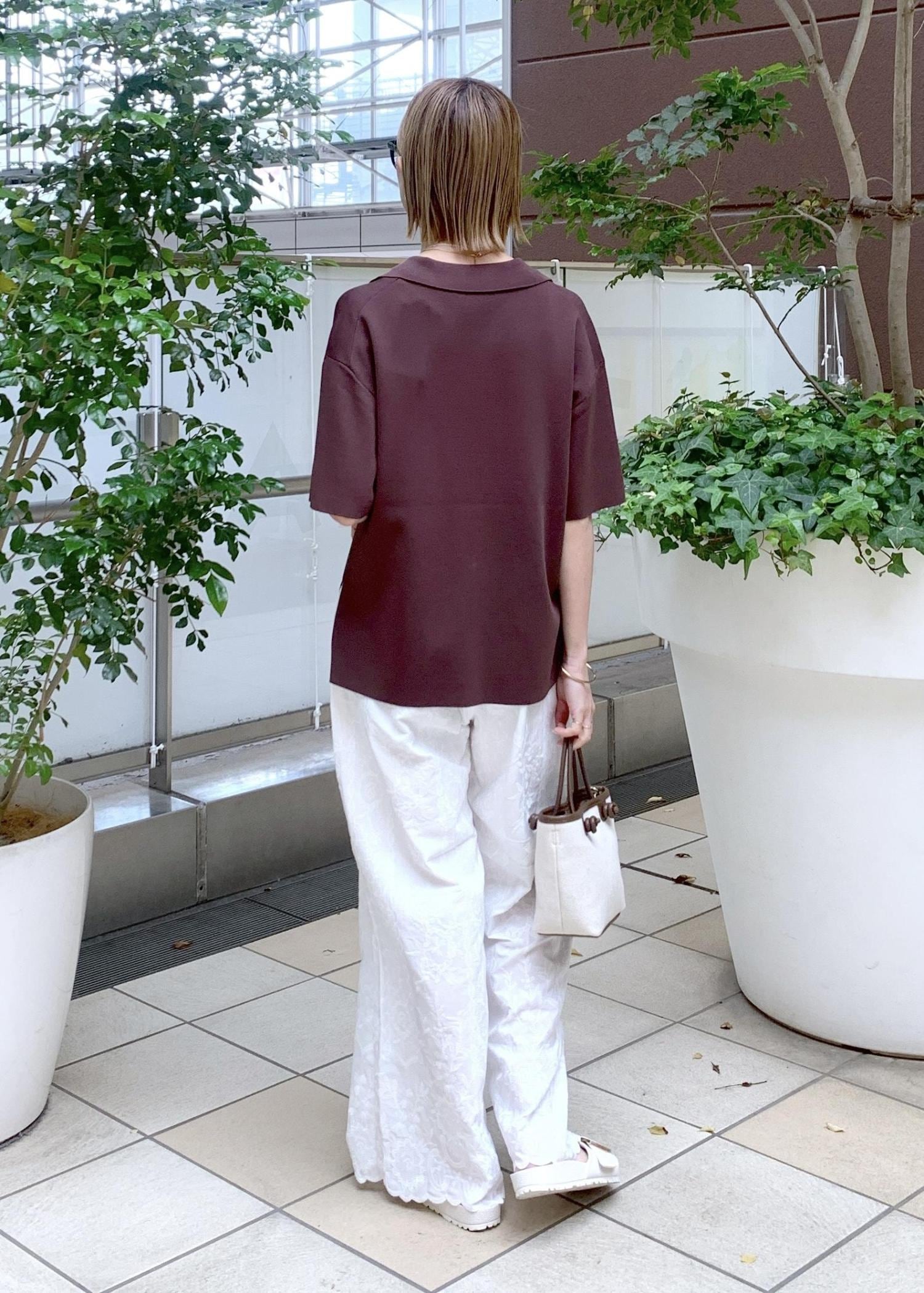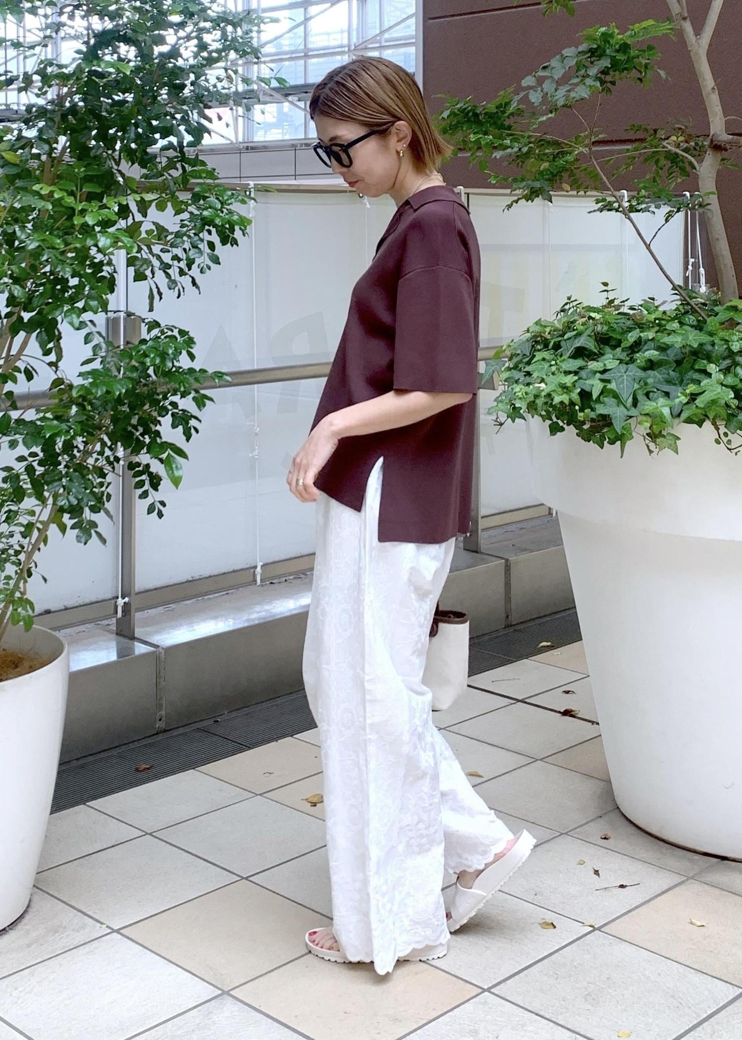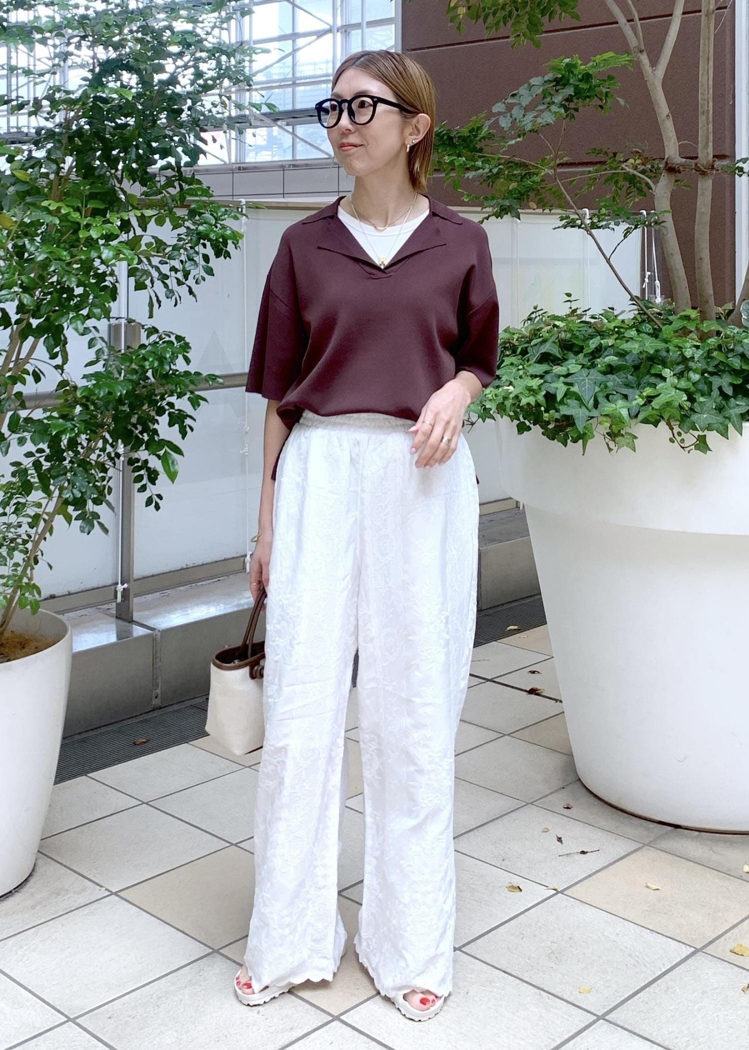 刺繍レースのパンツを合わせて上品なスタイリングに。