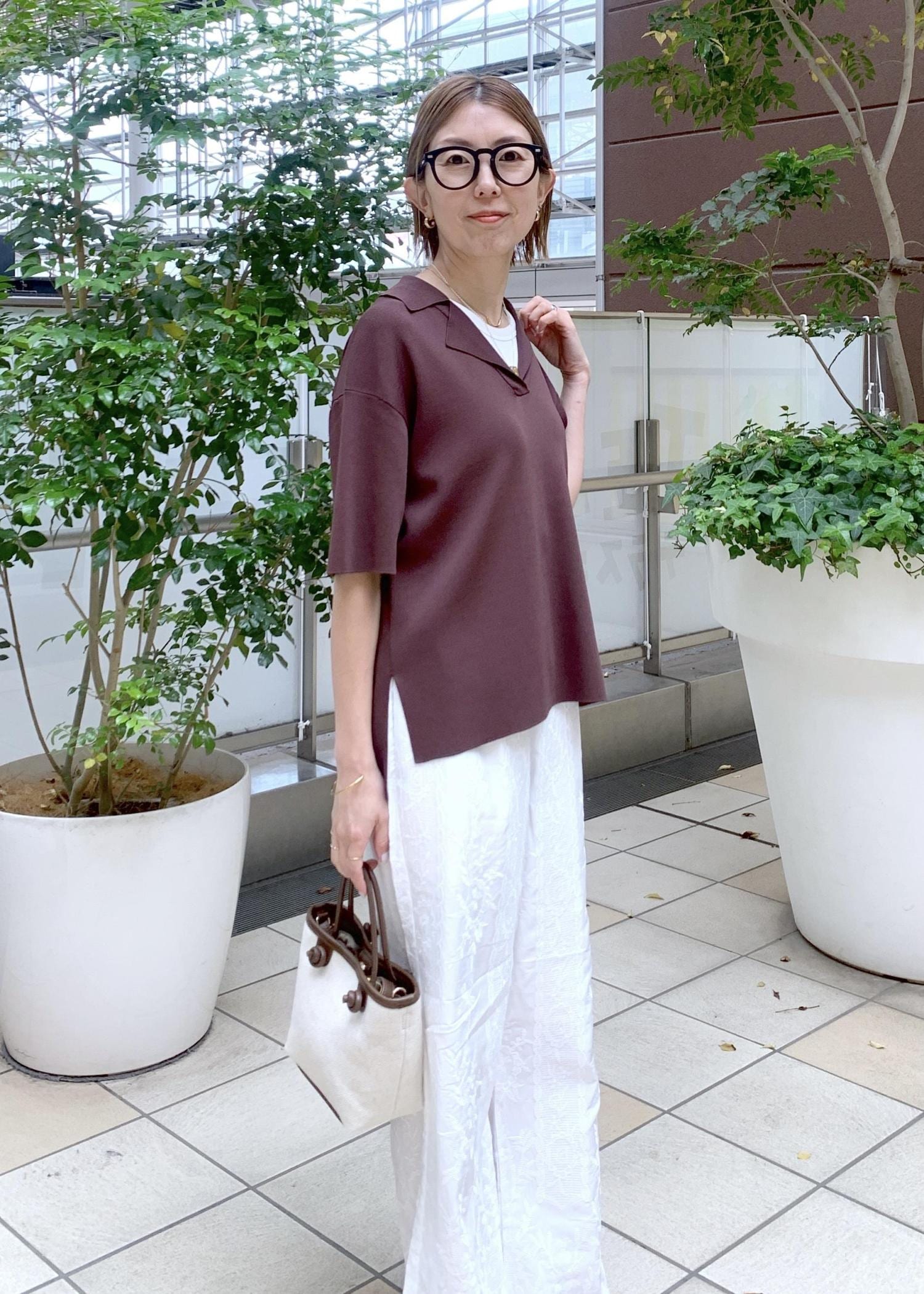ゆったりとしたシルエットで抜け感のあるVネックスキッパーカラーが大人な印象。