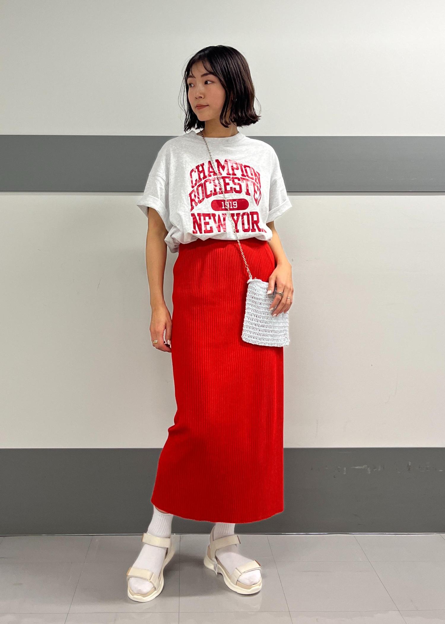 Tシャツのロゴとスカートの色味を合わせて統一感を、羽織をブラウンにすることでビビットカラーも派手になりすぎないのでカラーコーデを挑戦する際に是非取り入れてみて下さい♪