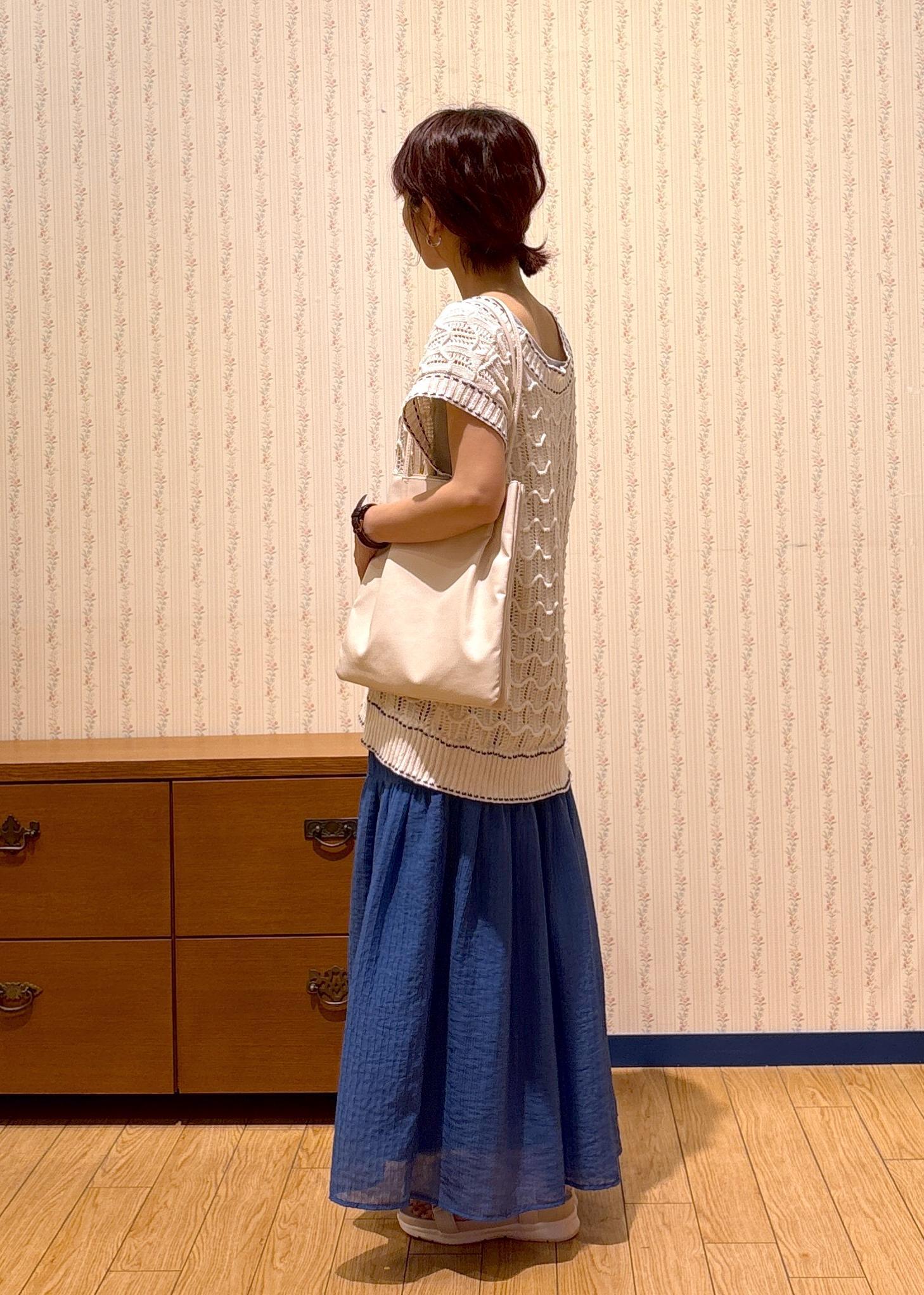 ふわっとしたシルエットなので、トップスは広がりがないアイテムを合わせるのがオススメです。 -