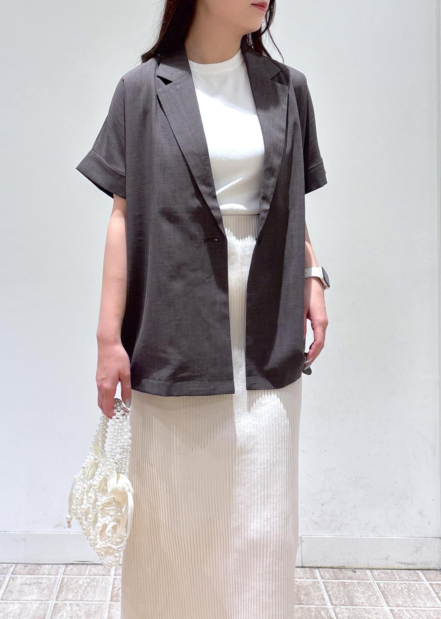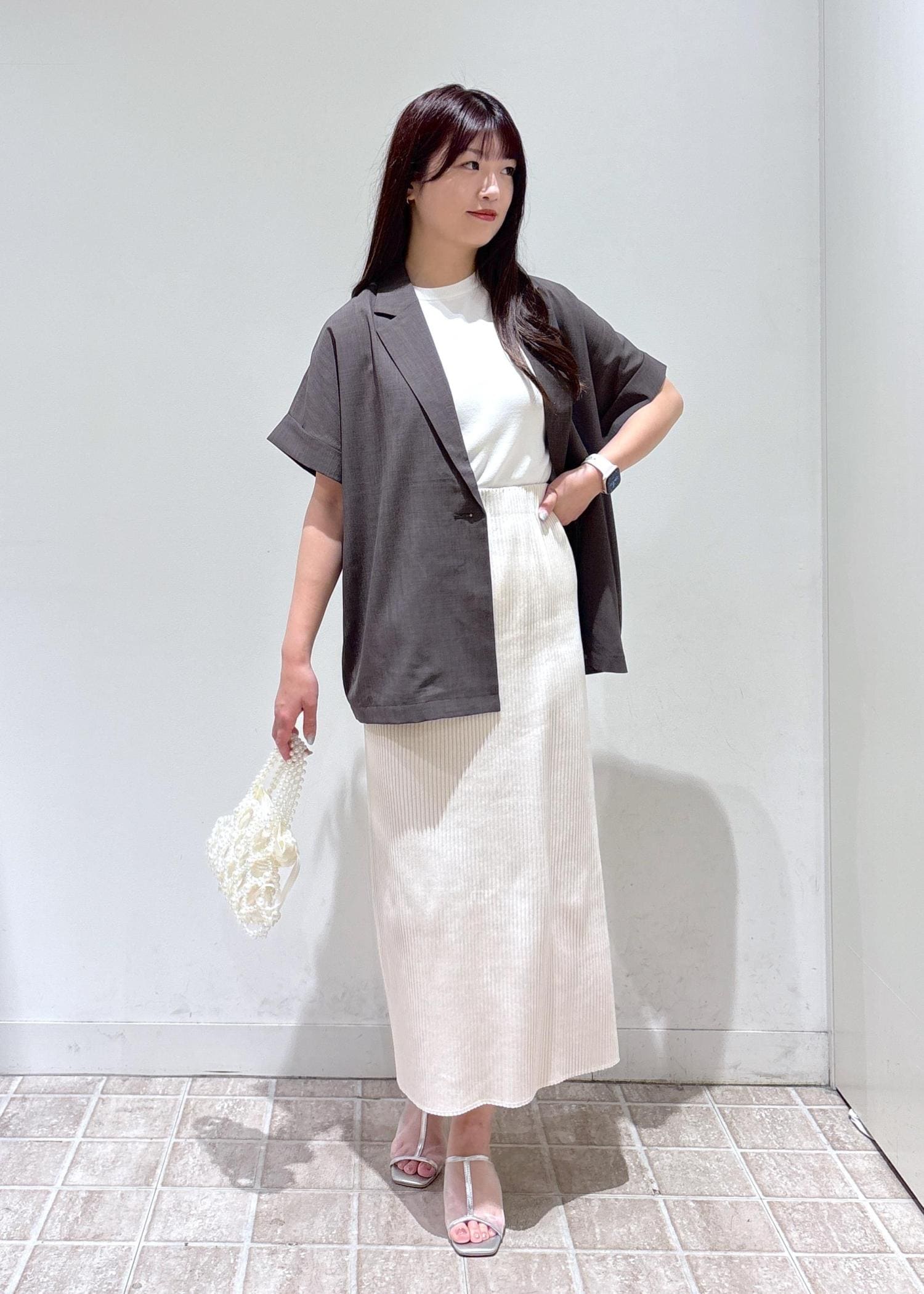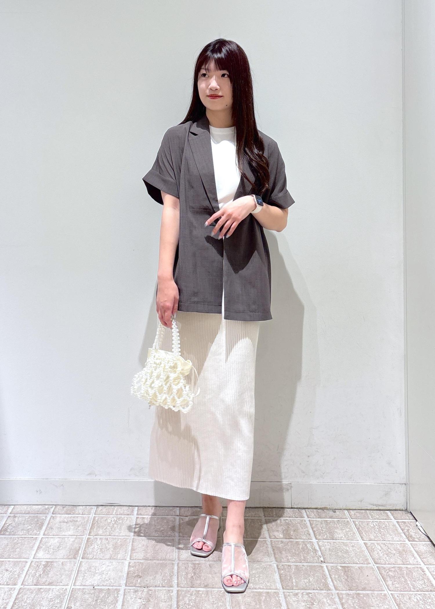 夏でも使いやすい薄手のジャケットを羽織った、夏のきれいめコーデです◎