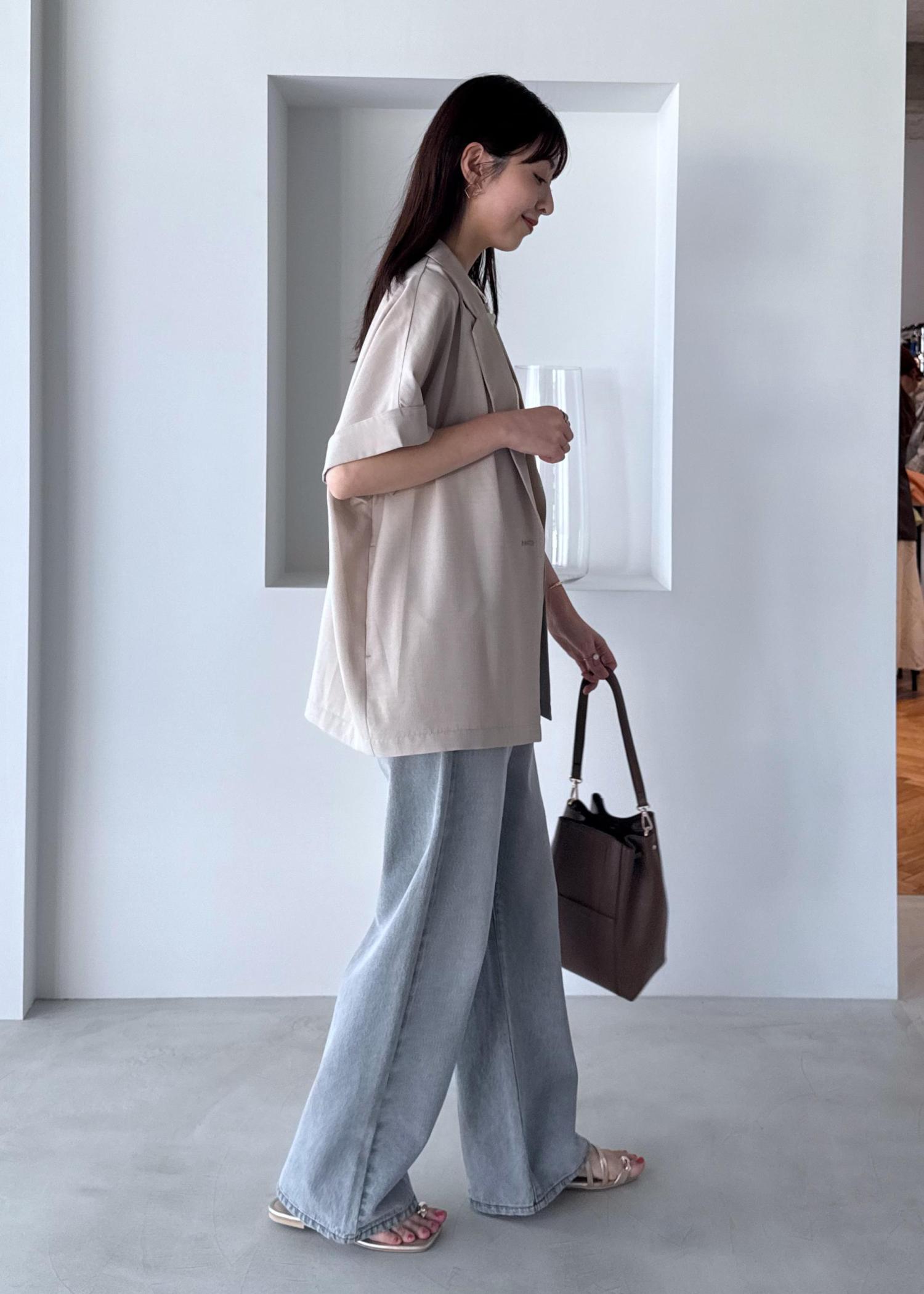 麻のようなシャリみのある生地感で真夏も快適に過ごせます。二の腕カバーをしてくれる5分袖。シャツのような軽さで着心地がとても楽です。シワがつきにくいのも嬉しいポイント。