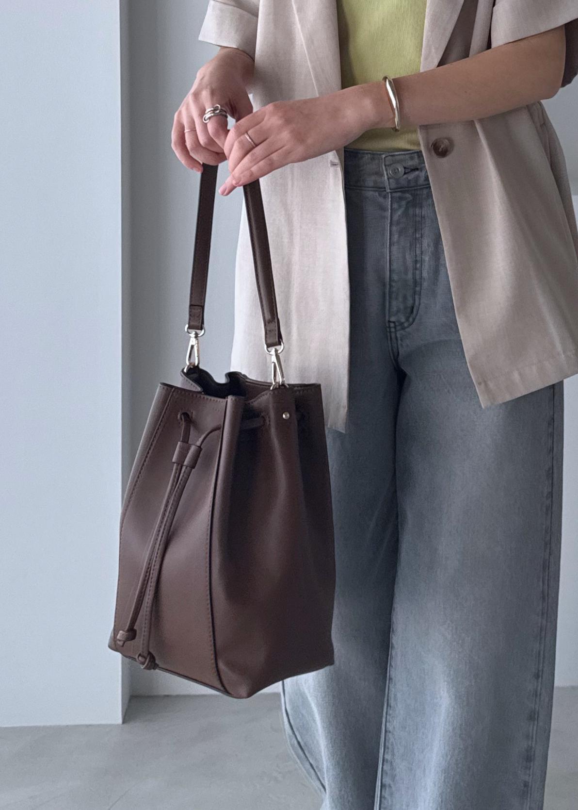 間口は絞りを緩めればガバッと開くので出し入れがスムーズです。巾着デザインなのでシンプルスタイルの華やぎアイテムとしてプラスするのがお勧めです。背面ポケット付きなのでスマホや定期など頻繁に手に取る物はこちらに入れられるのも嬉しいポイント。