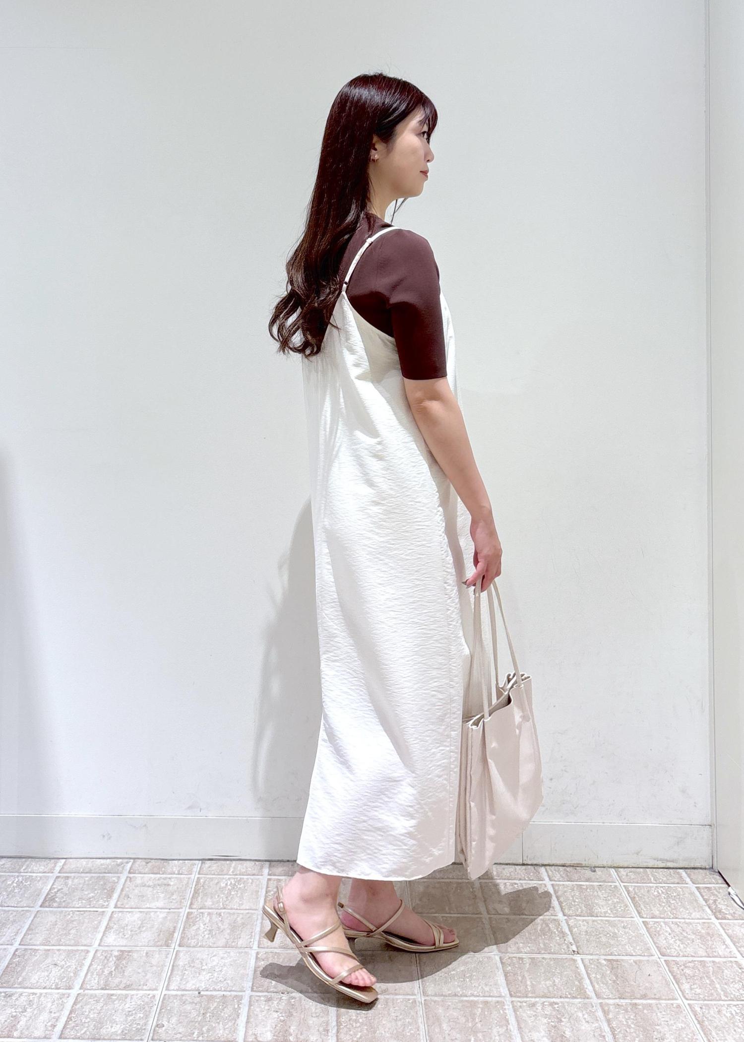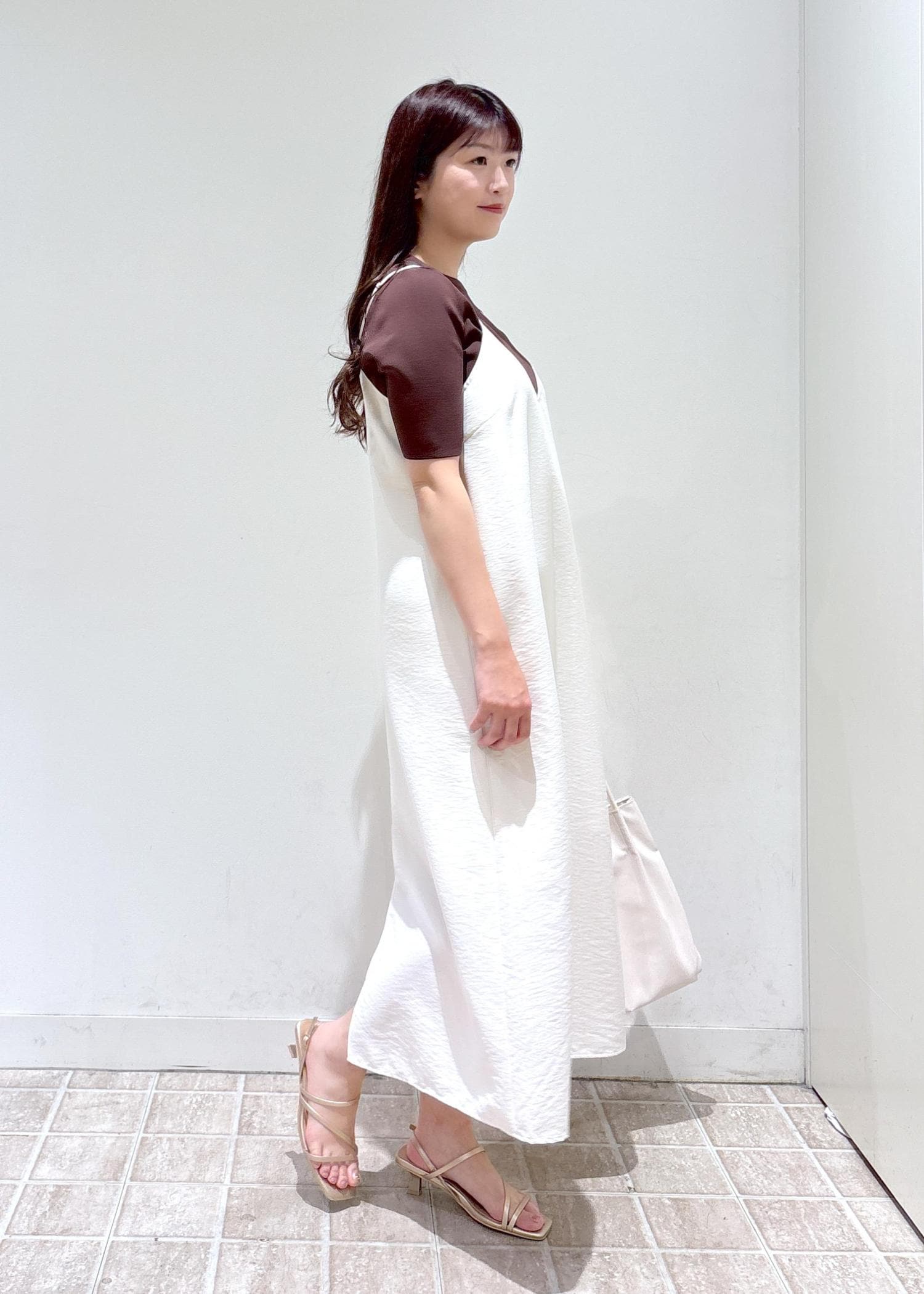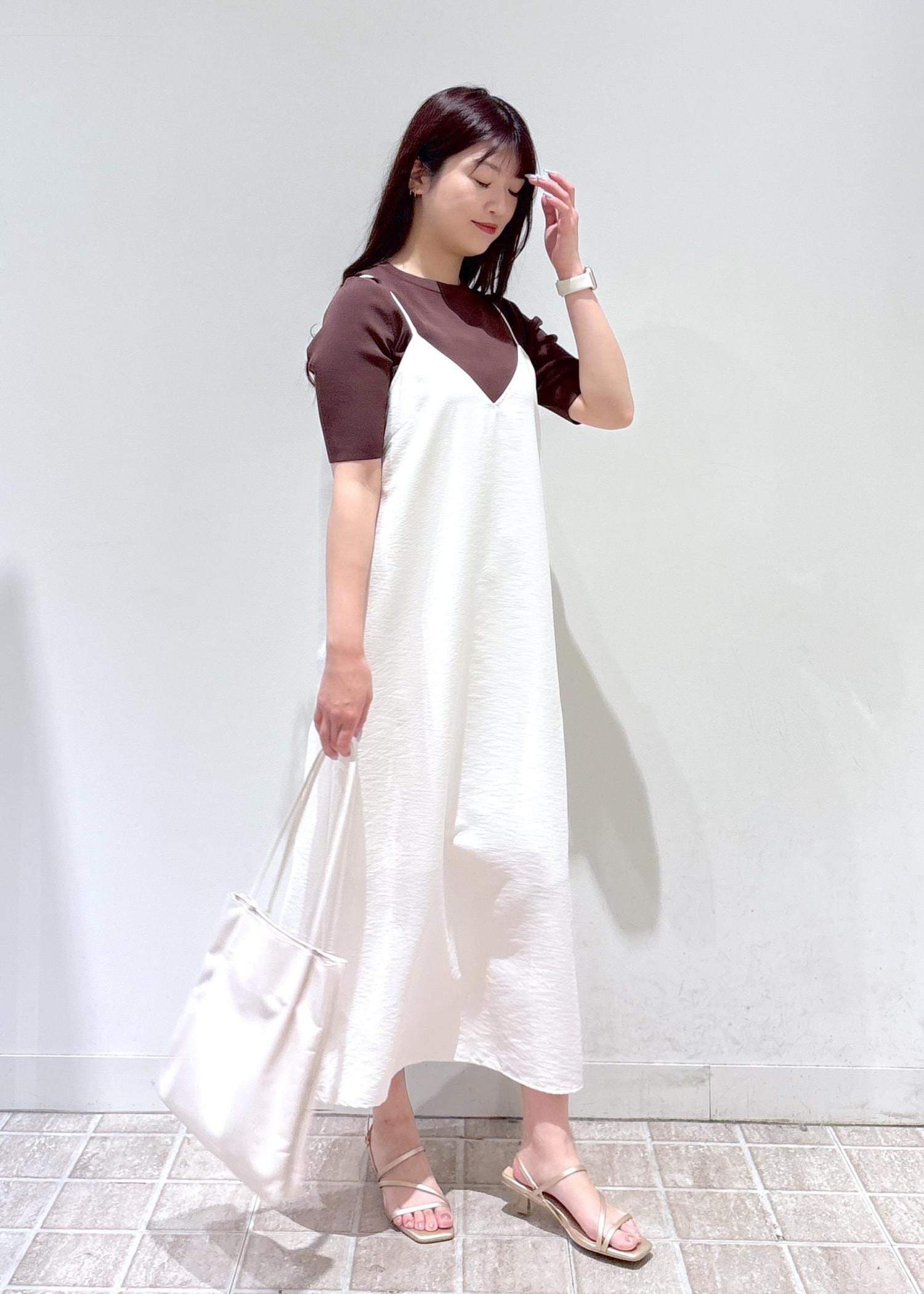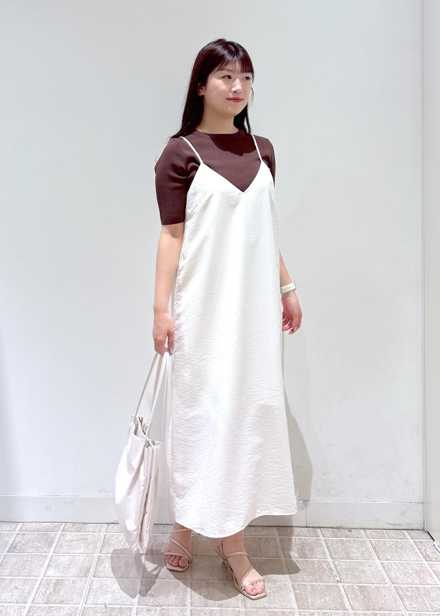 夏の定番のキャミワンピも、インにブラウンのトップスを合わせることでらしく着て頂けます。