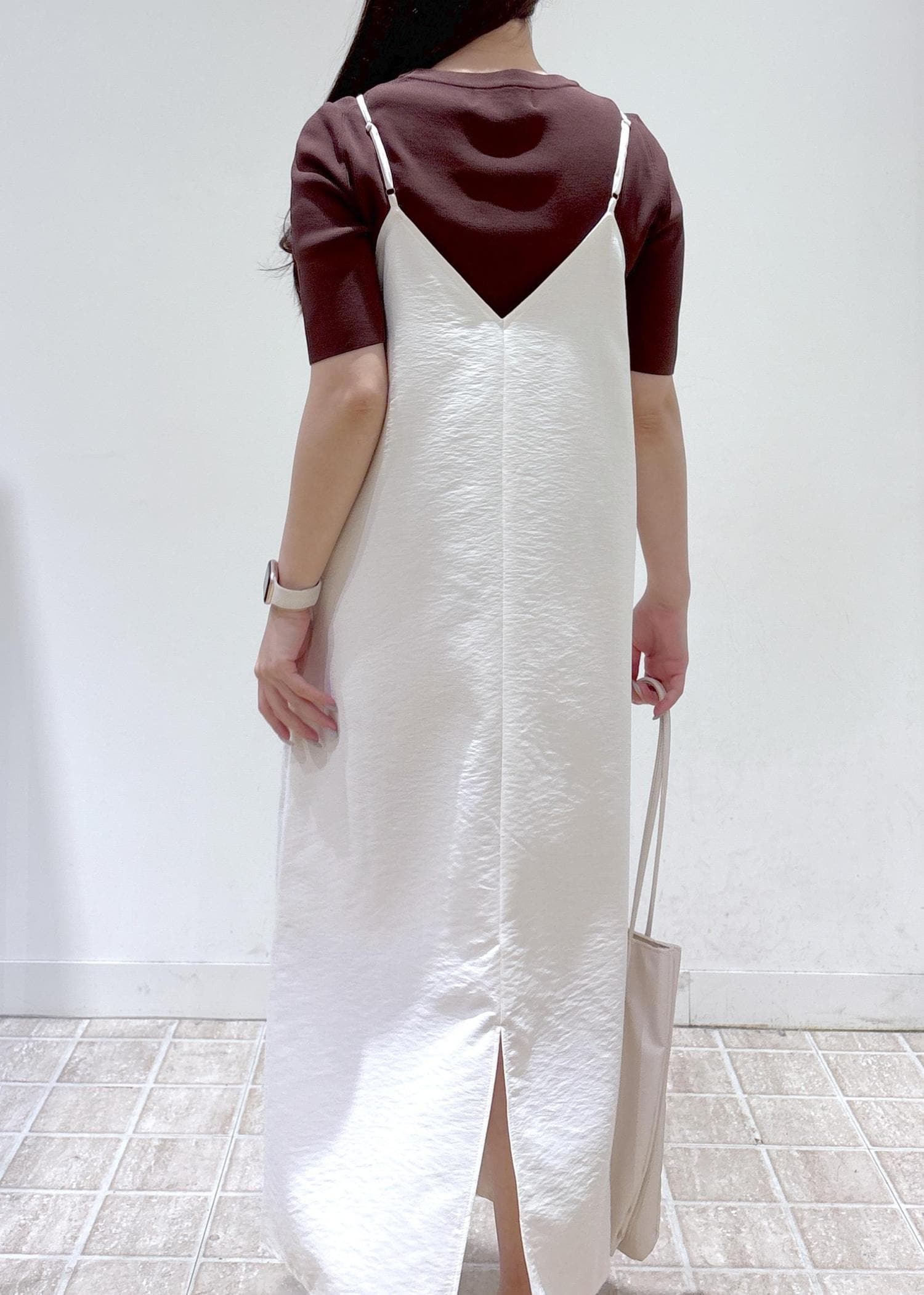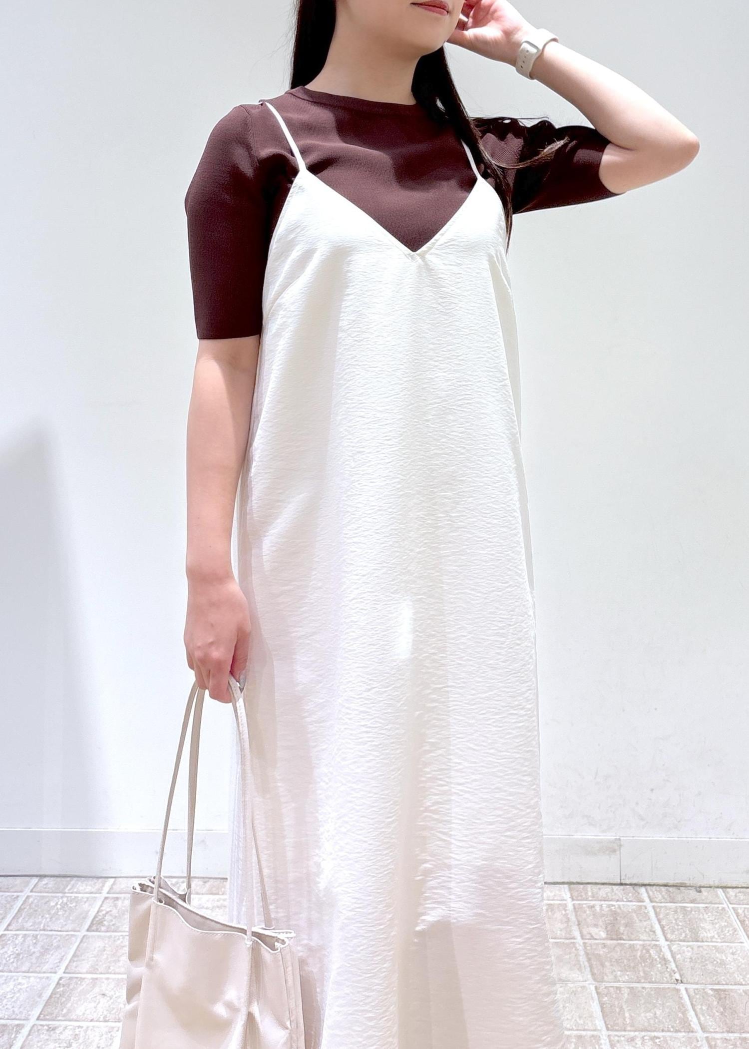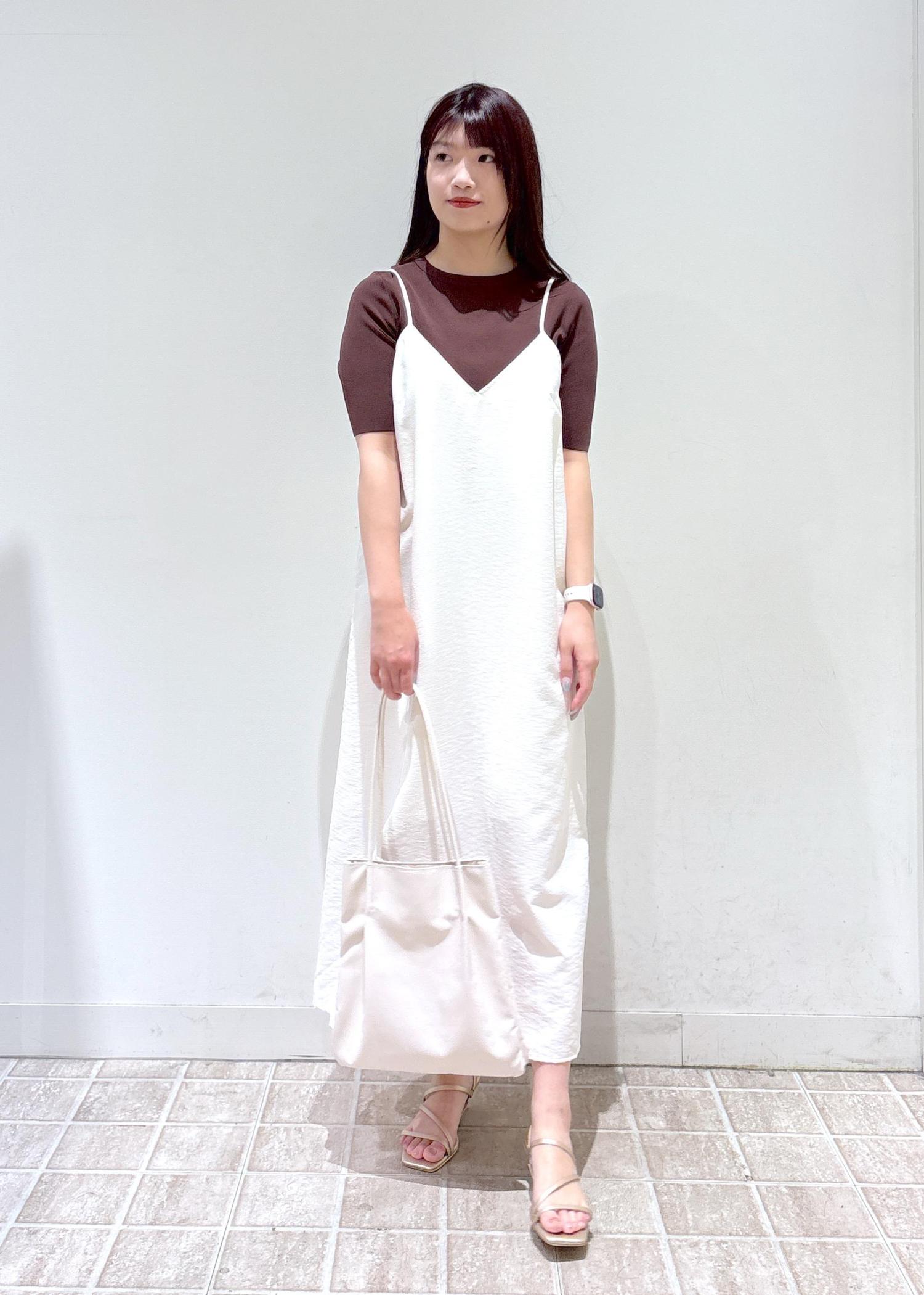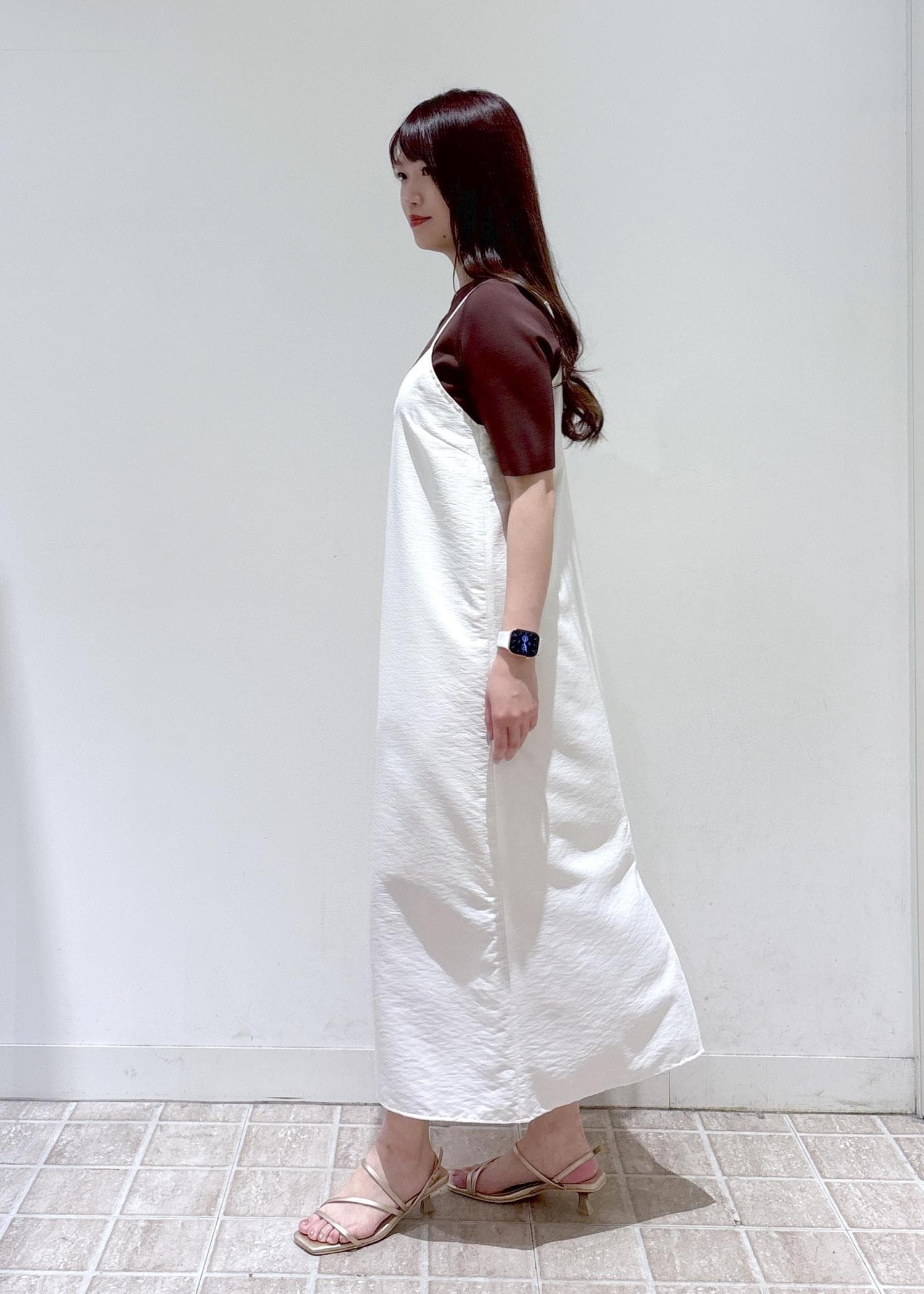 夏の定番のキャミワンピも、インにブラウンのトップスを合わせることでらしく着て頂けます。