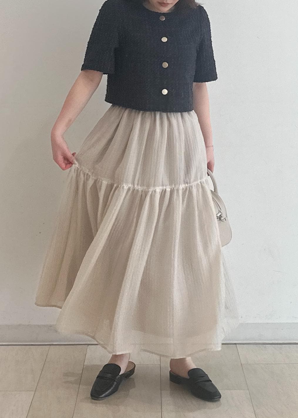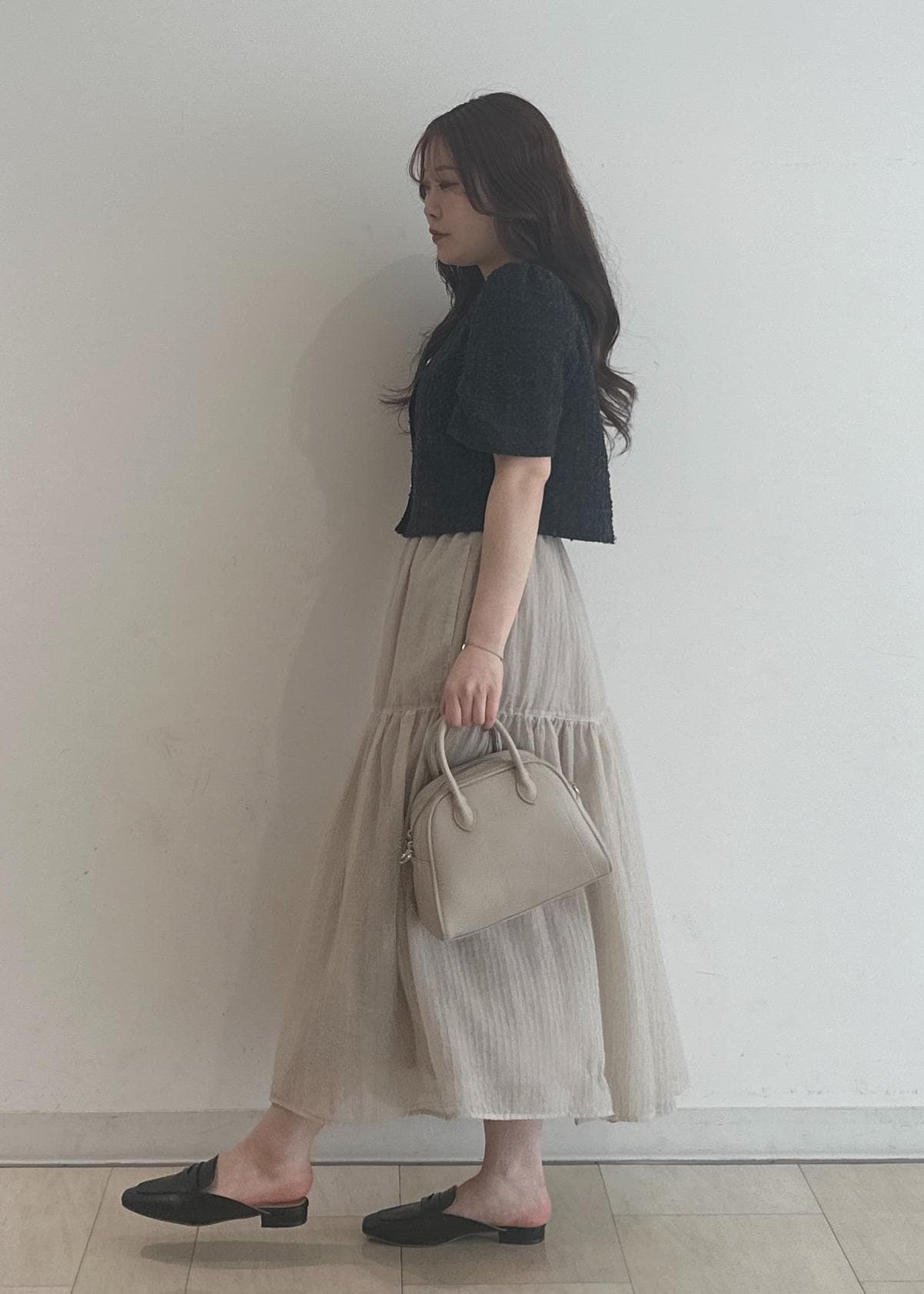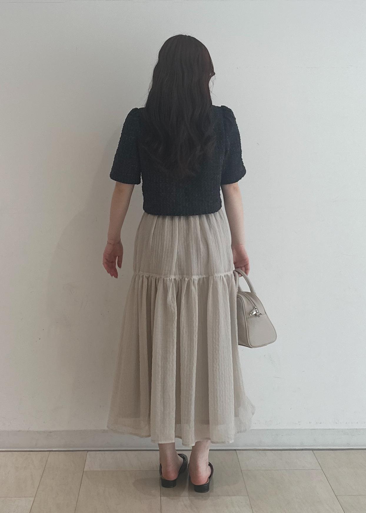 サマーツイードのジャケットがチャコールと暗めなのでスカートはシアー感のあるティアードにすることで重すぎない印象にしました!