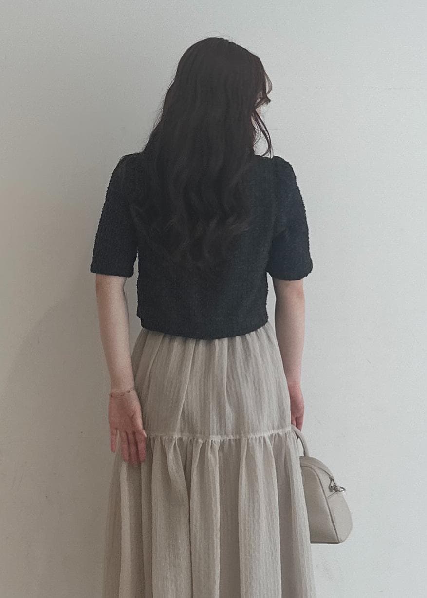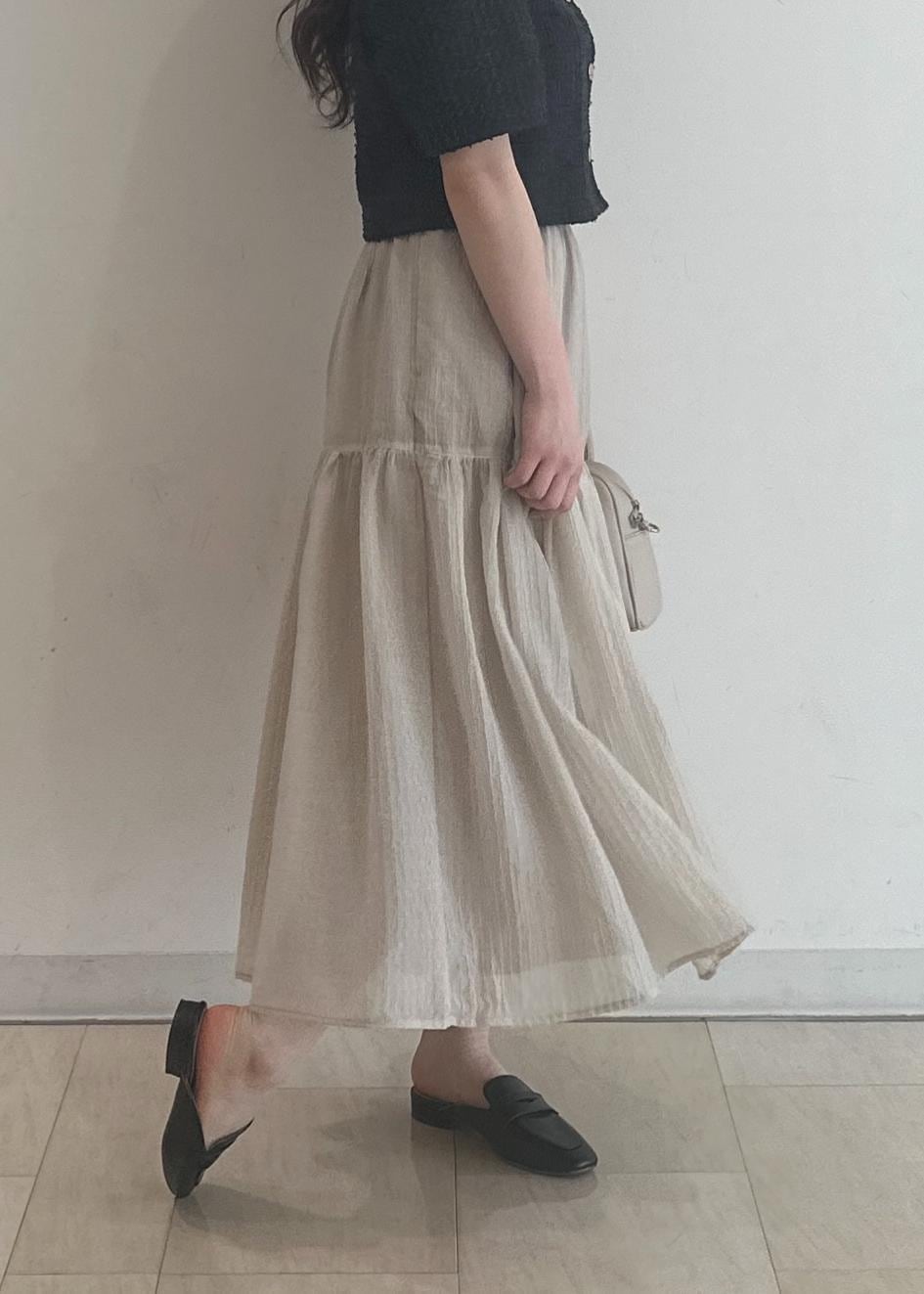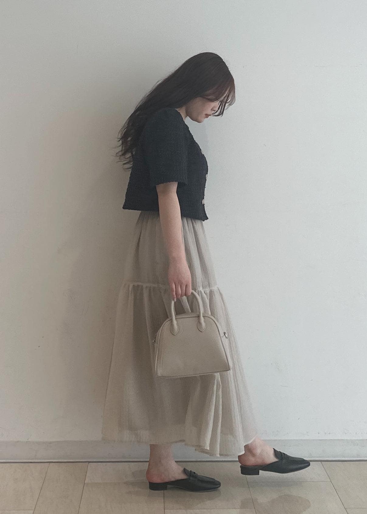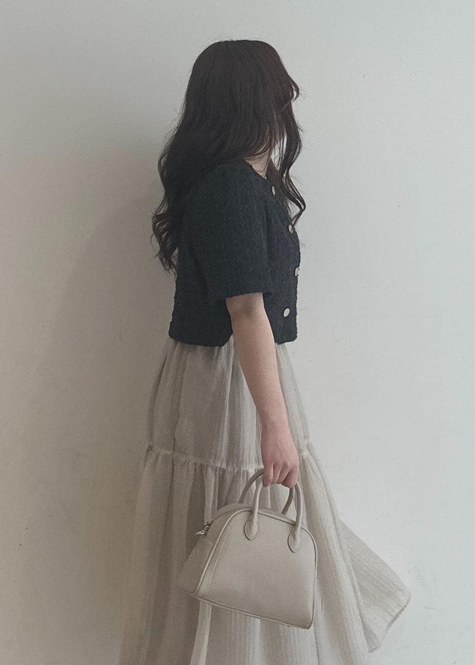 サマーツイードのジャケットがチャコールと暗めなのでスカートはシアー感のあるティアードにすることで重すぎない印象にしました!