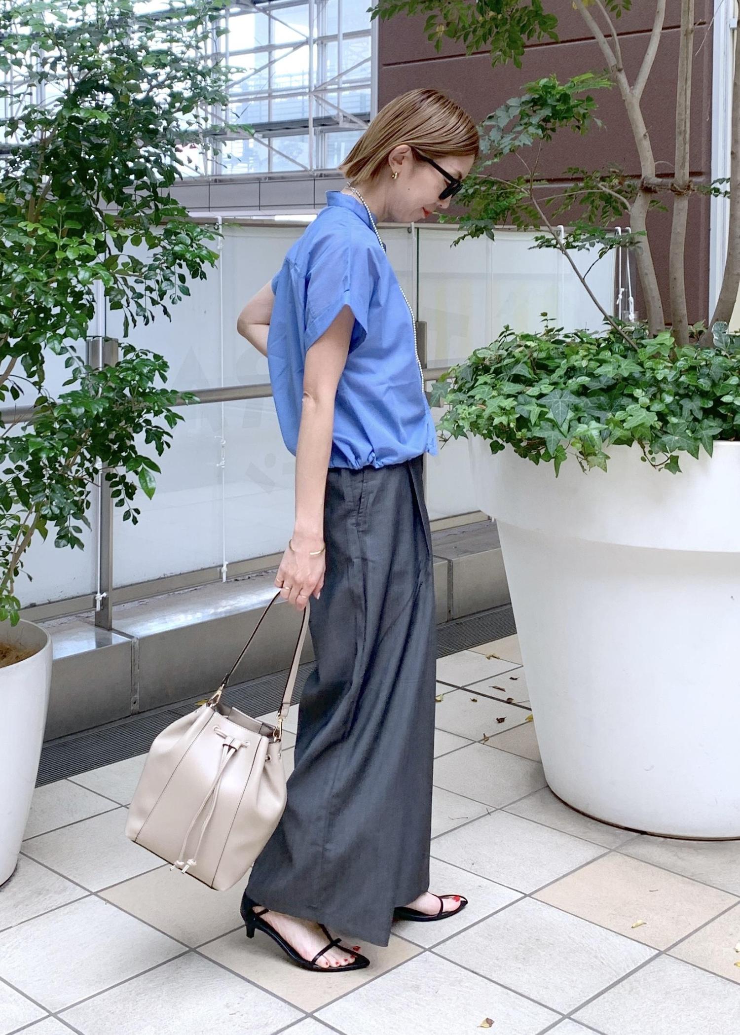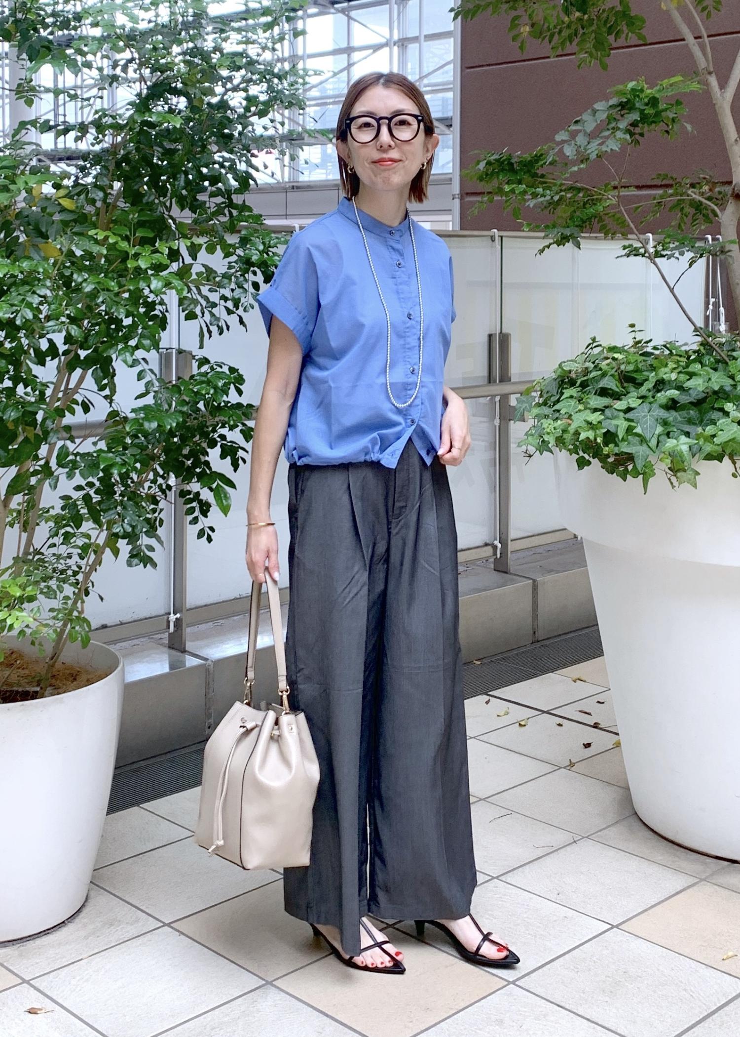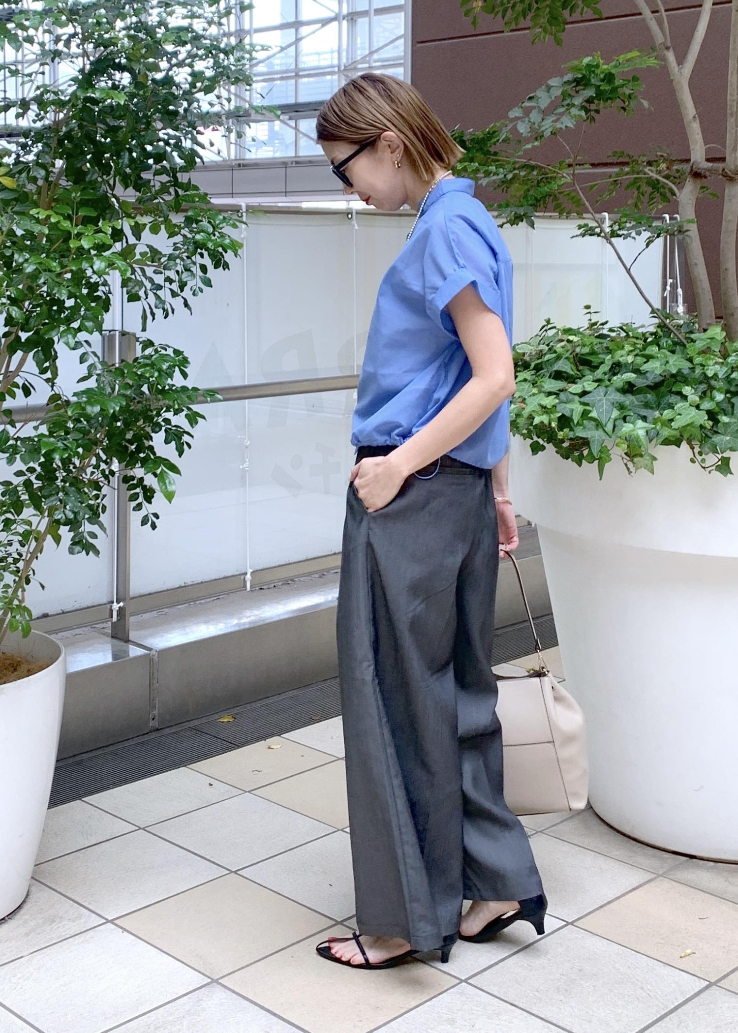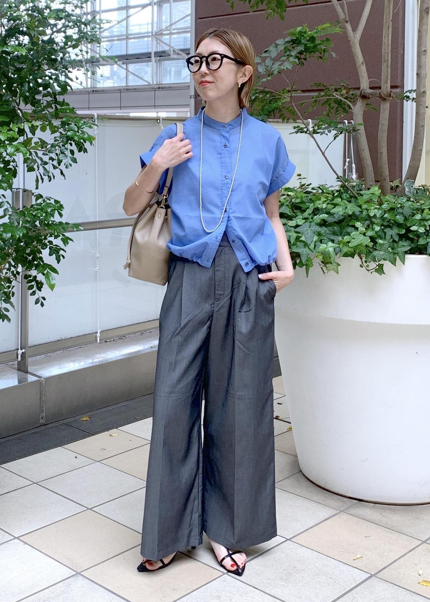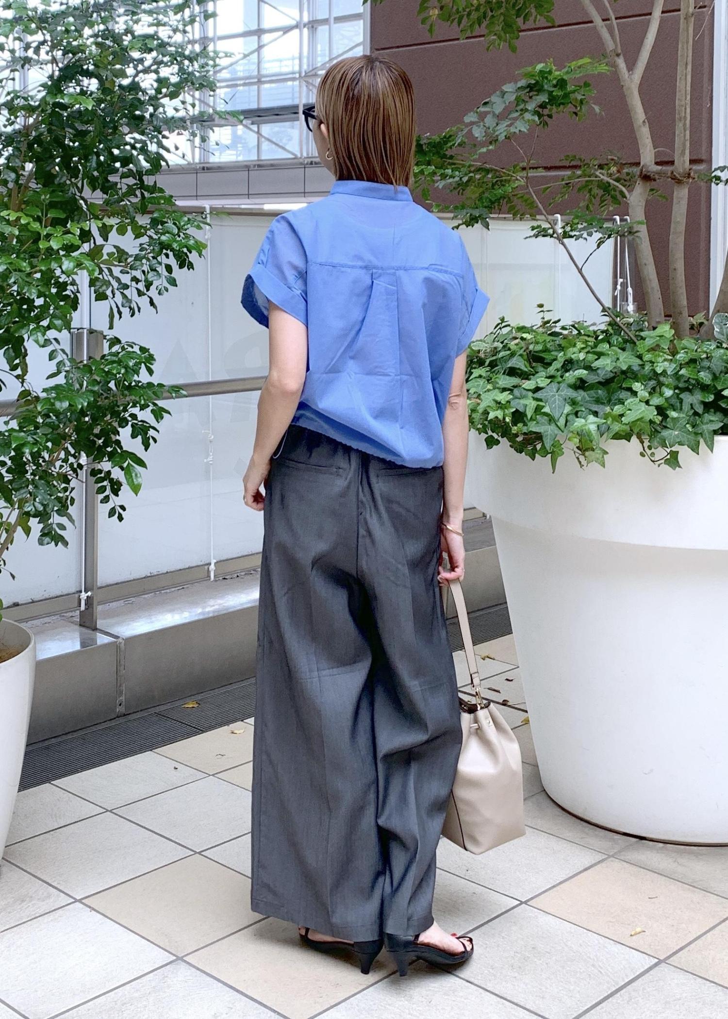 着映えするブルーのクロップドシャツのオフィスカジュアルスタイリング。