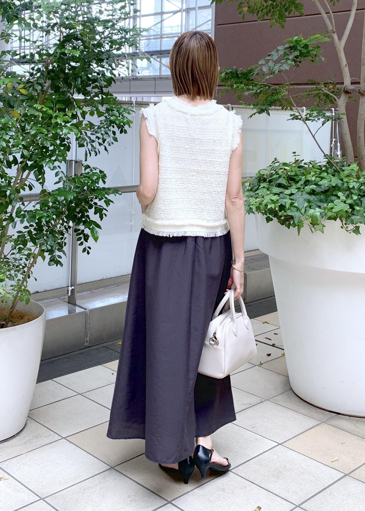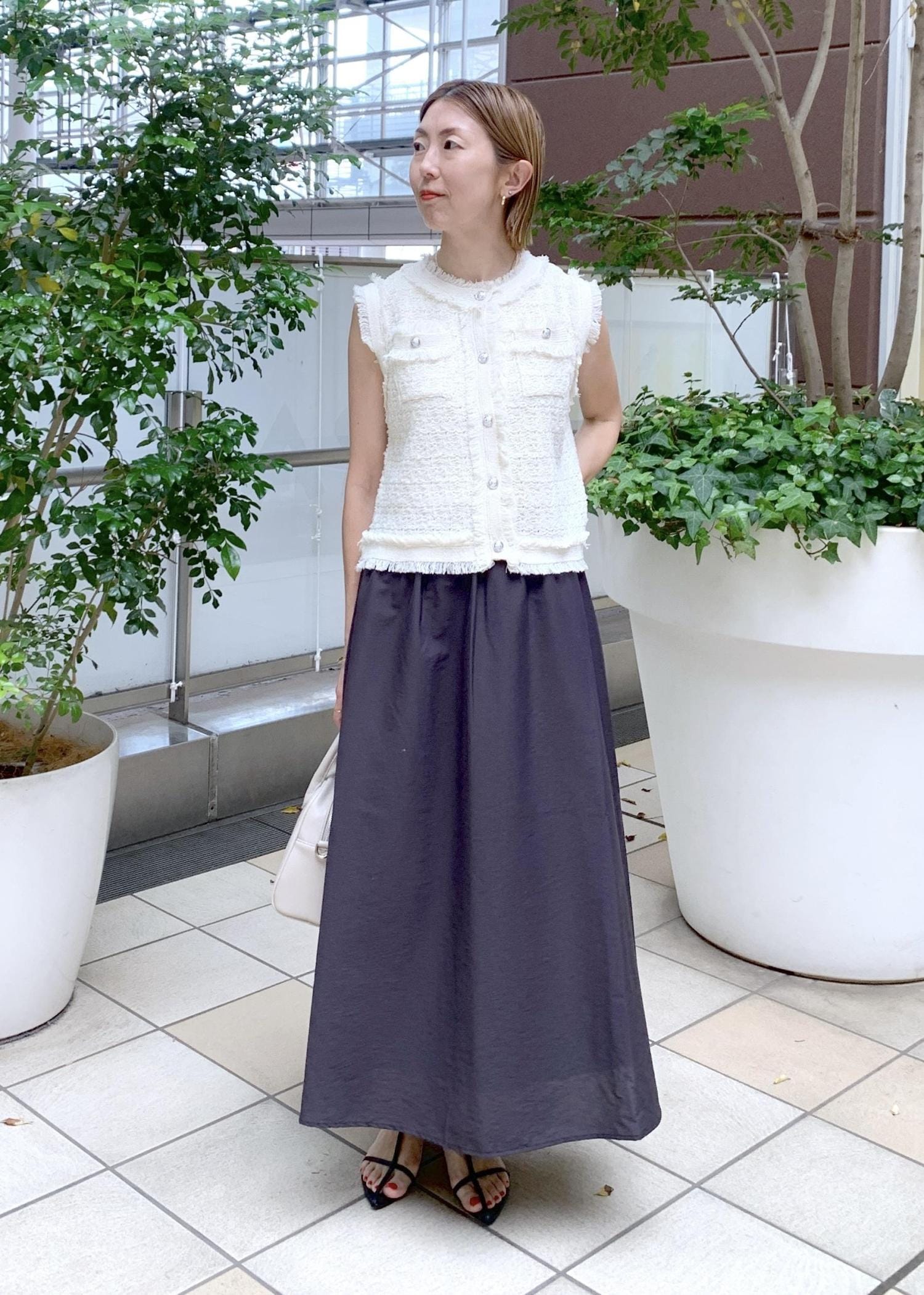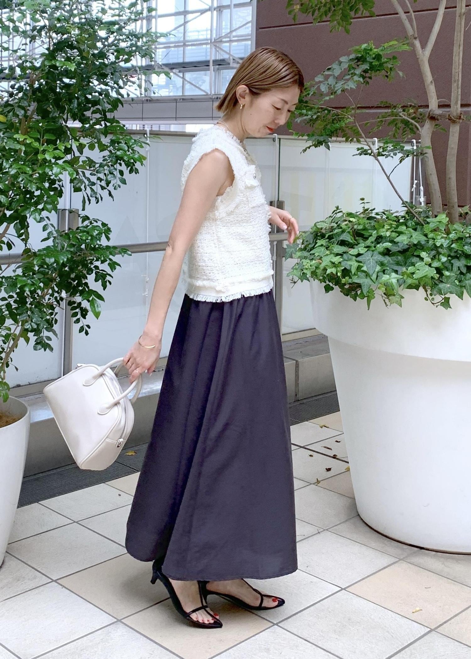 ワイドパンツ、フレアスカートを合わせてオフィススタイリングにも◎ -