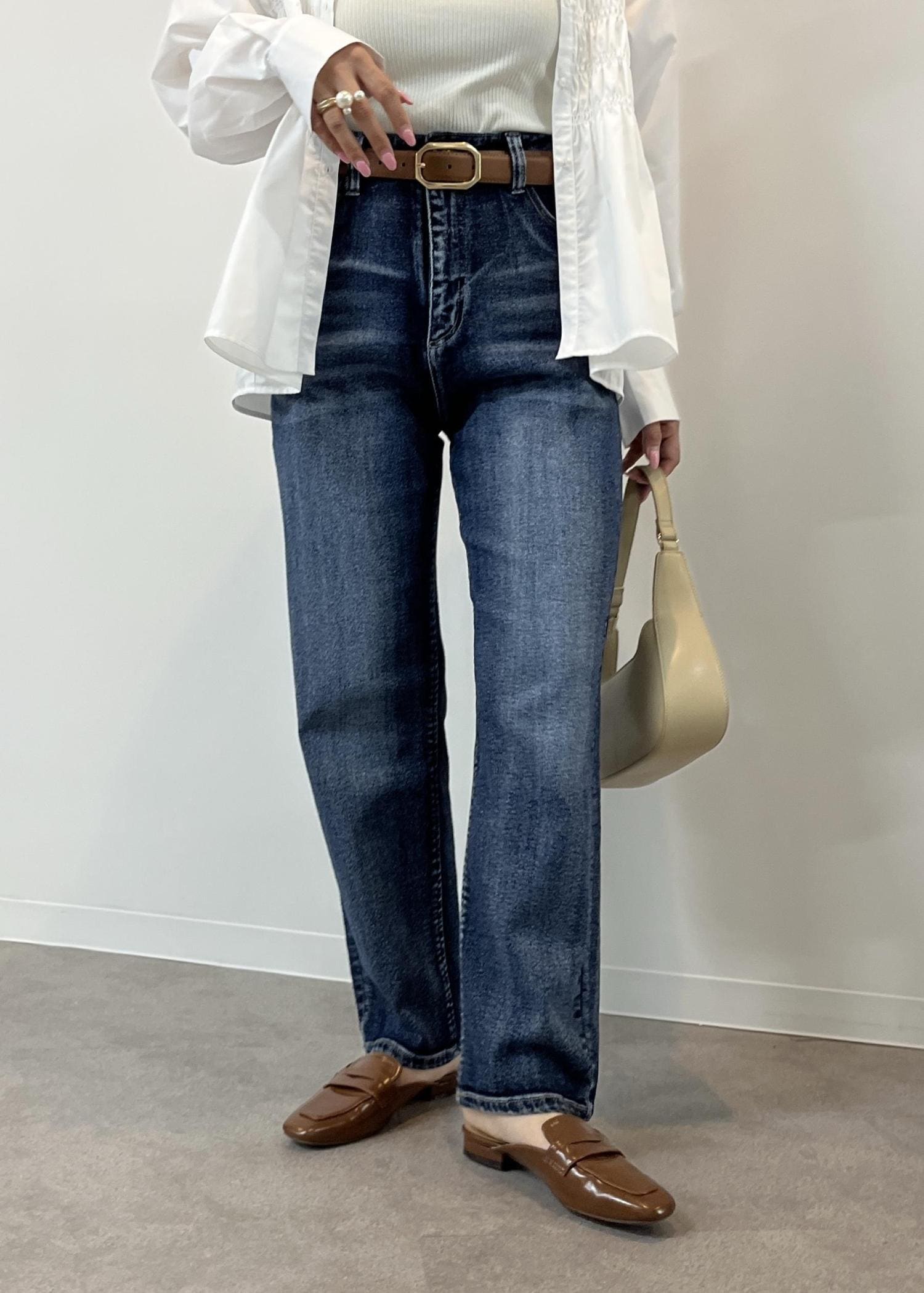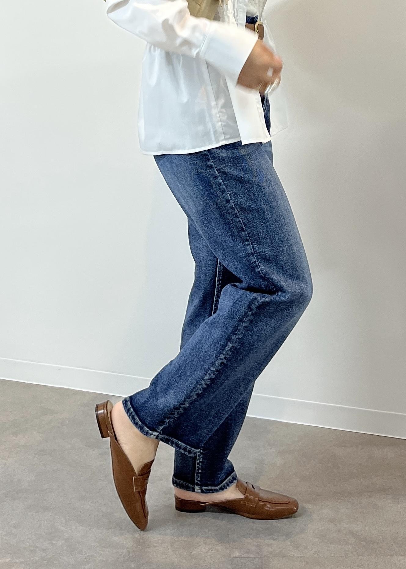 内側のウエスト部分に太めのゴムが入っていて、その効果によりお腹をぺたんこに見せてくれるデニムパンツです!