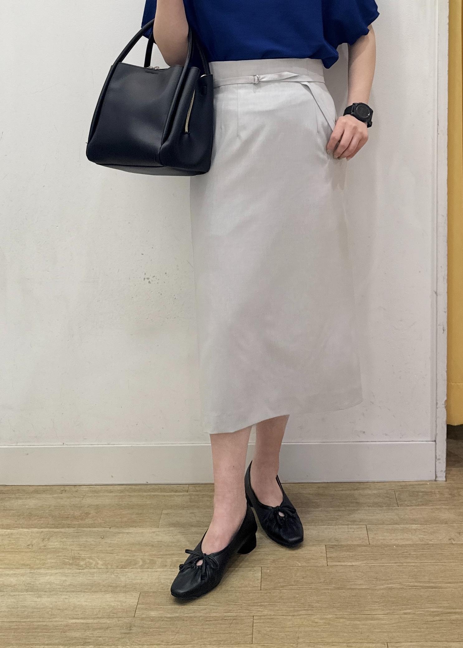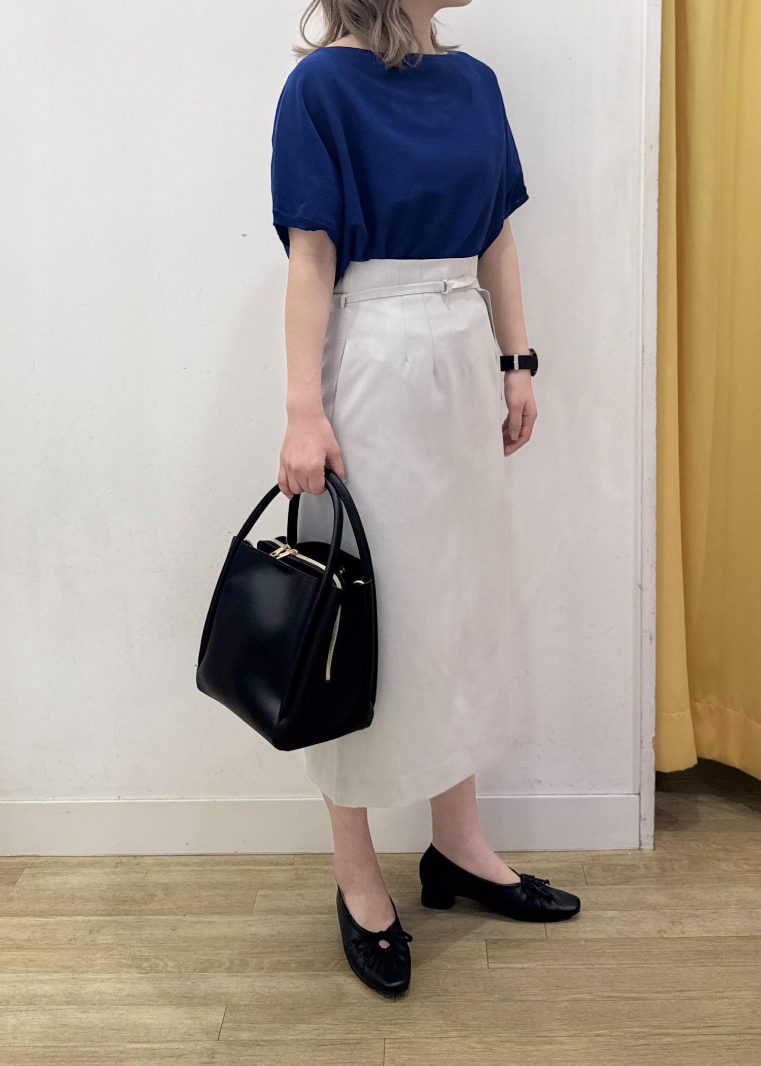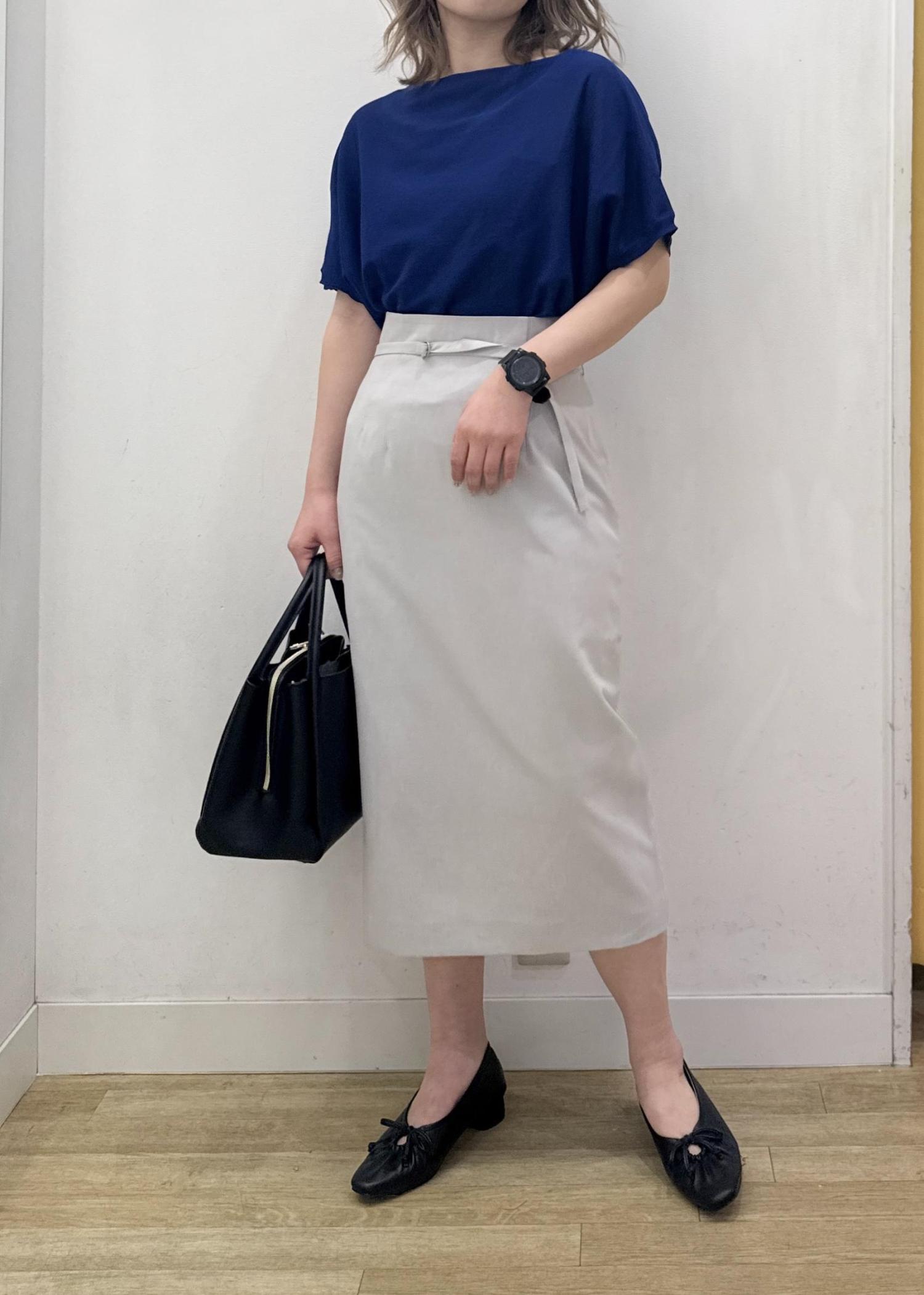スッキリとキレイなシルエットのアイラインスカートに、ゆったりシルエットのニットトップスを合わせてメリハリのあるキレイ見えコーディネートに☺︎