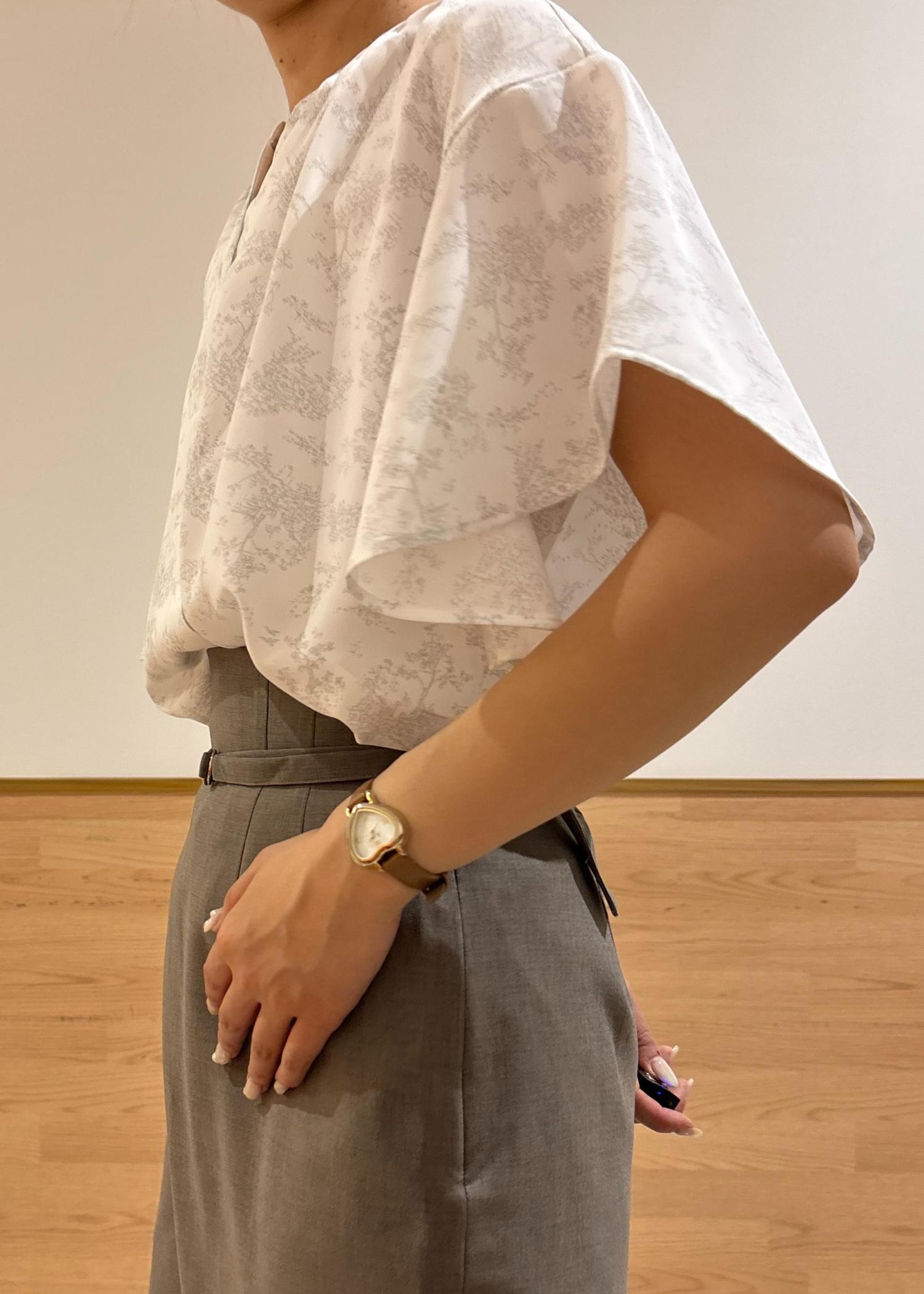 キナリのお花柄シャツにブラウンのスカートを合わせスッキリとしたキレイめコーデにしました。
