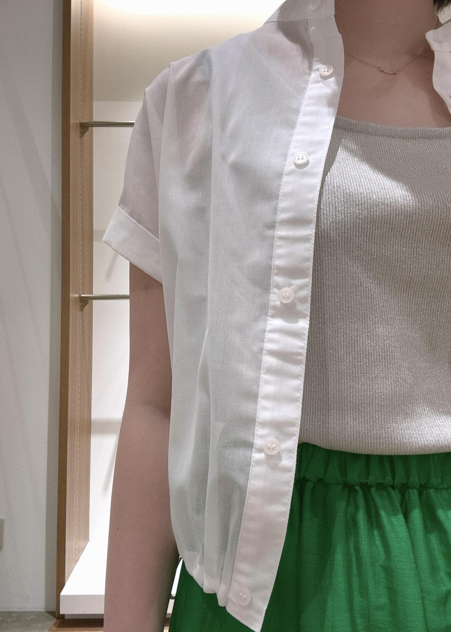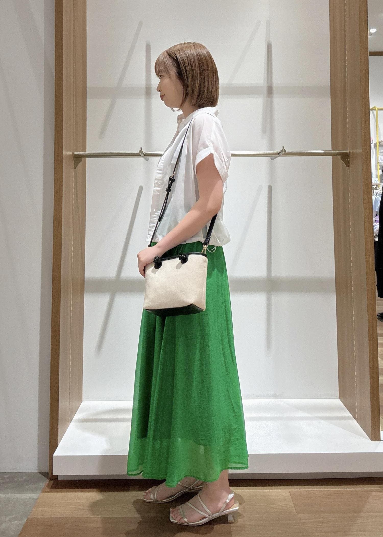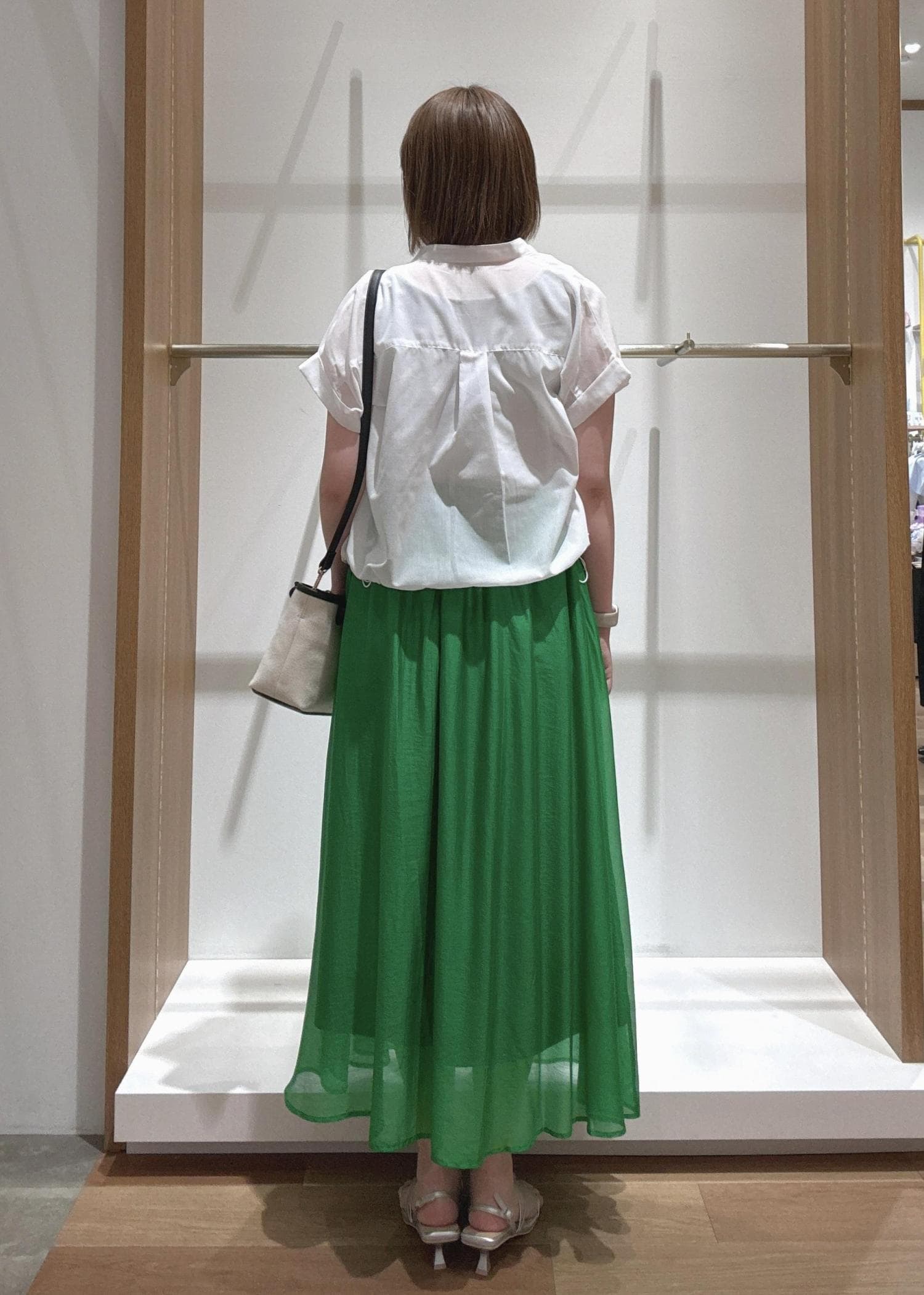 ビビットなグリーンのスカートを主役に、上はシンプルな白のシャツを合わせました。裾部分が絞れるのでふわっとしたシルエットになり、丈も短めでスカートとの相性も良いです◎