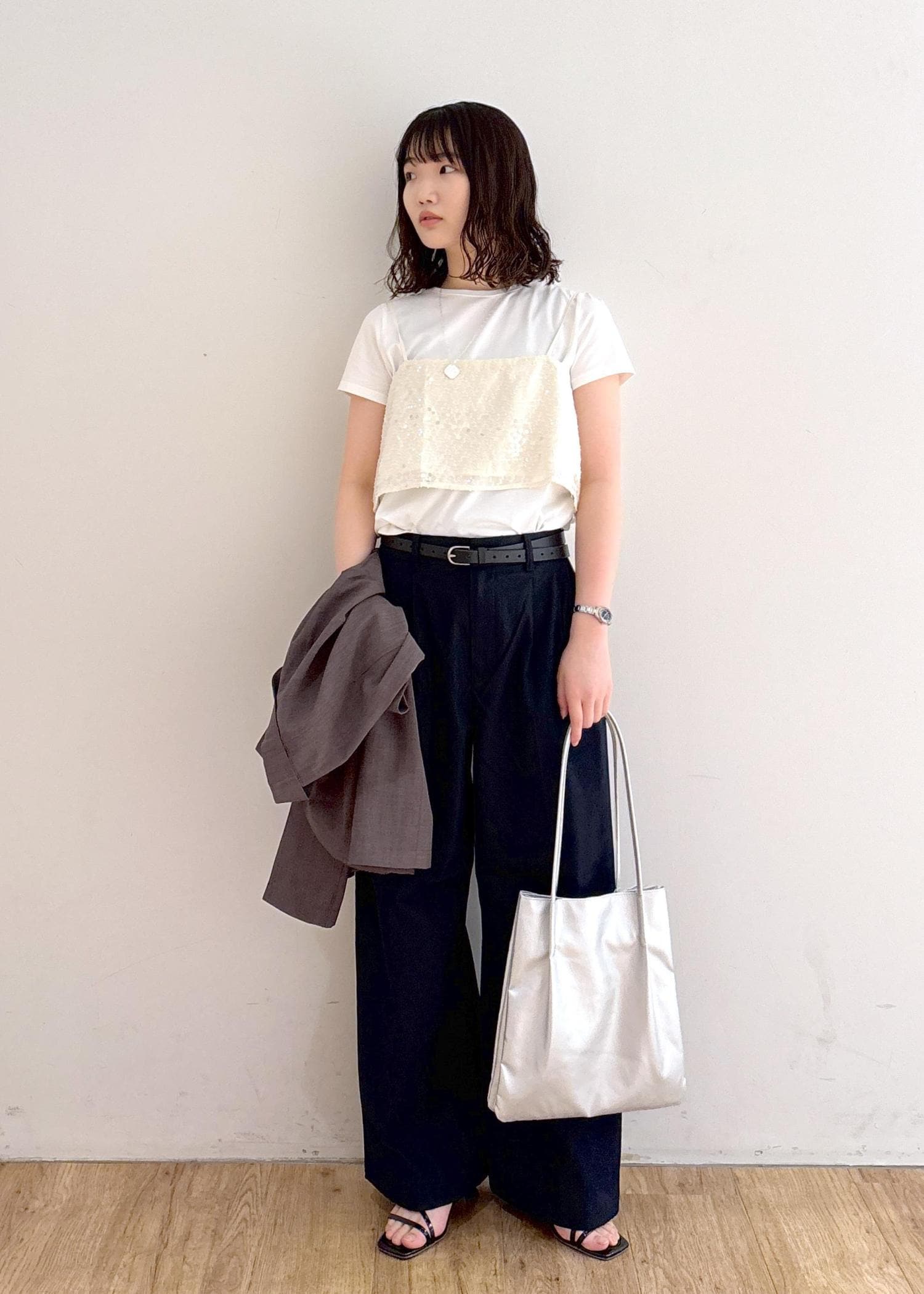 半袖ジャケットをメインにしたきれいめコーディネートです。おしりまで隠れるゆったりシルエットのジャケットなのでワンピースやスカートスタイルにも◯