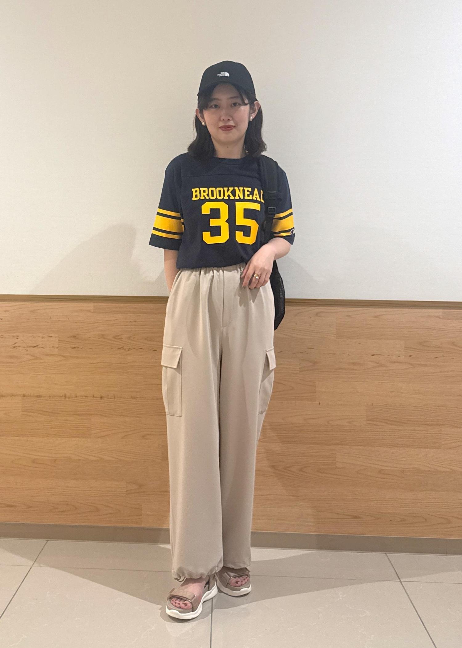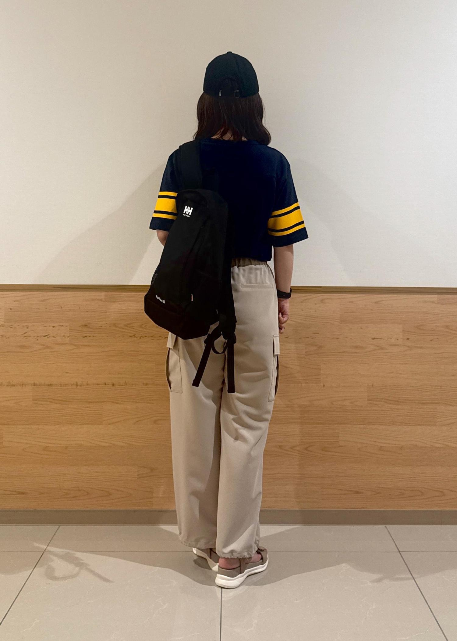 ChampionのオーバーサイズTシャツに、カーゴパンツを合わせ、キャップやスニーカーサンダル、リュックサックでとことんカジュアルに。
