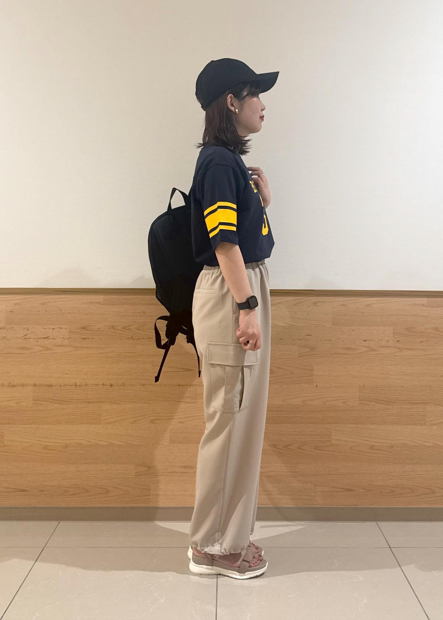 カーゴパンツやスニーカーサンダルをベージュをチョイスして所々柔らかさもプラスすることで、カジュアルコーデが苦手な方も着やすいです!