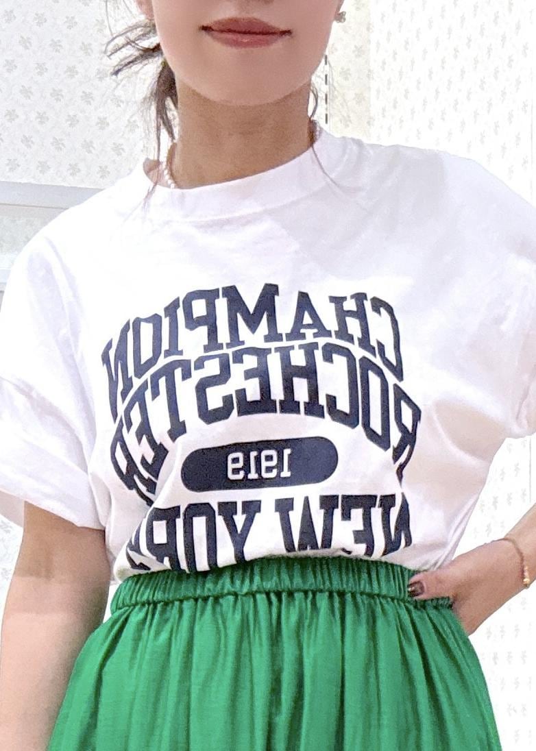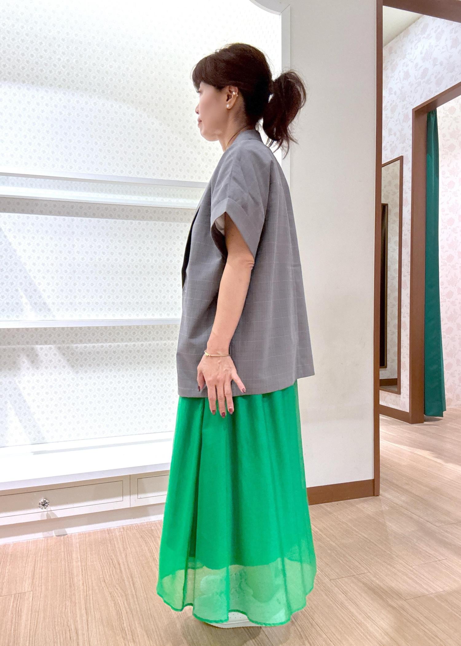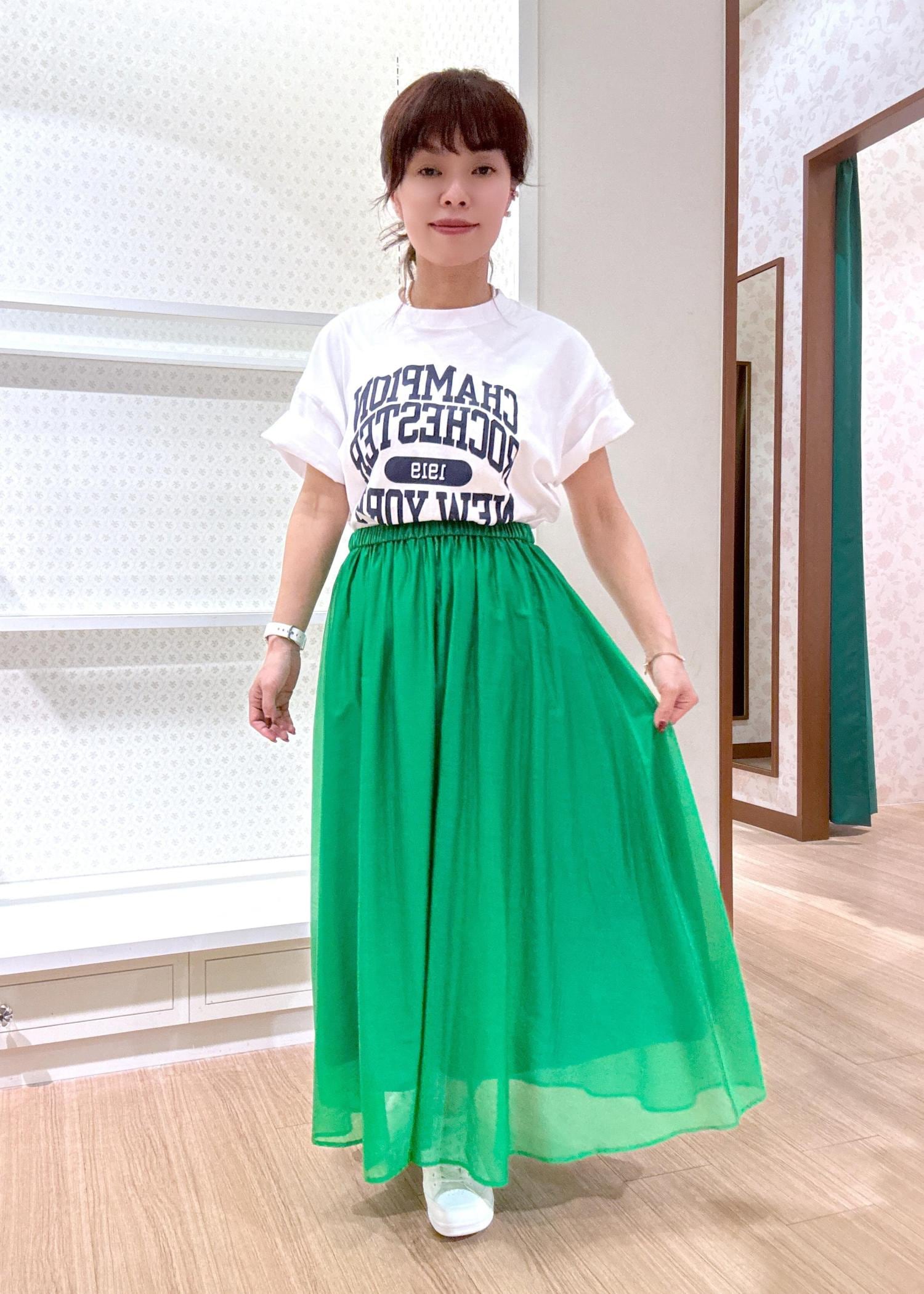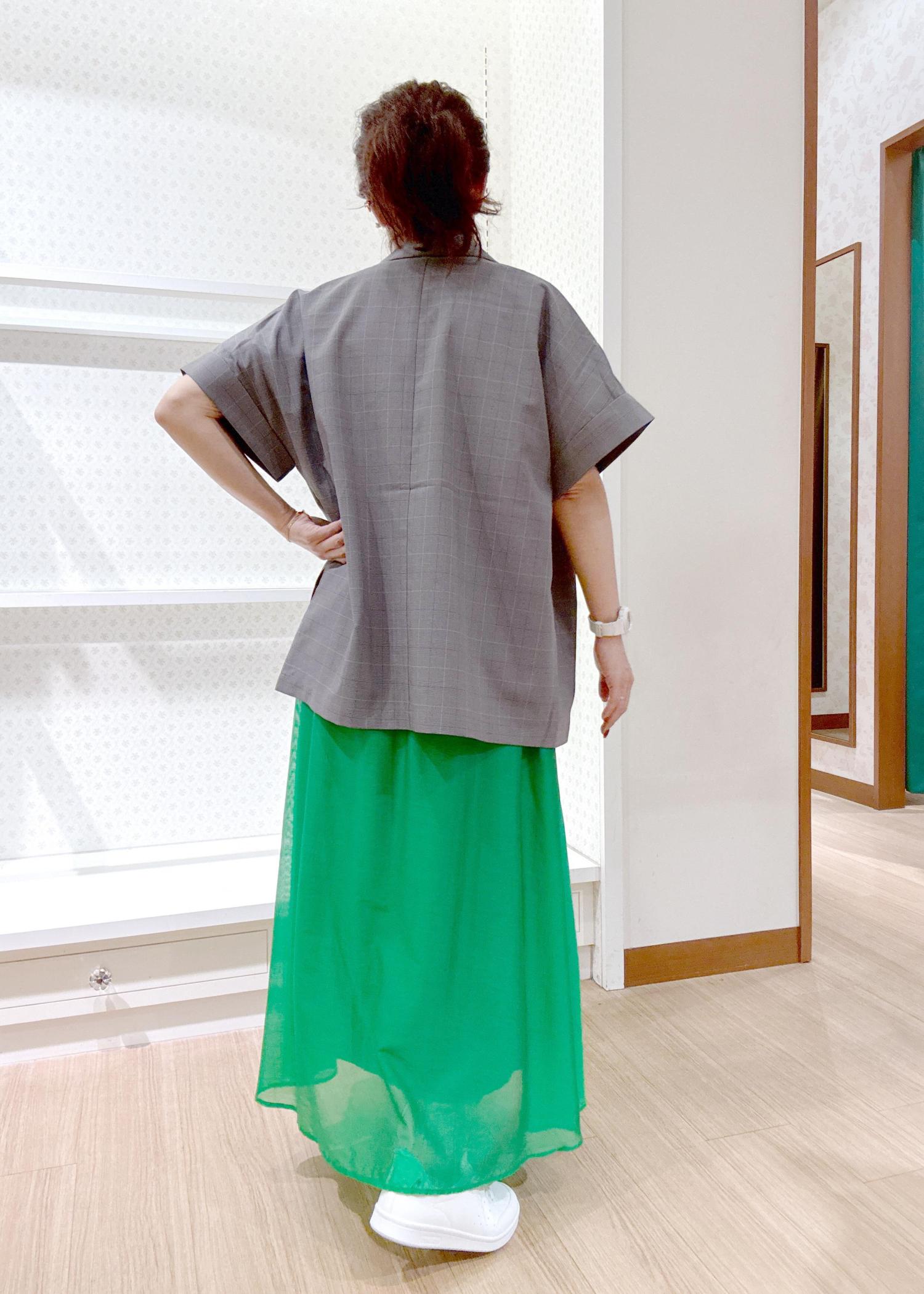 鮮やかなグリーンが目を引くスカートにメンズライクなハーフスリーブジャケットとロゴTでカジュアルと女性らしさを両方取り入れた欲張りスタイルです♡