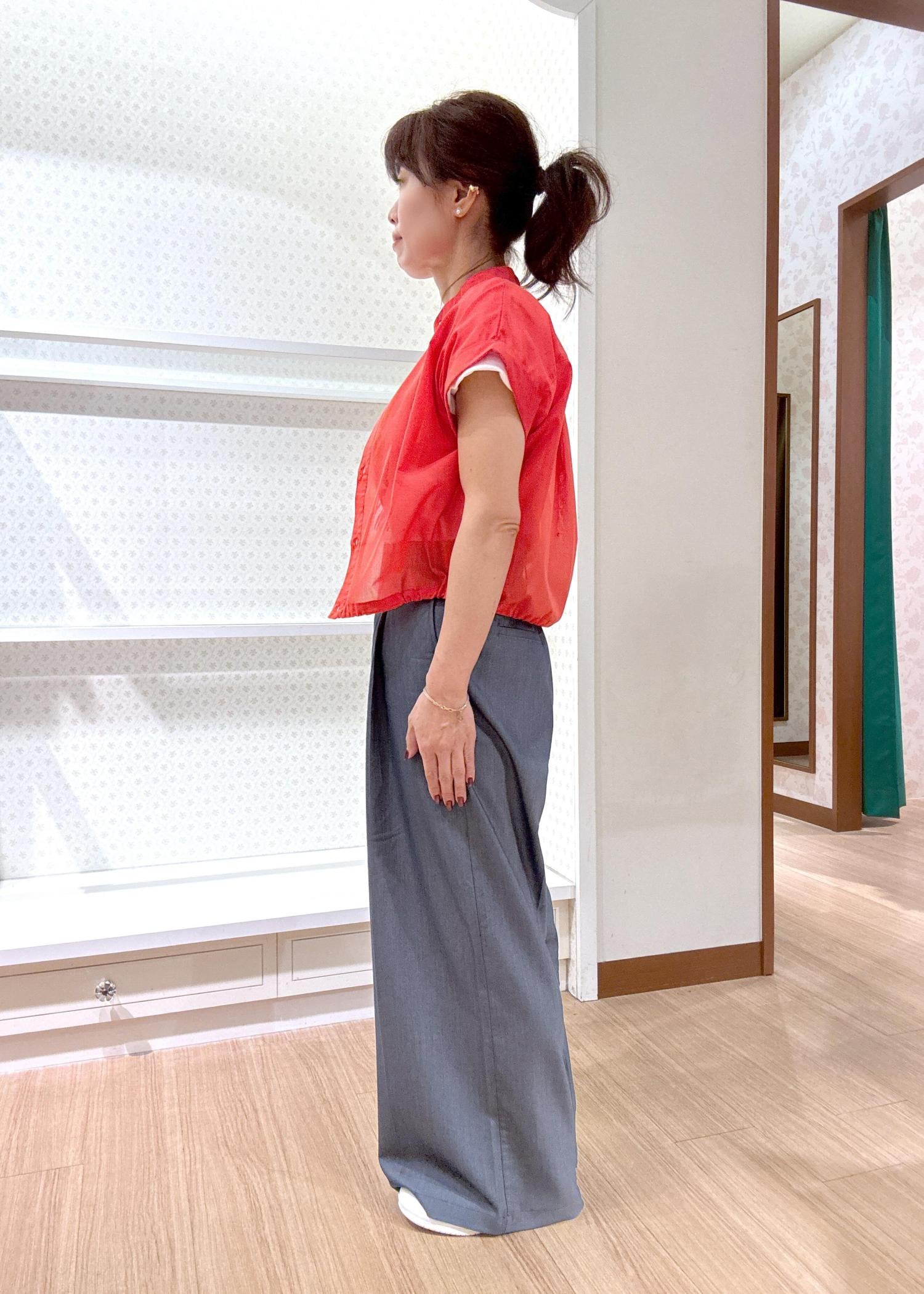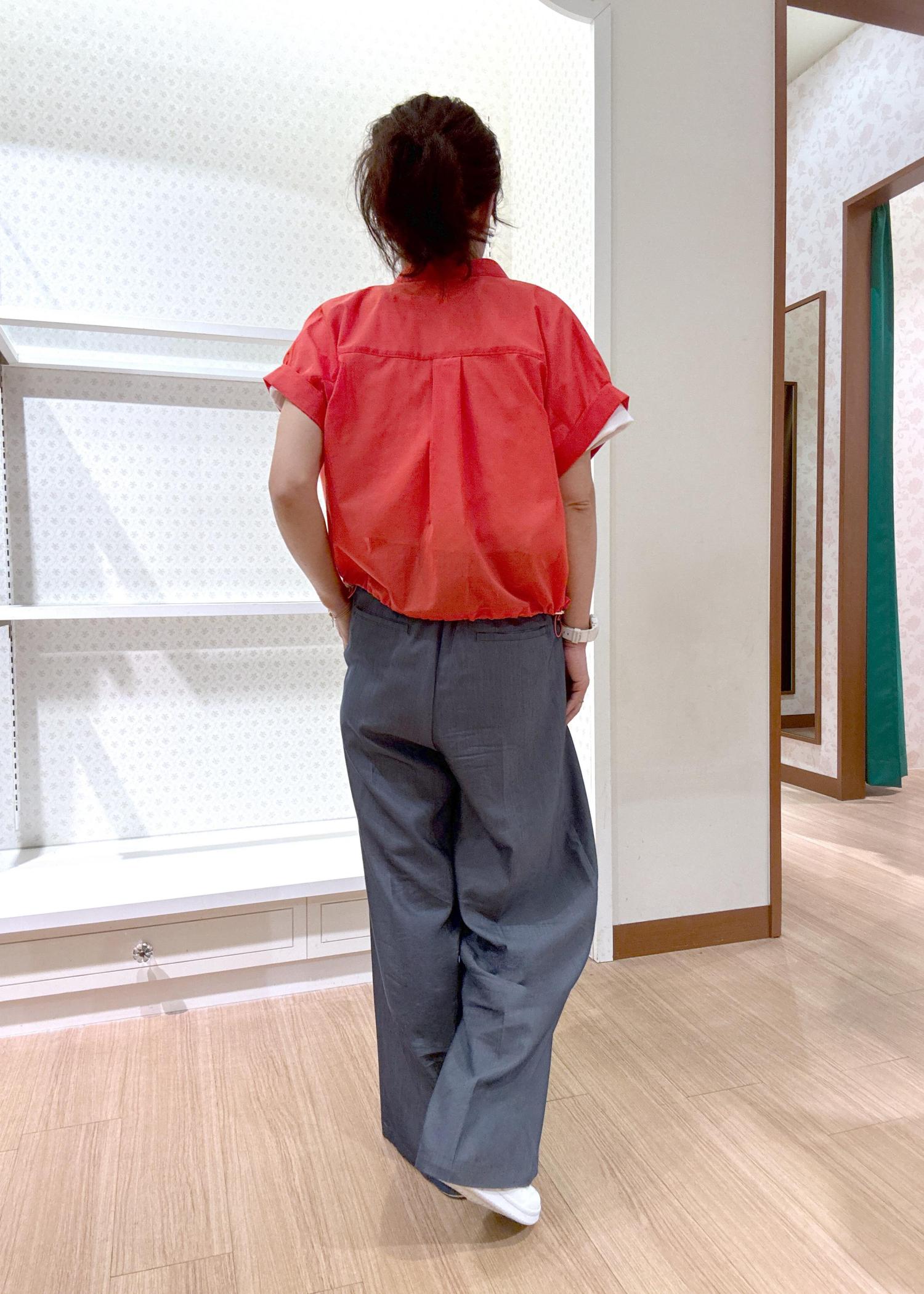着心地:汗をかいてもすぐ乾く。これからの時期にぴったりなビタミンカラーのシャツです。ノーカラーと裾のドロストが丸みがあり、女性らしく着用できます。 -