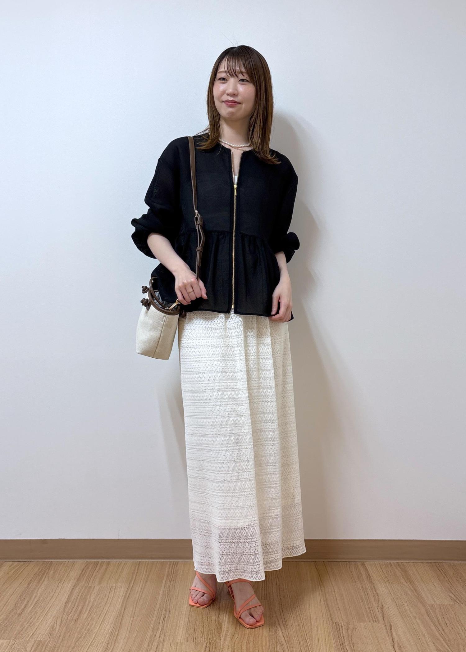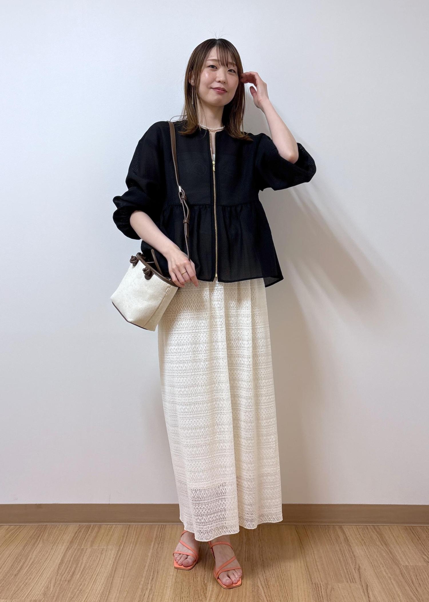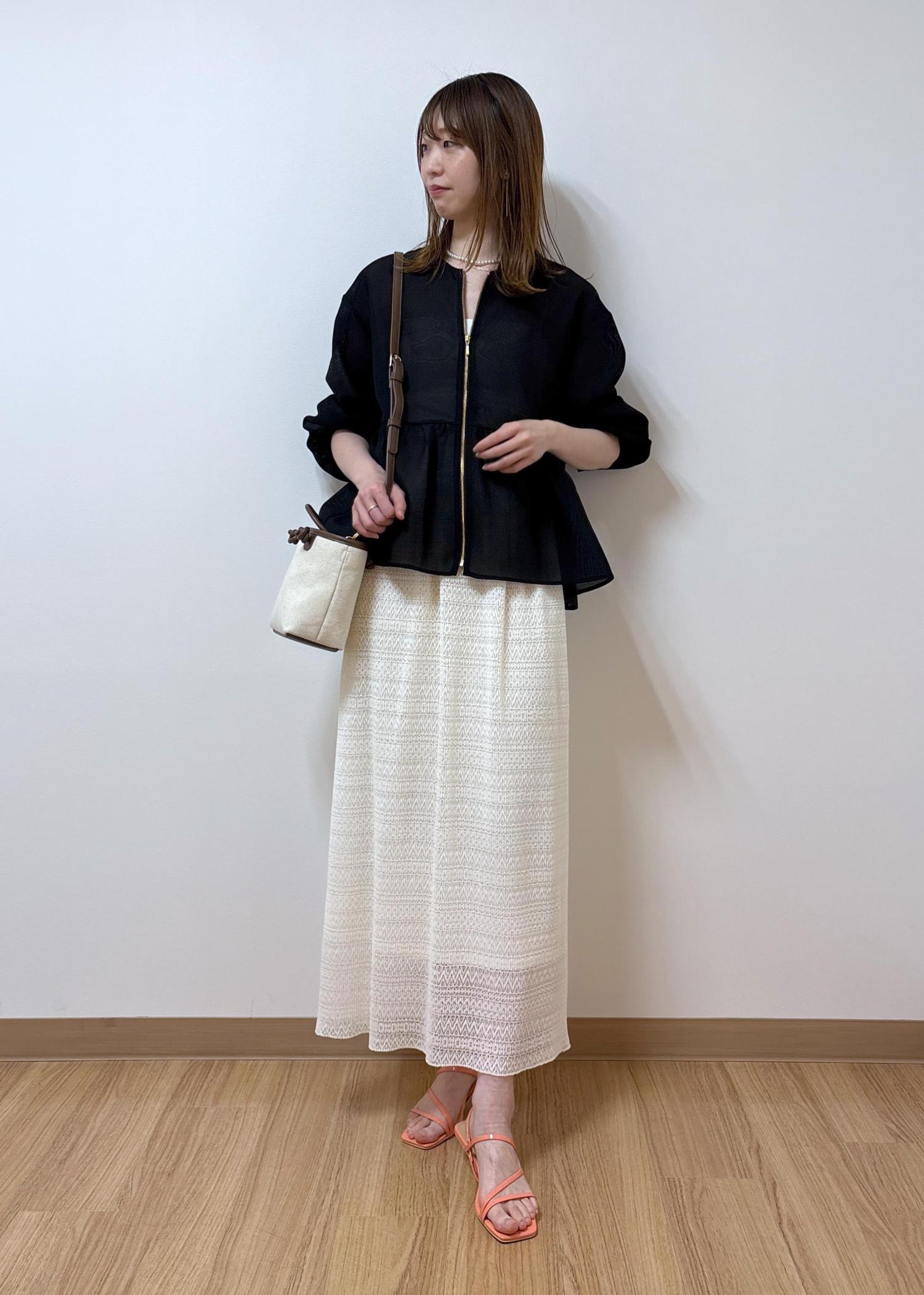 スカート裾の透け感とブルゾンの透け感が軽やかなコーディネートです。