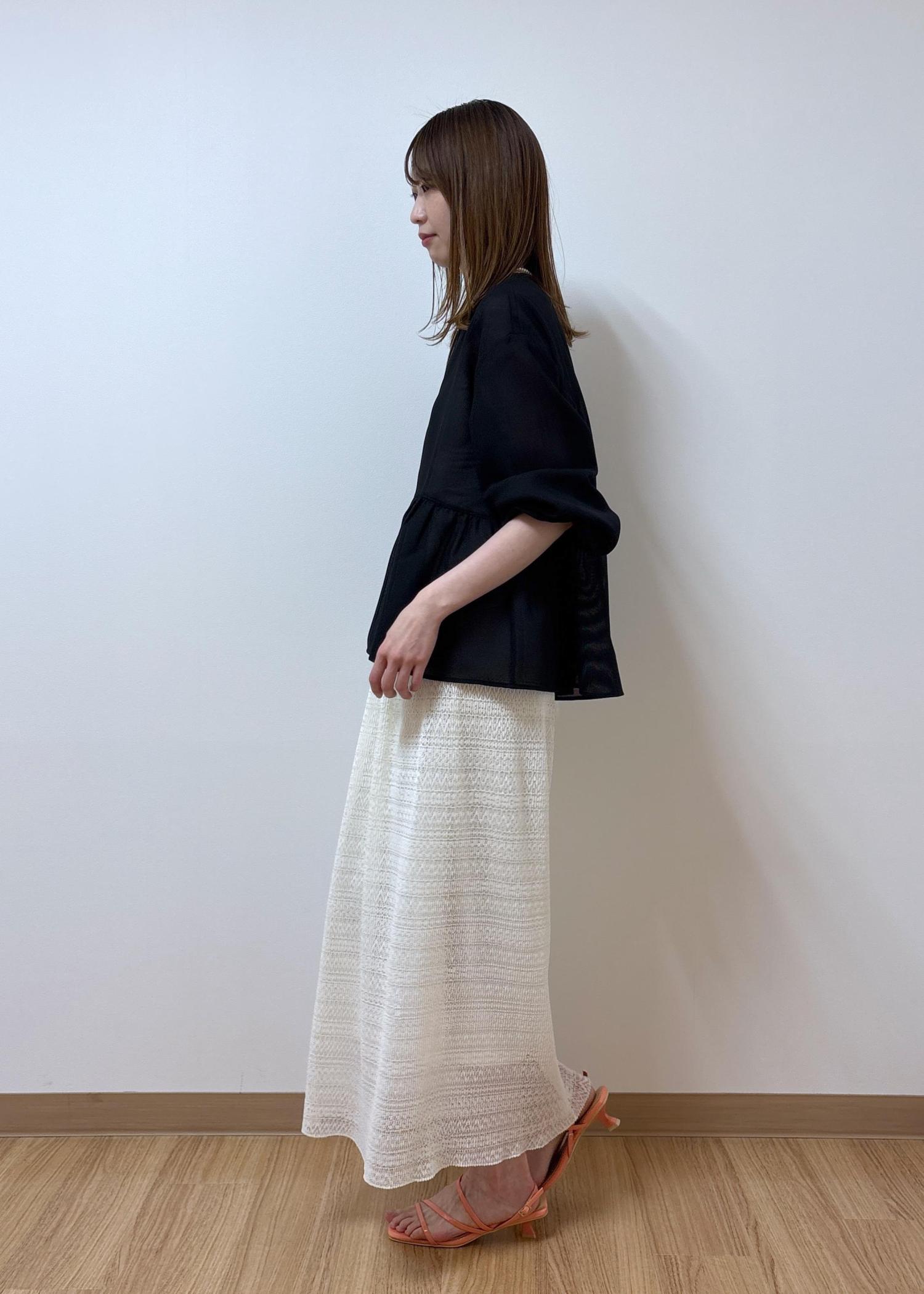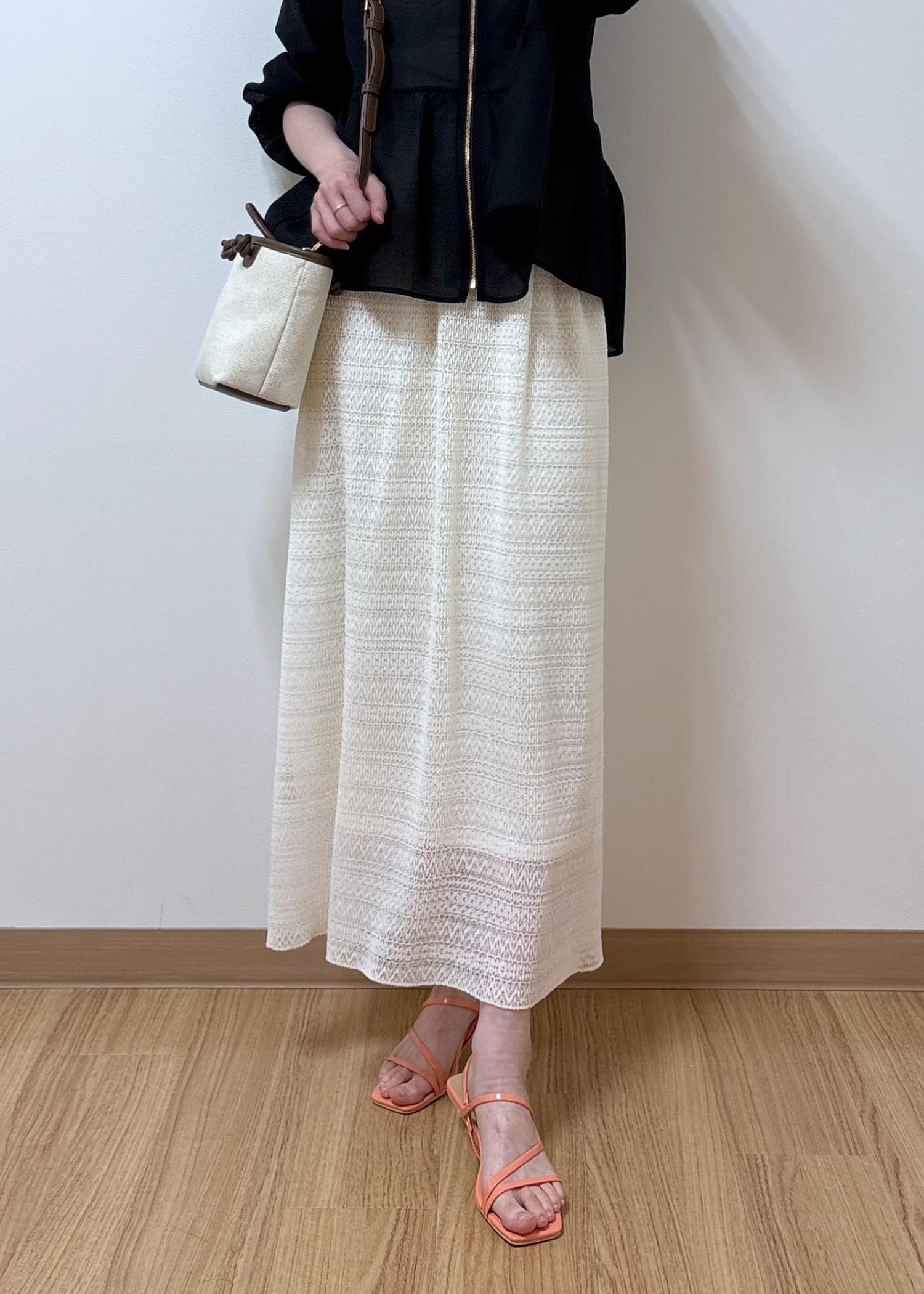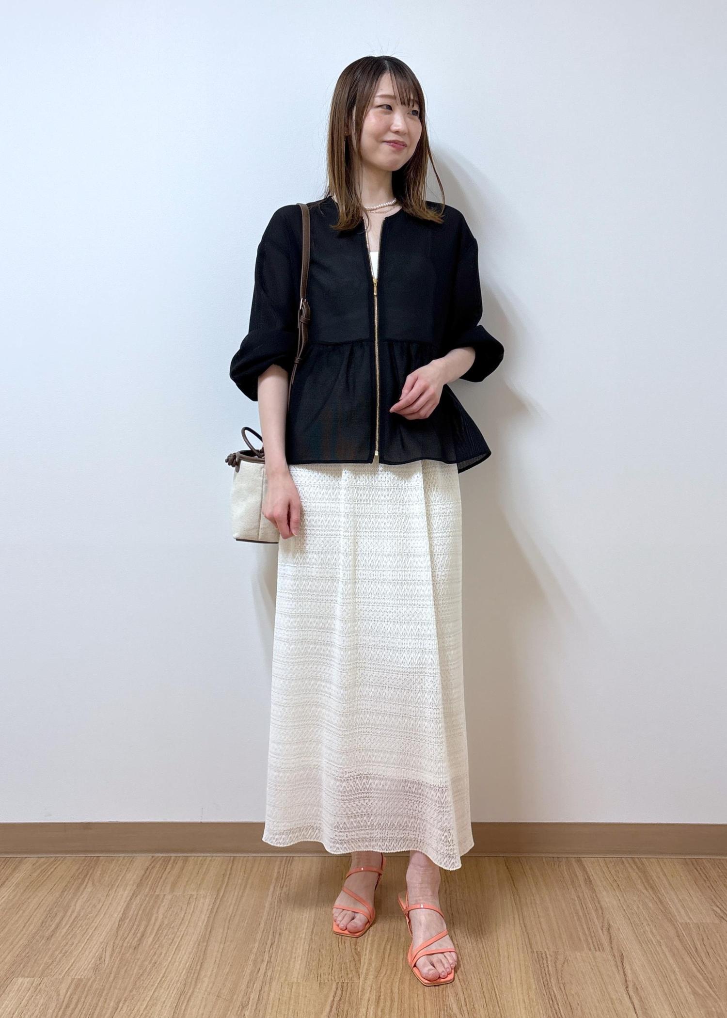 スカート裾の透け感とブルゾンの透け感が軽やかなコーディネートです。