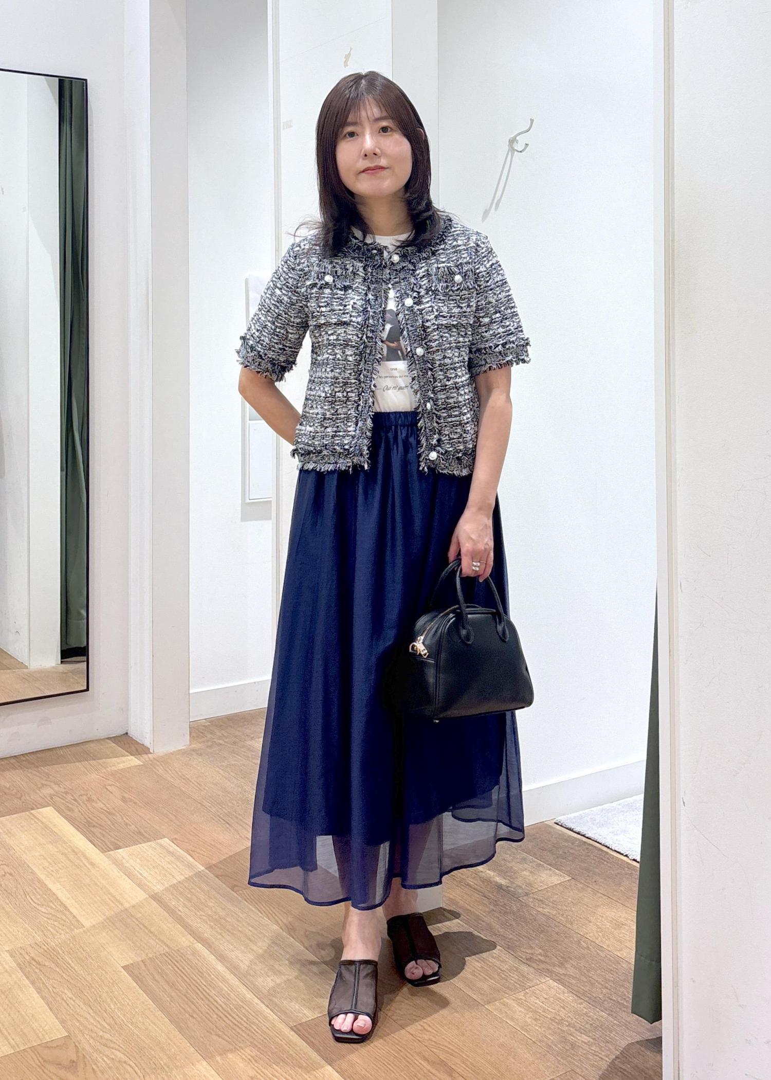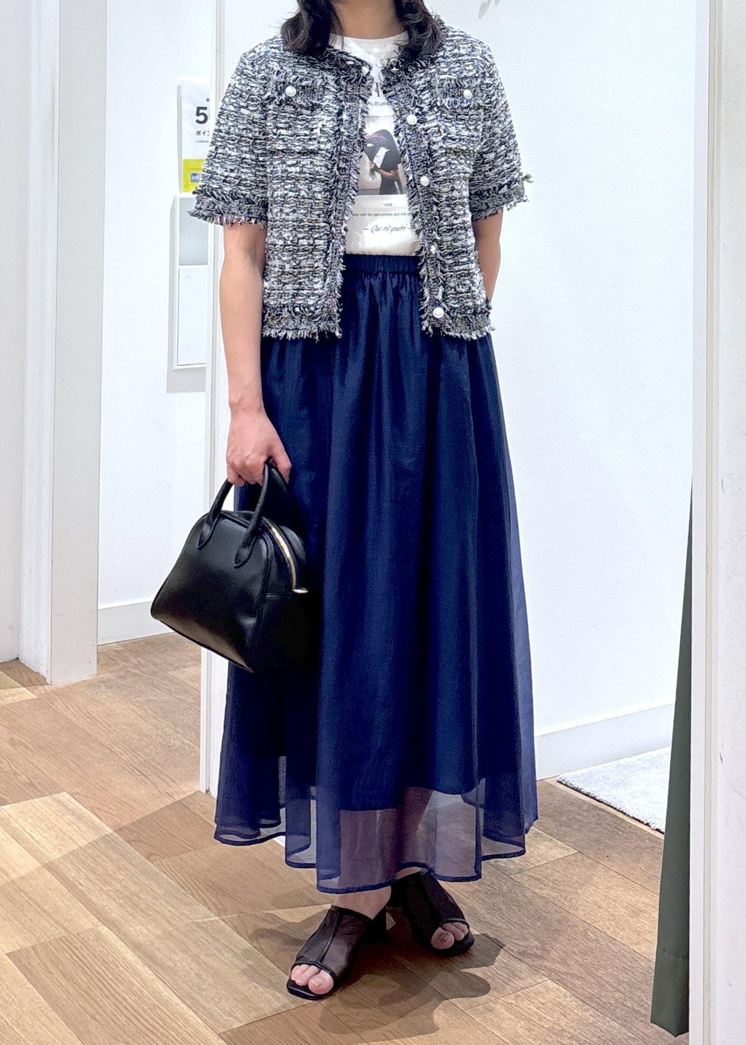 鮮やかなブルーのスカートと合わせたお出かけコーディネートです♪