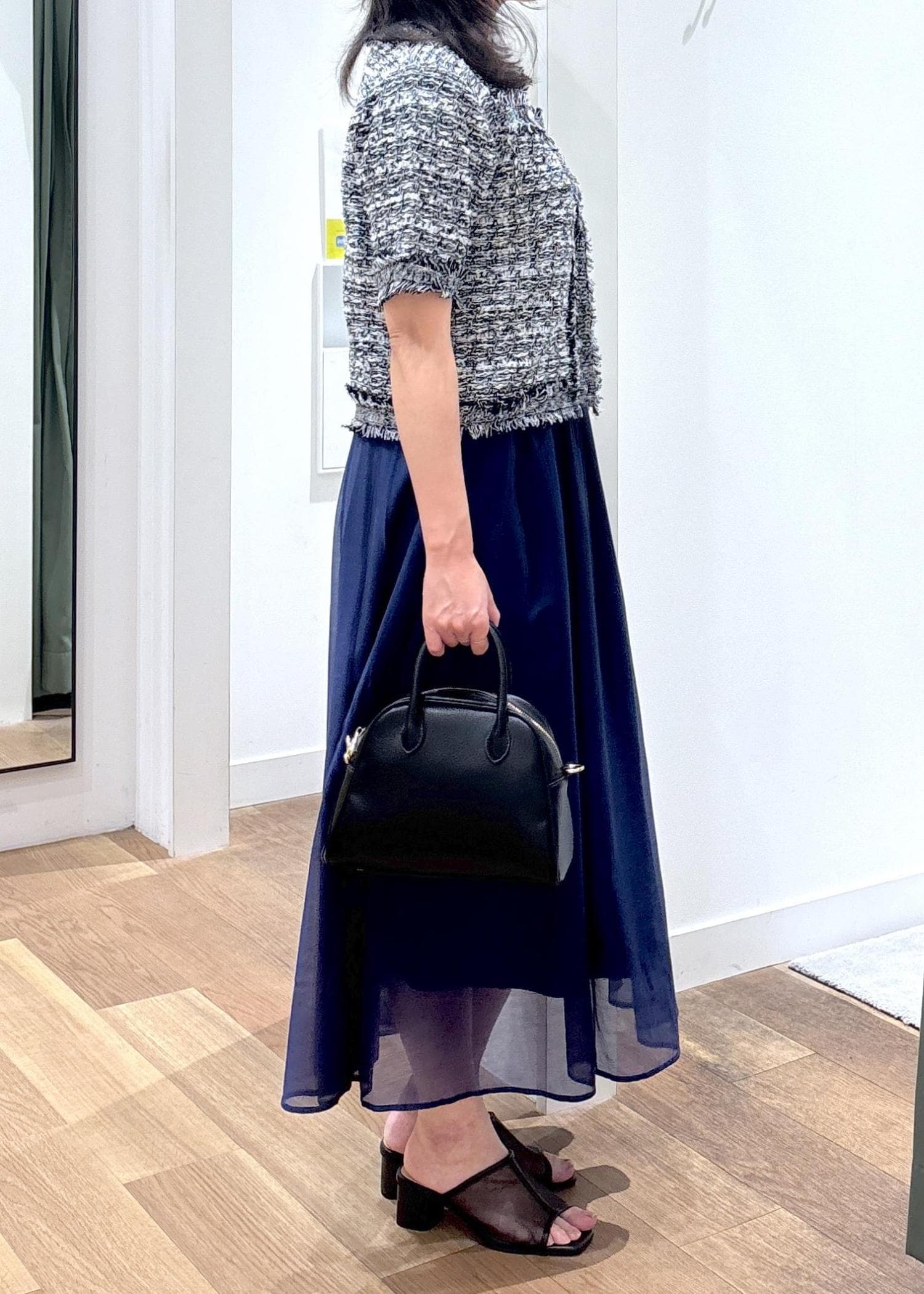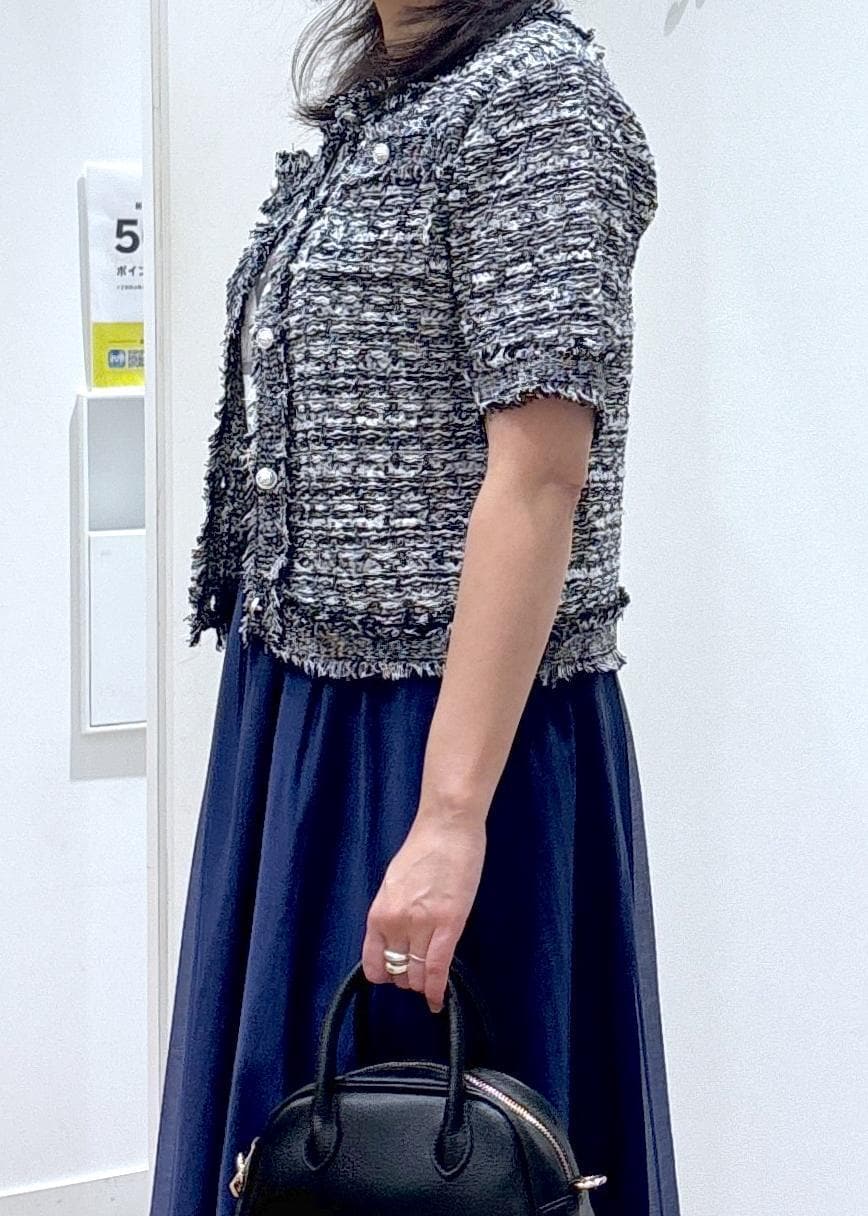 きちんと感のあるこちらの羽織りですが、実はツイードジャケットに見えるカーディガンなんです♪