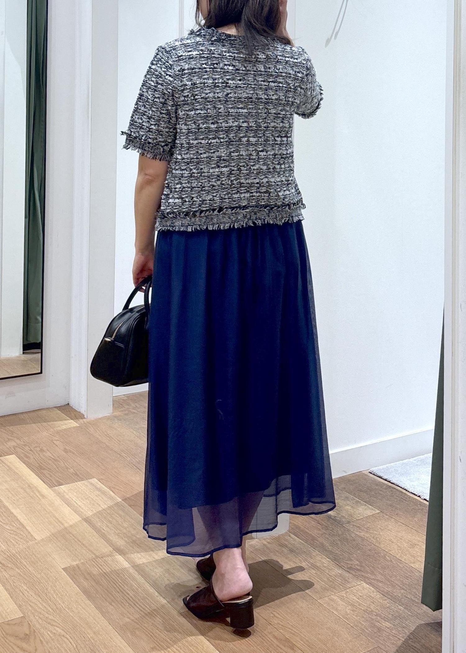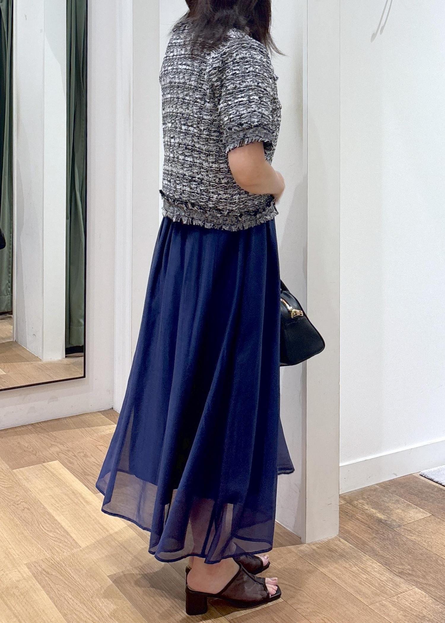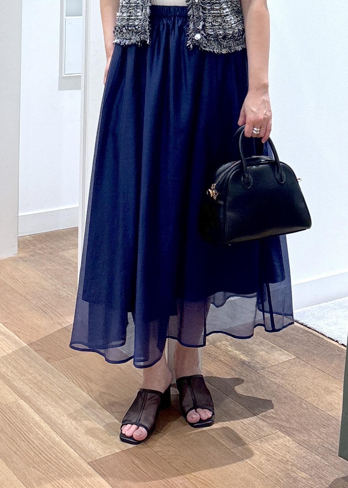 ROPÉ PICNICエアリーシアーギャザーロングスカートネイビー / 38¥6,490レビュー裏地が短めなので、裾に透け感があり軽やかな印象です。