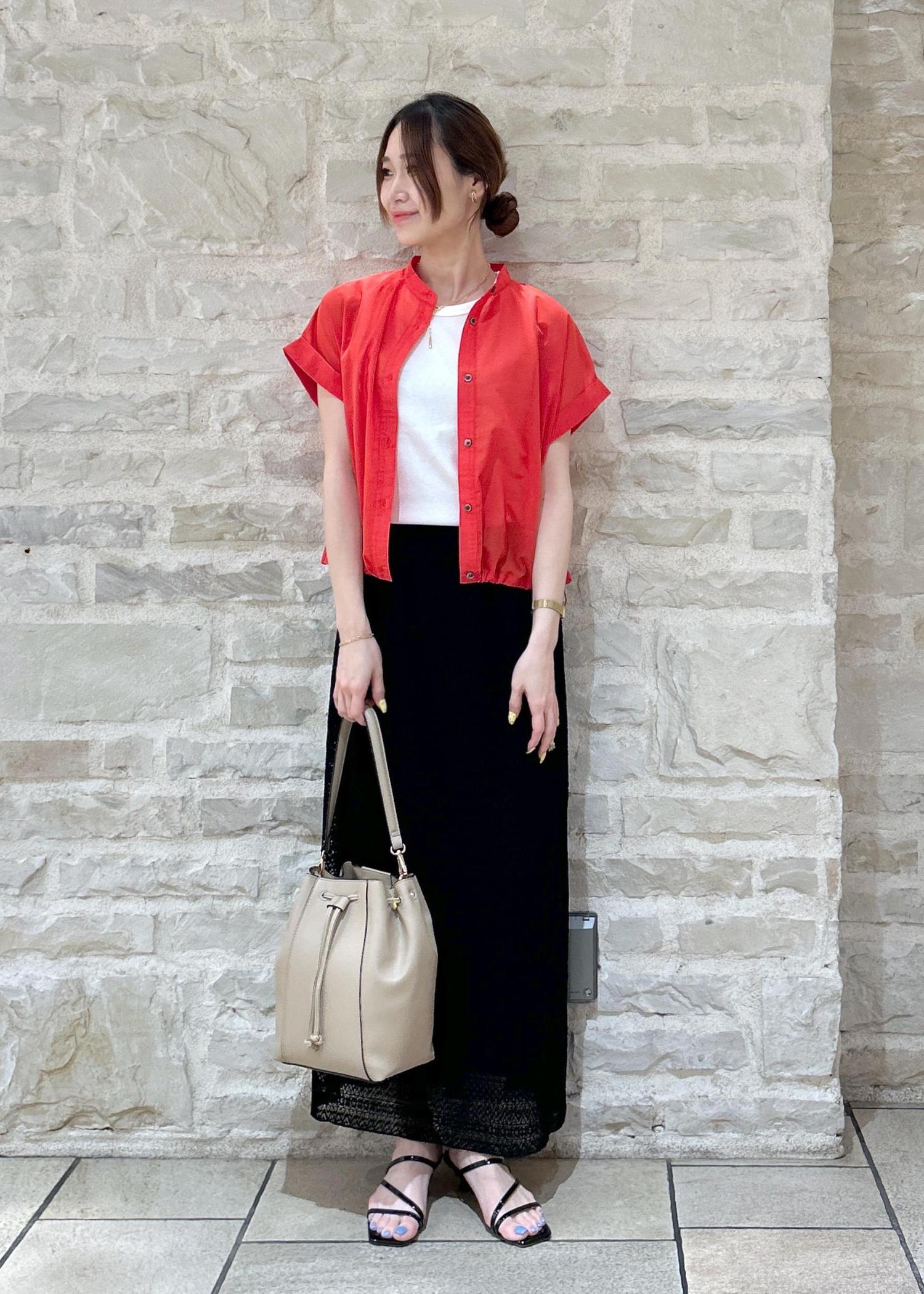 カラーシャツにスカートはブラックで大人キレイめなスタイリングにしました。