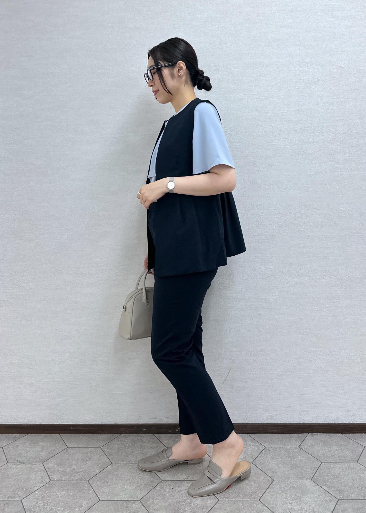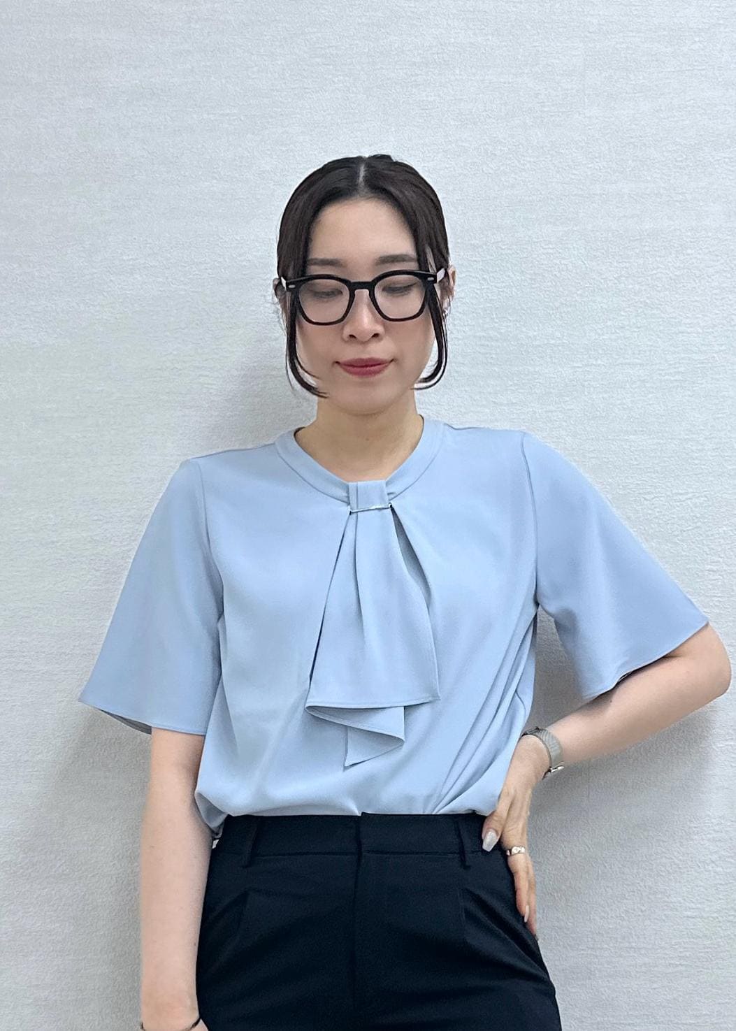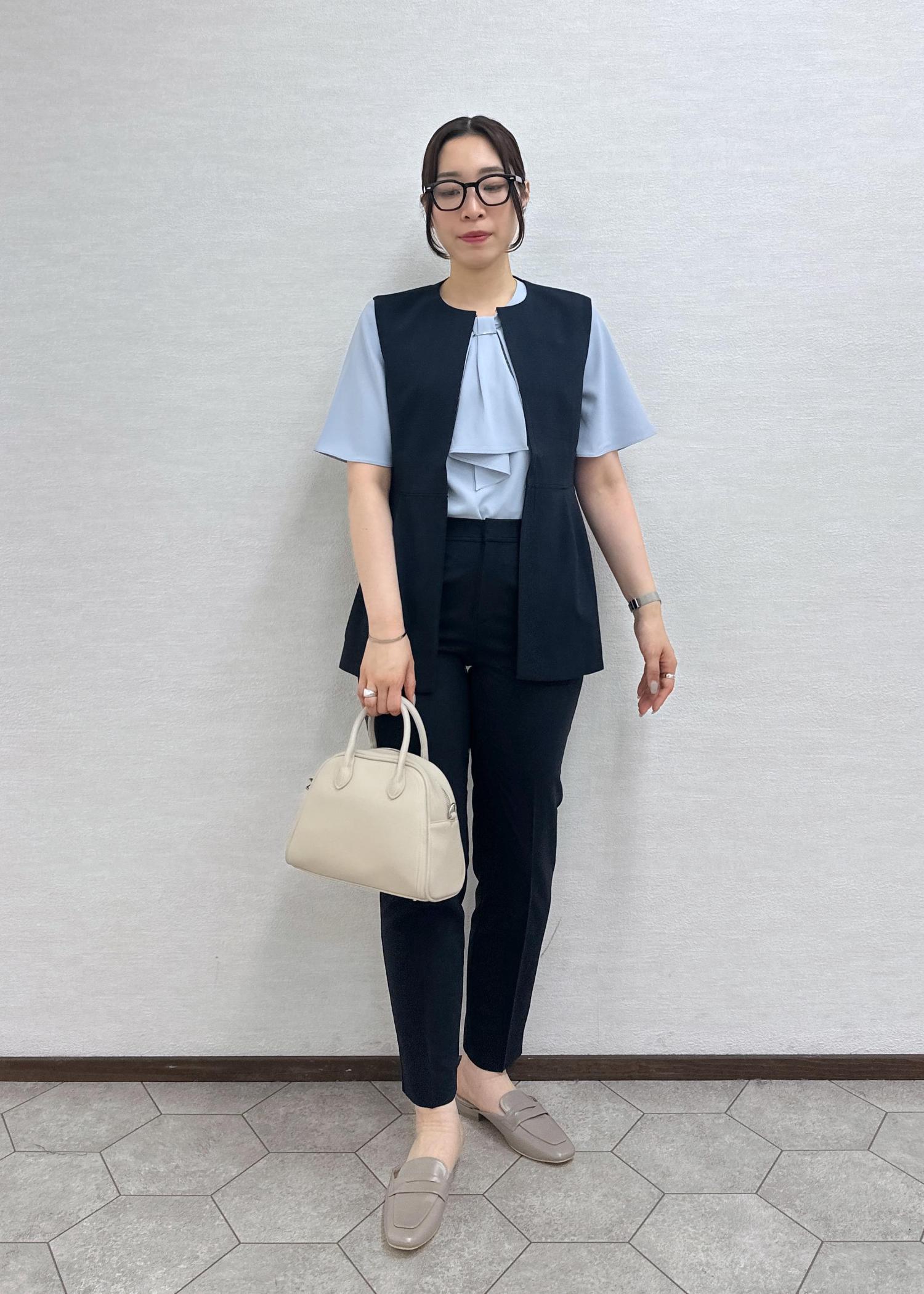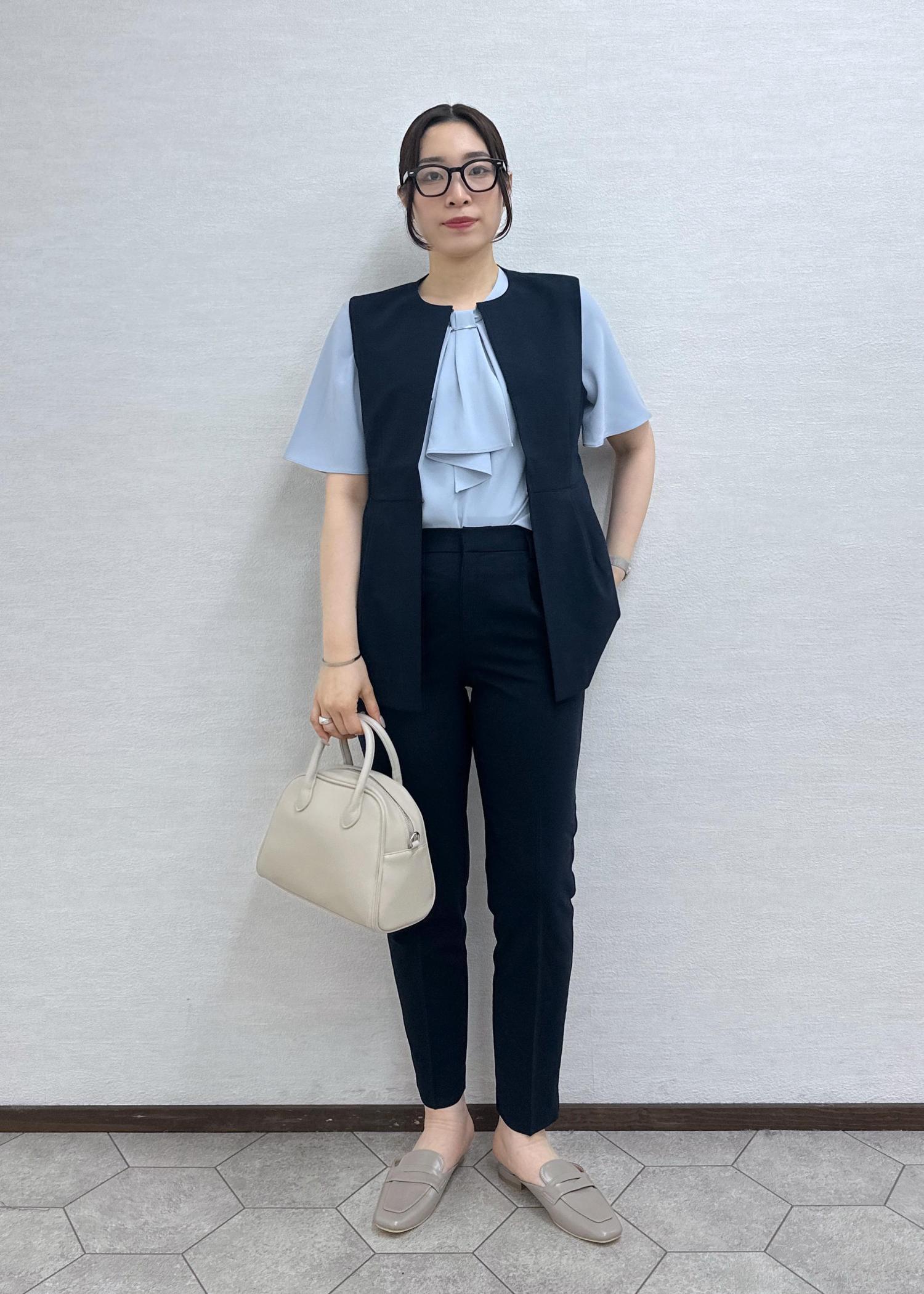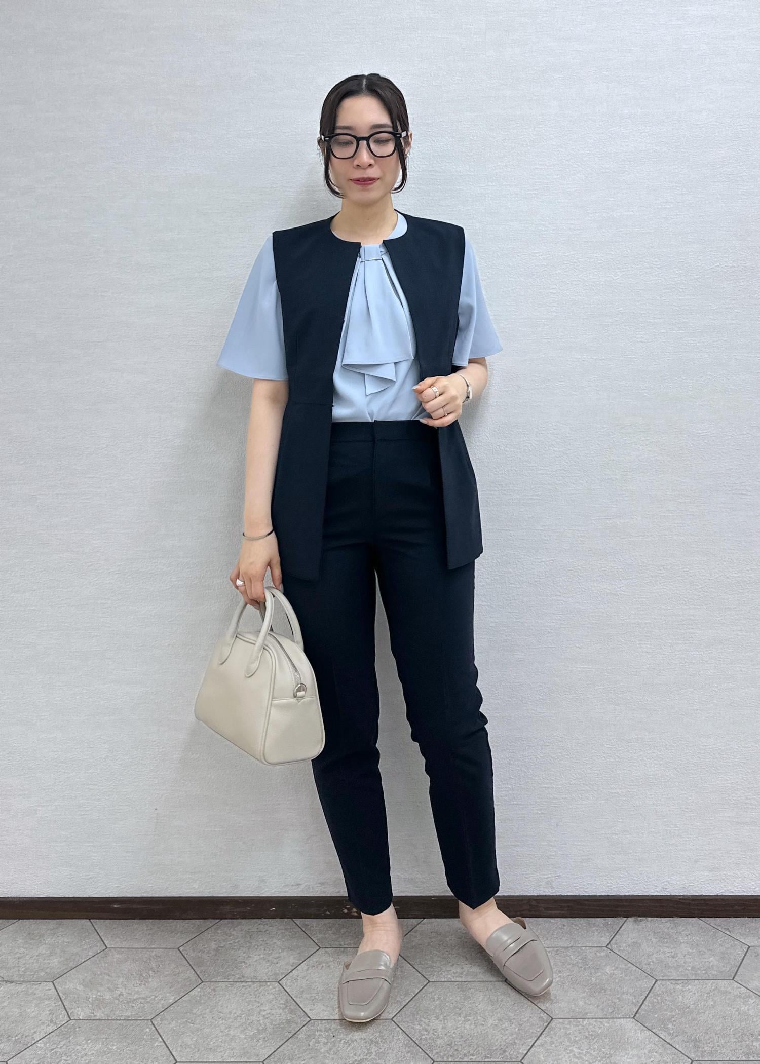 夏素材のセットアップに爽やかなブルーのブラウスを合わせました。