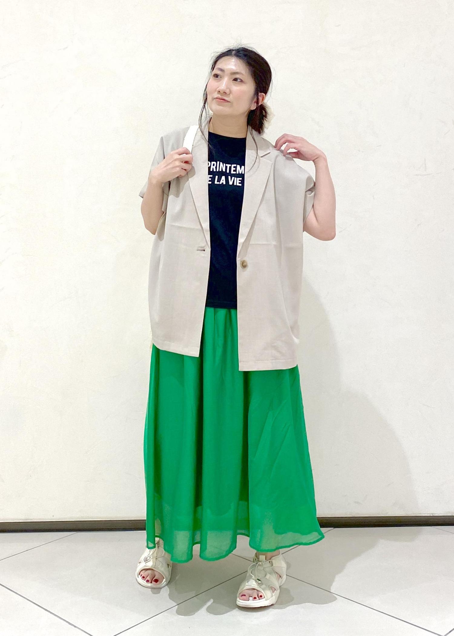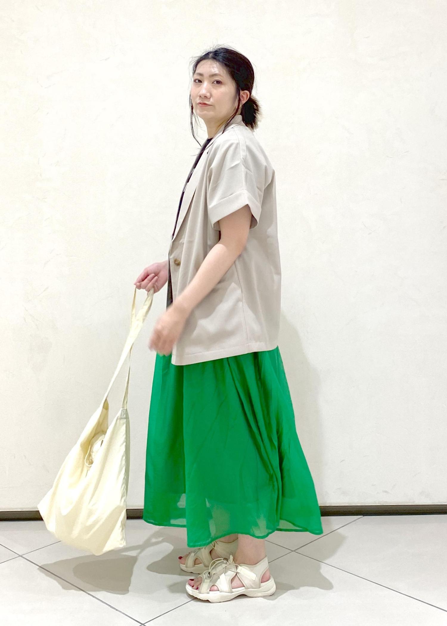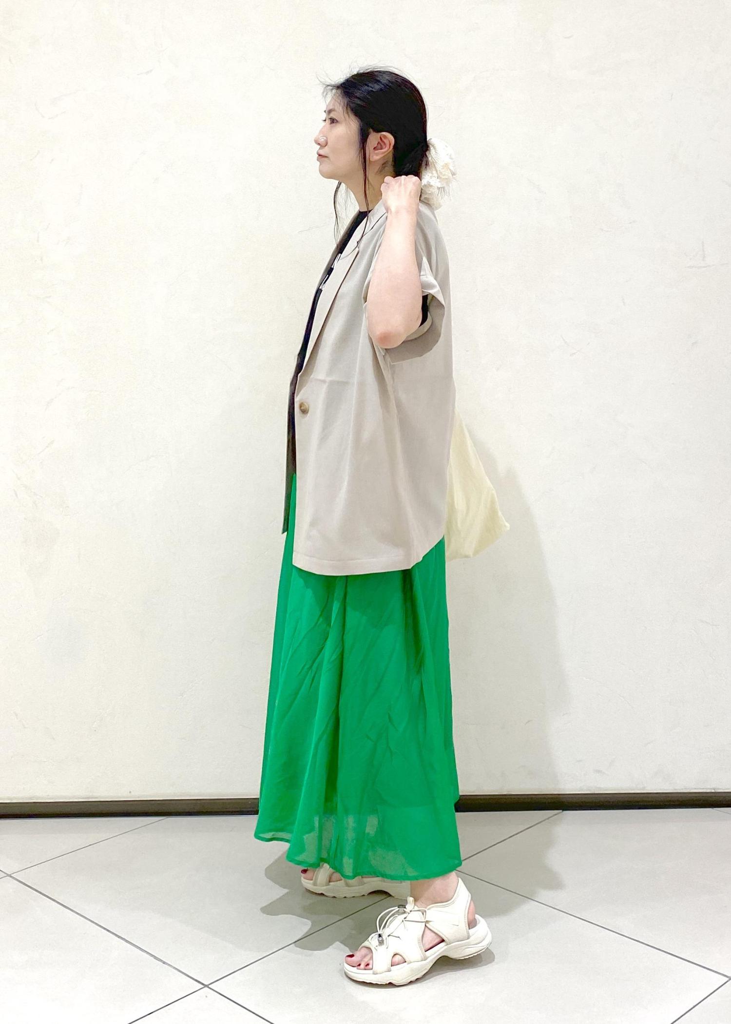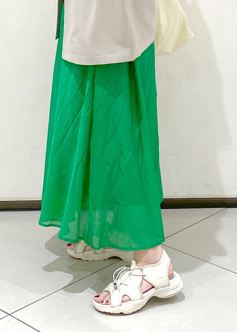 夏用のロングのフレアと言えばコレ!というくらい涼しく軽い履き心地です。明るいカラーもトップスで着るより顔まわりから離れた箇所で挑戦しやすいですよ。私の身長でそこまでヒールがなくても履けるので、150cm前半の身長の方もぜひお試しください。
