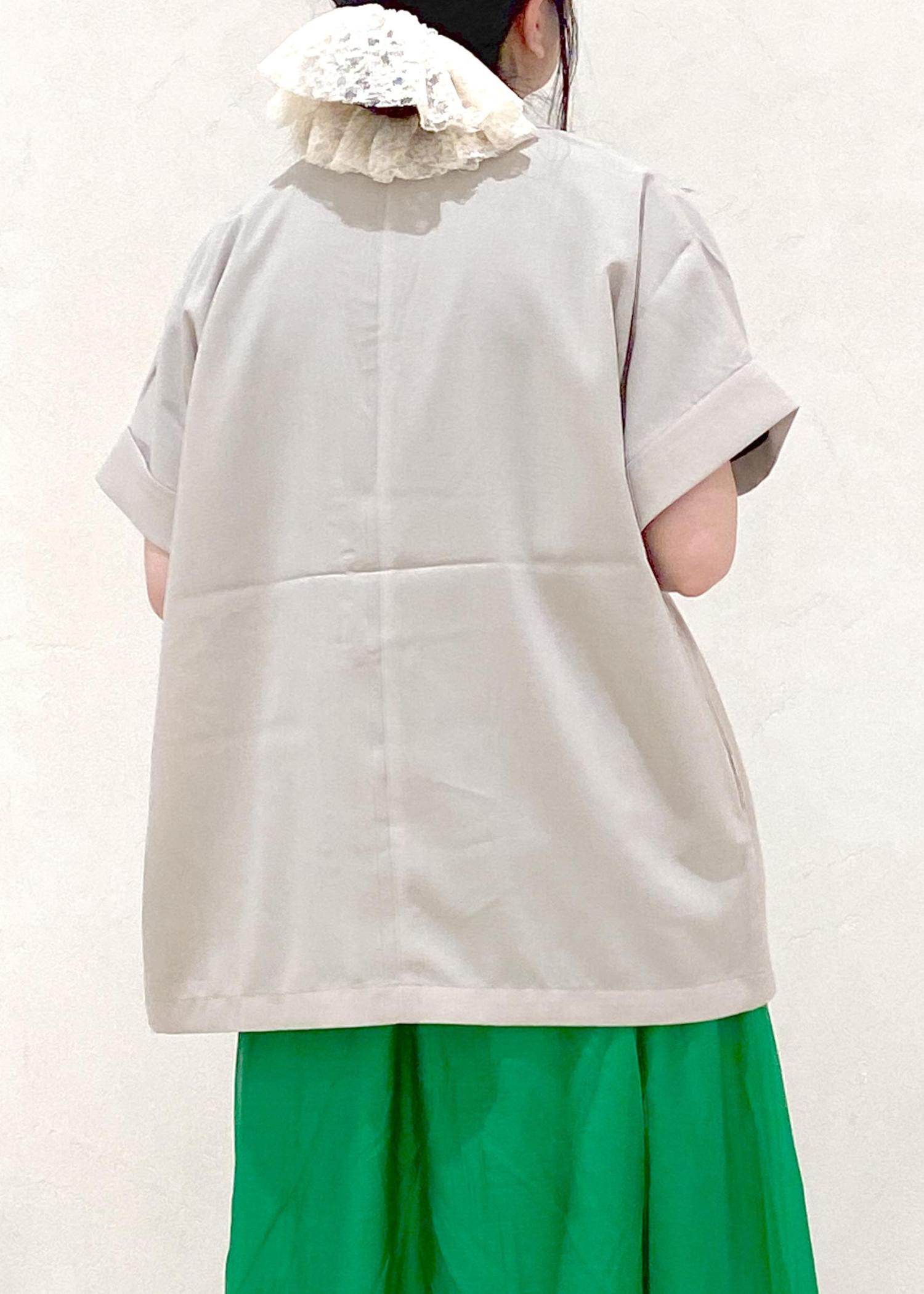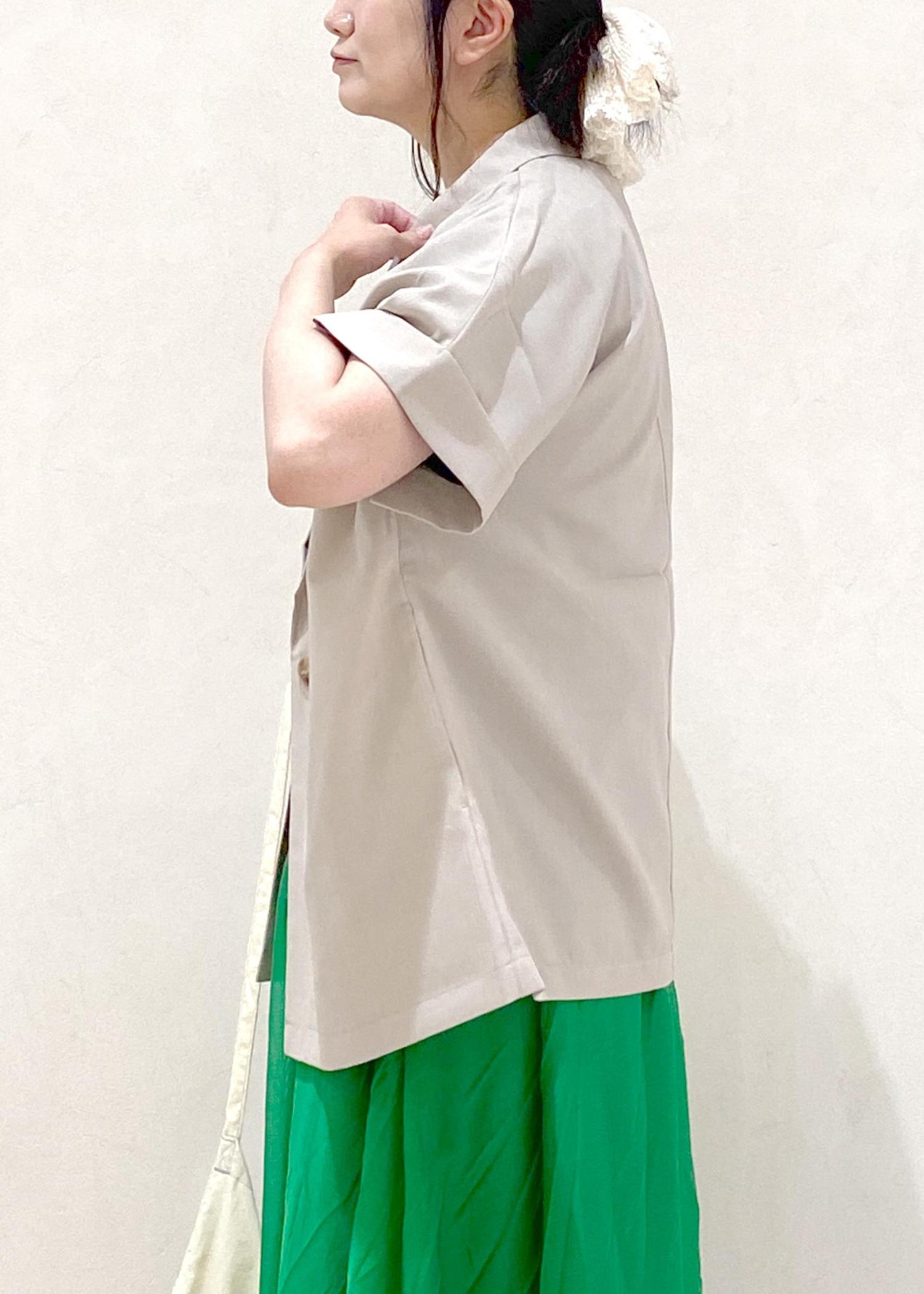 シャツのような着心地。幅があり、肌離れするので汗かく時期も着用しやすい羽織です。ヒップラインも隠れるので、体型カバーしたい方にも安心の丈感です。