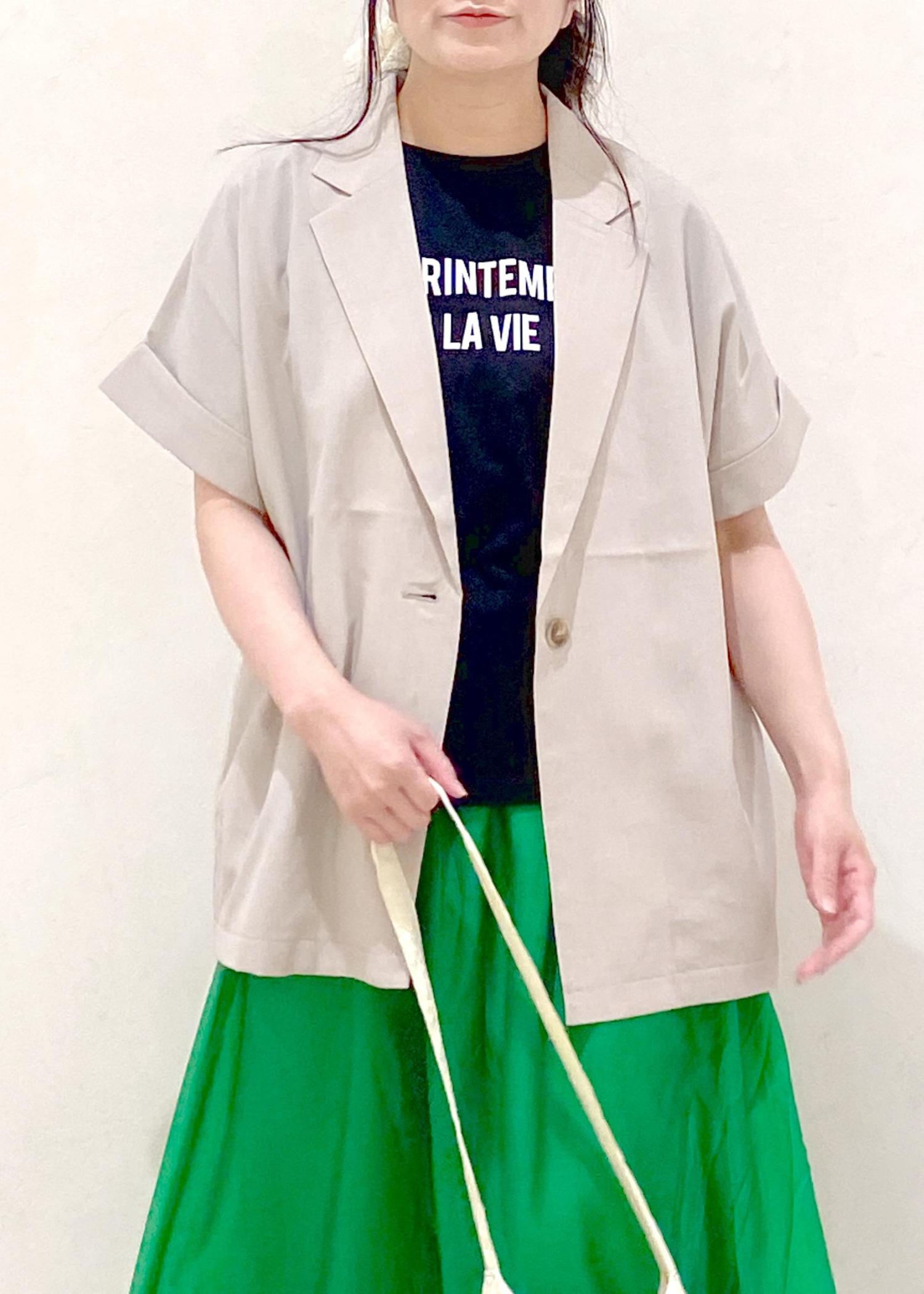 Tシャツだけより、ジャケット合わせにすることで、こなれ感がUP!気軽に行ける女子会にもおすすめ✨スカートでカラーを入れると更に華やかになります。