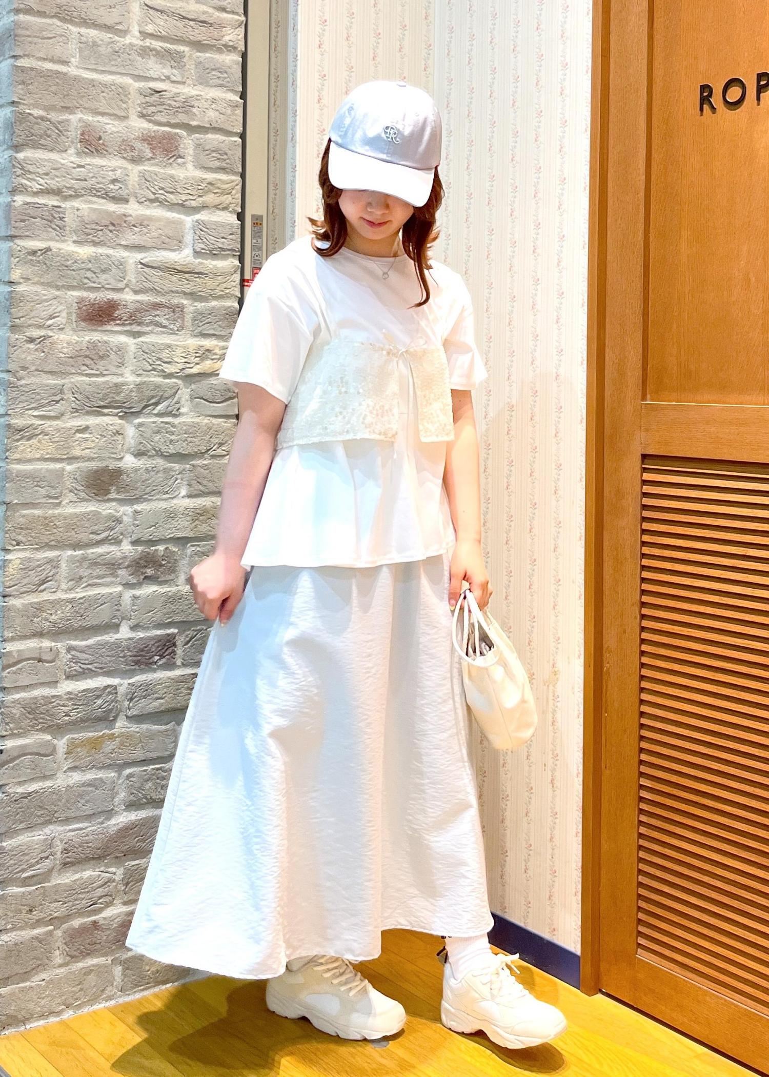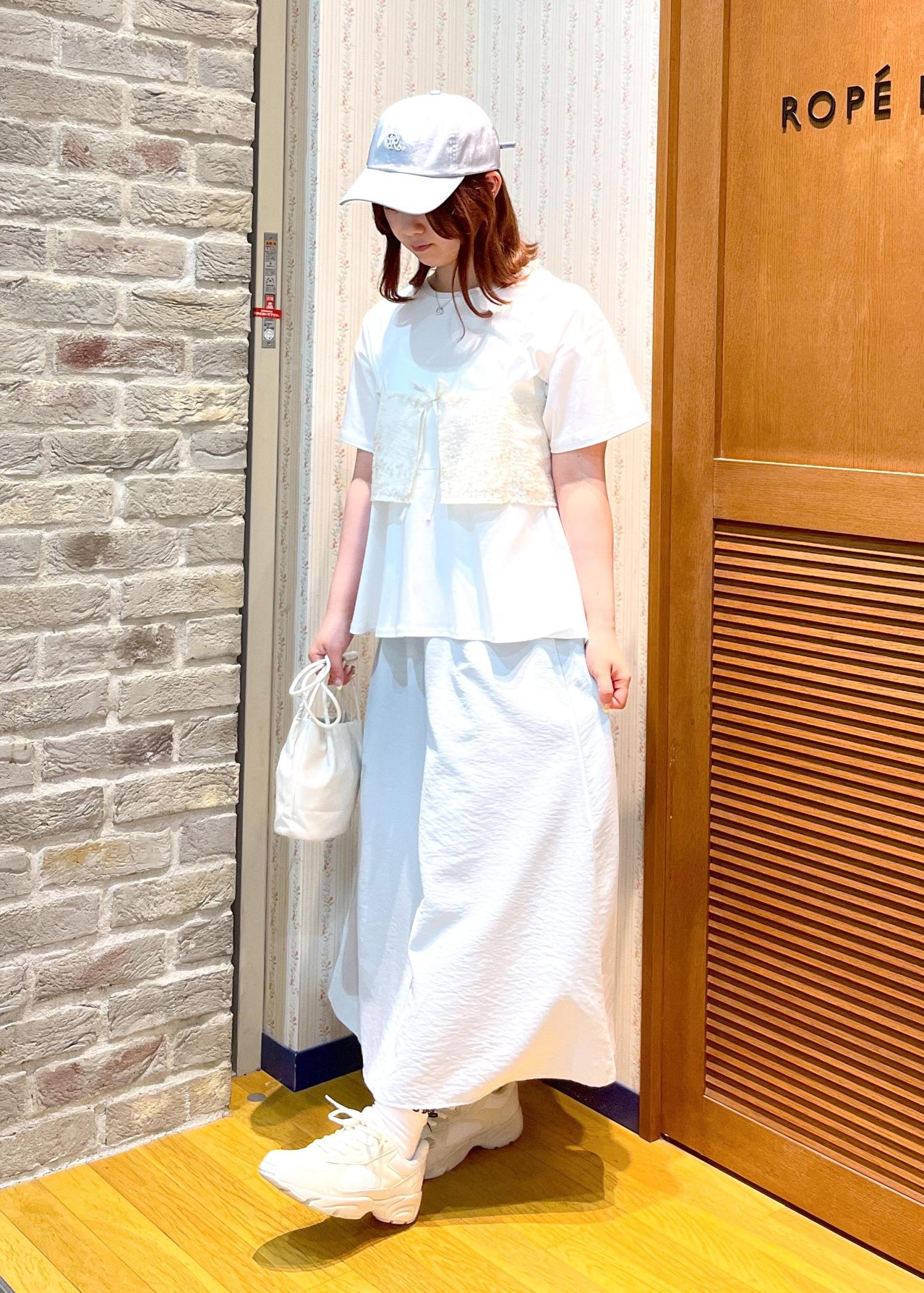 スカートに合わせてキャップも淡い青を選び、夏らしい涼しげなコーデを組みました♡
