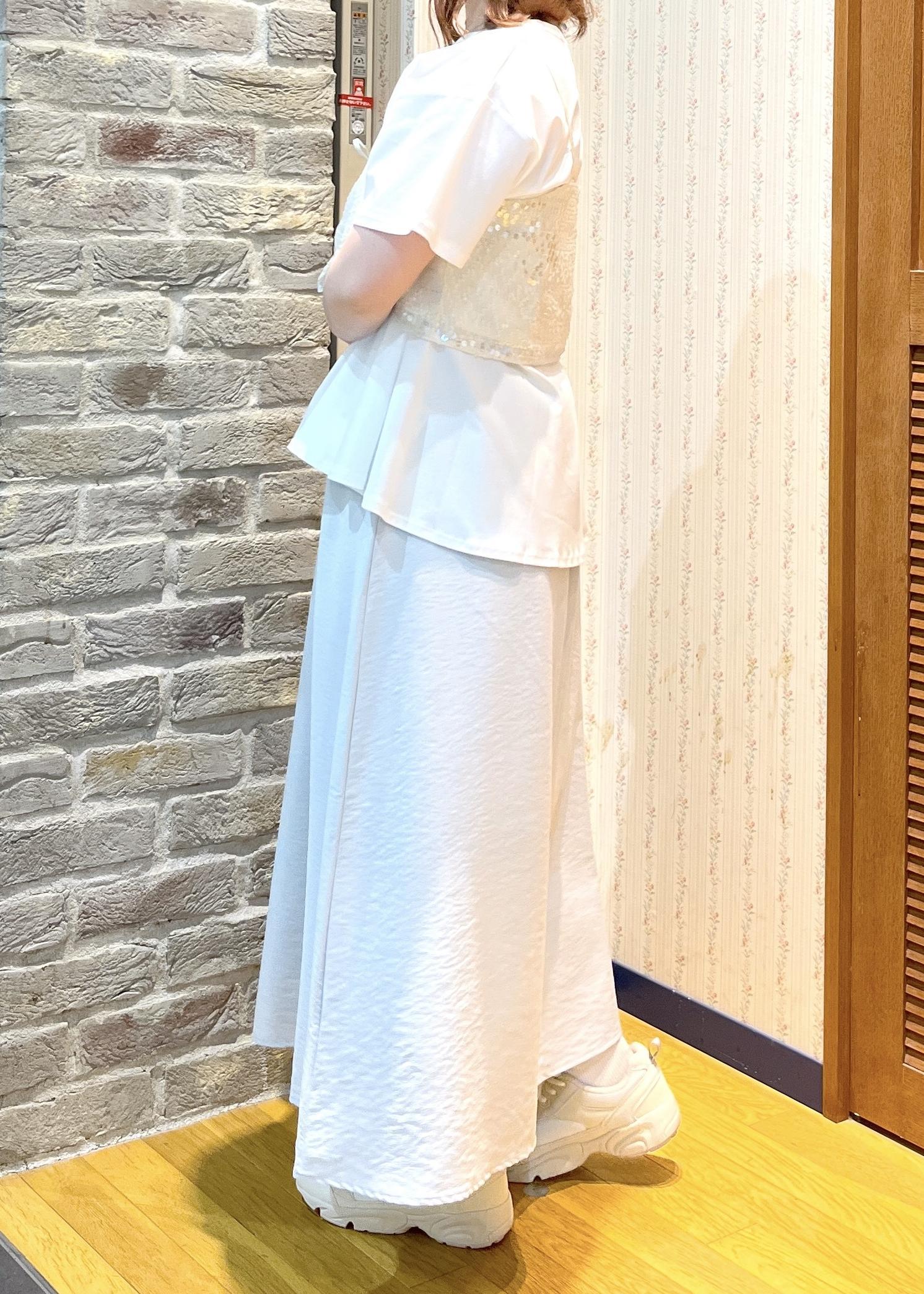 シンプルなペプラムトップスにスパンコールビスチェをあわせて華やかさをだしました◎