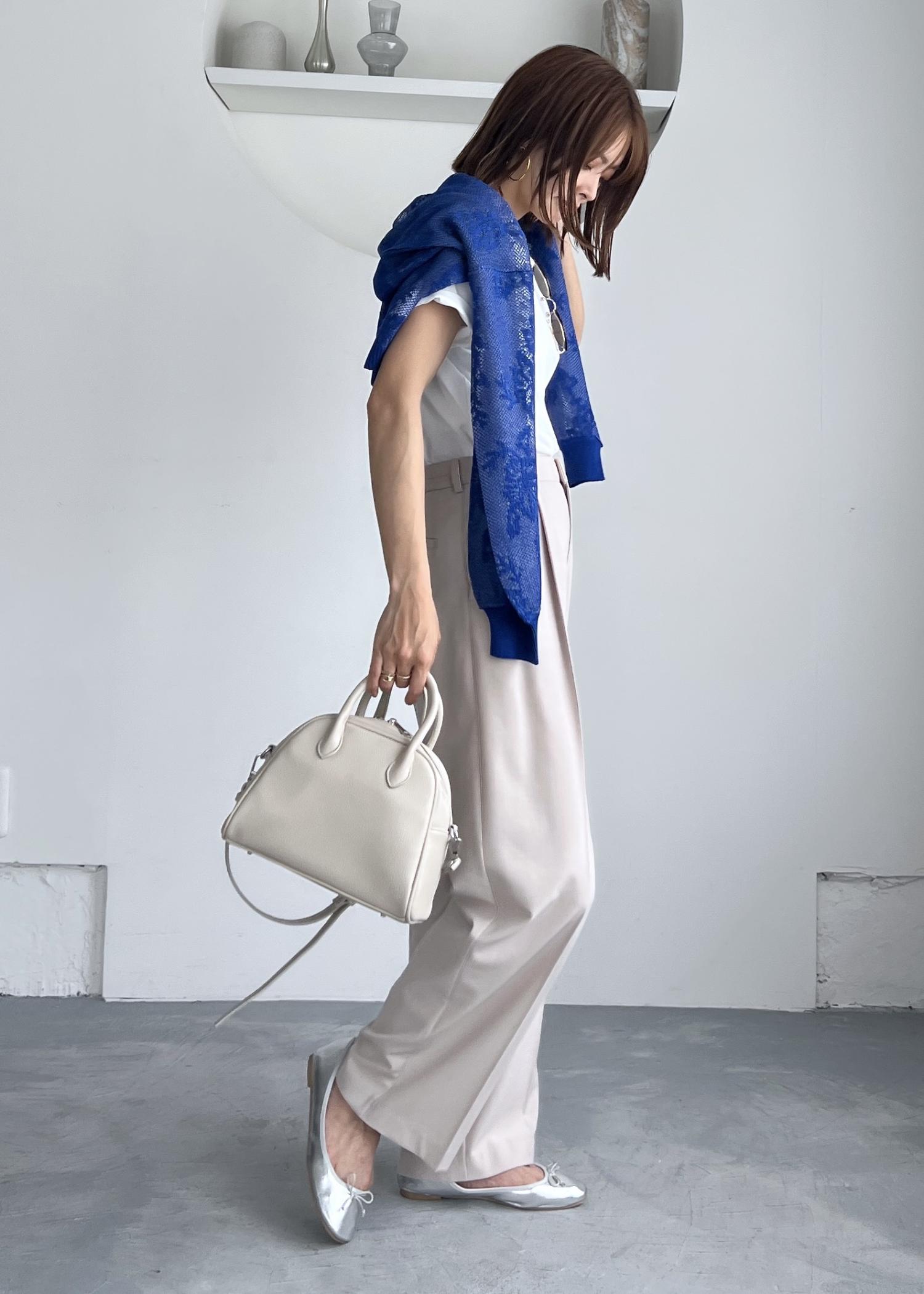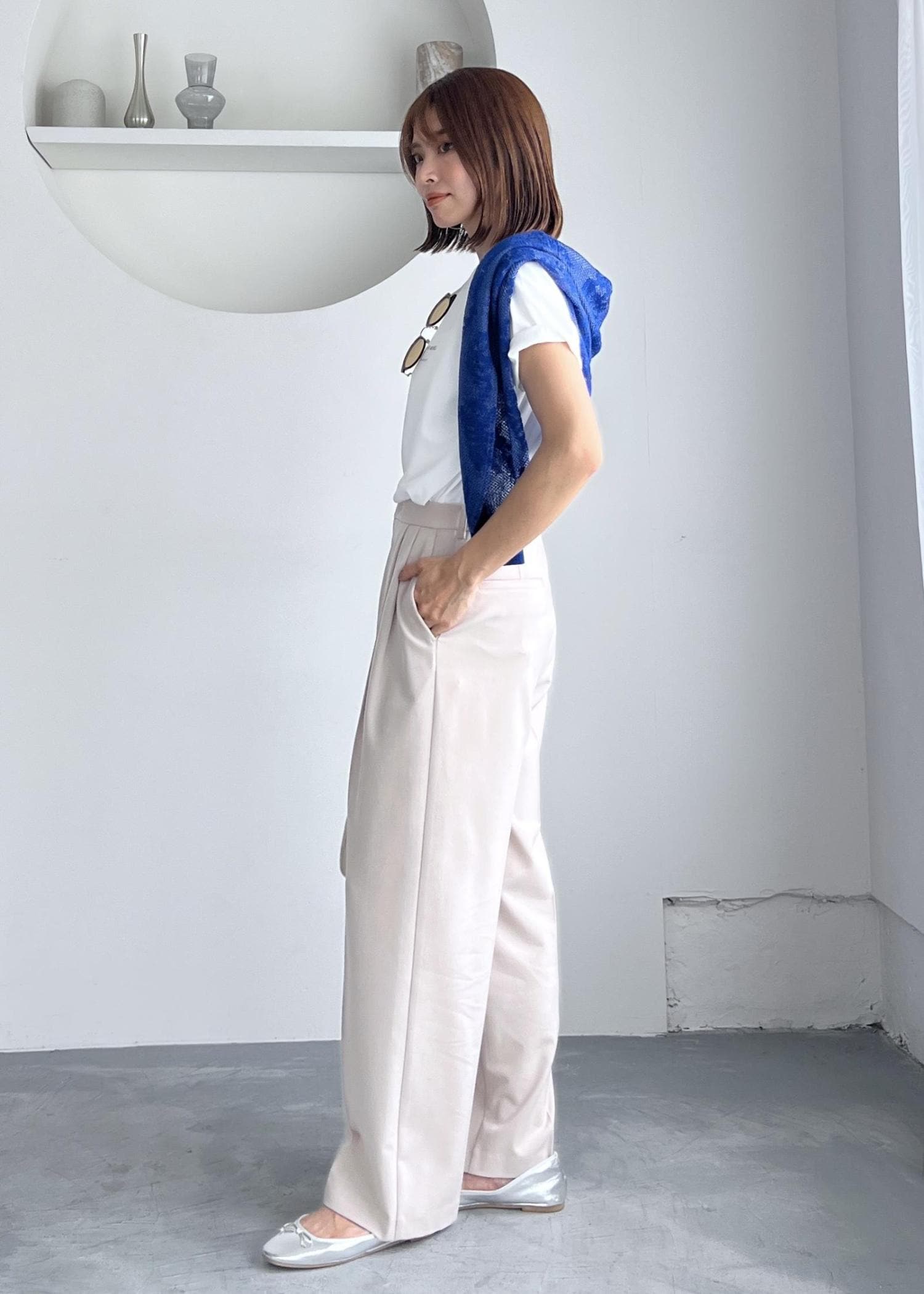 シンプルになりがちな白Tシャツは、ブルーのカーディガンを肩掛けしてコーデのアクセントにしました。
